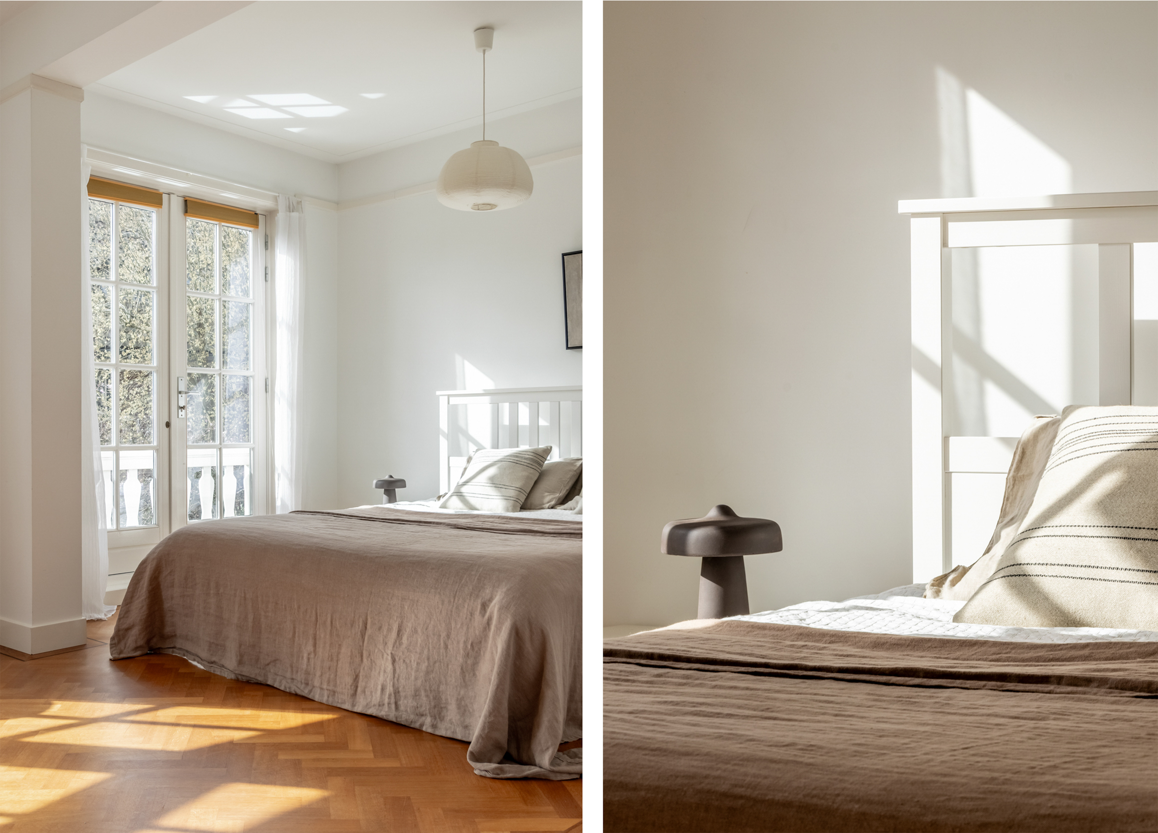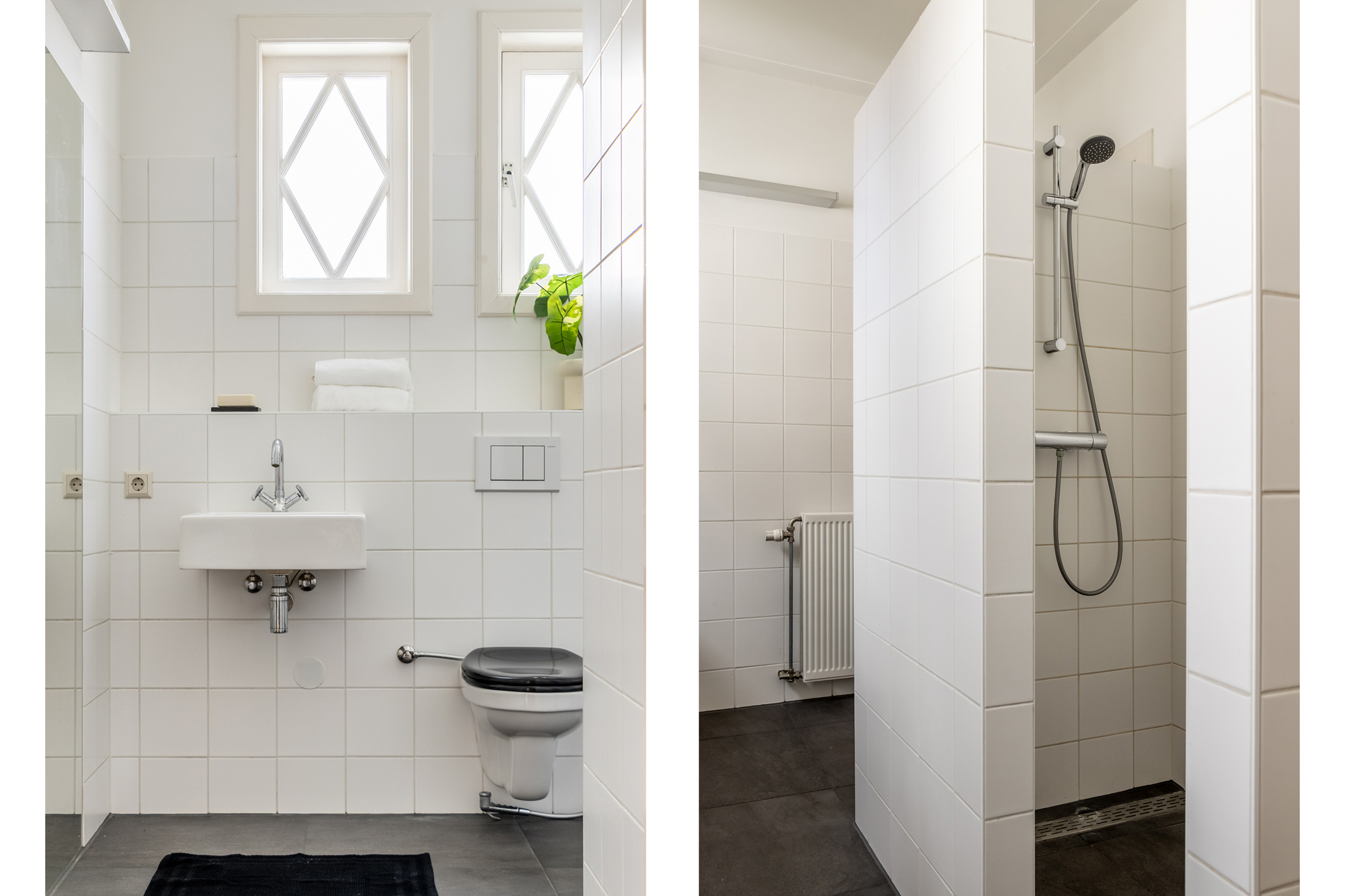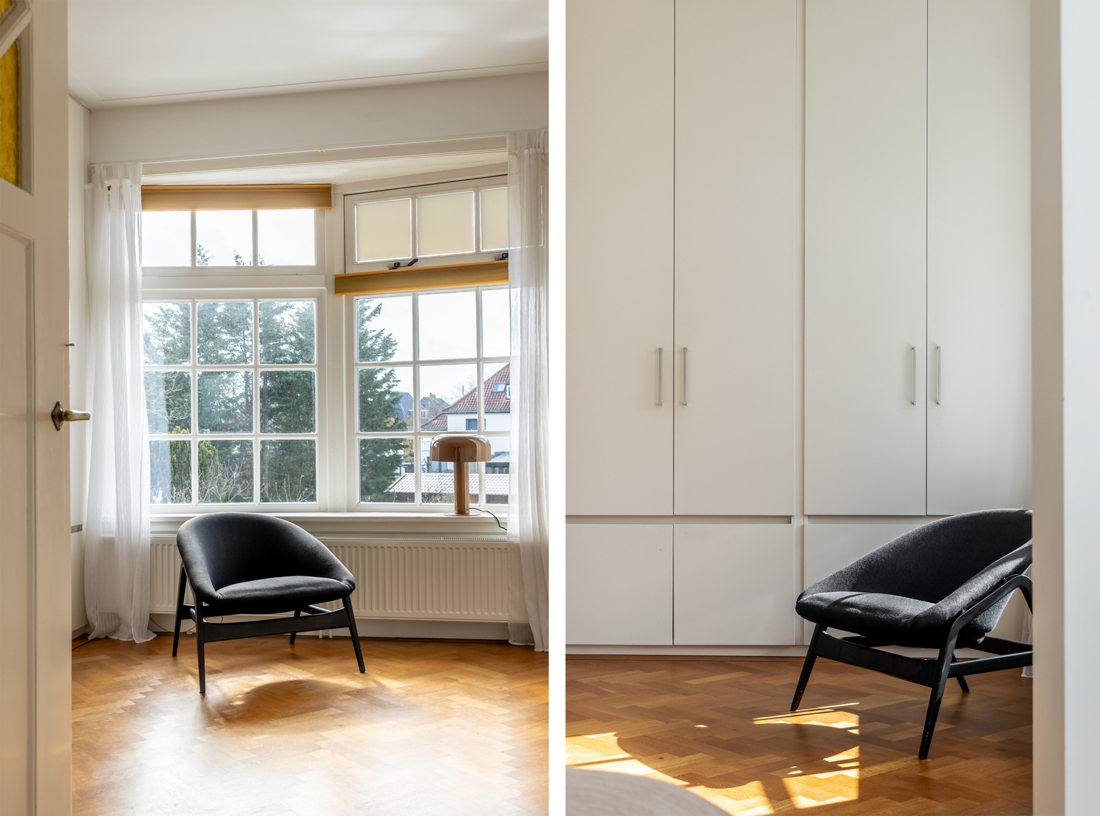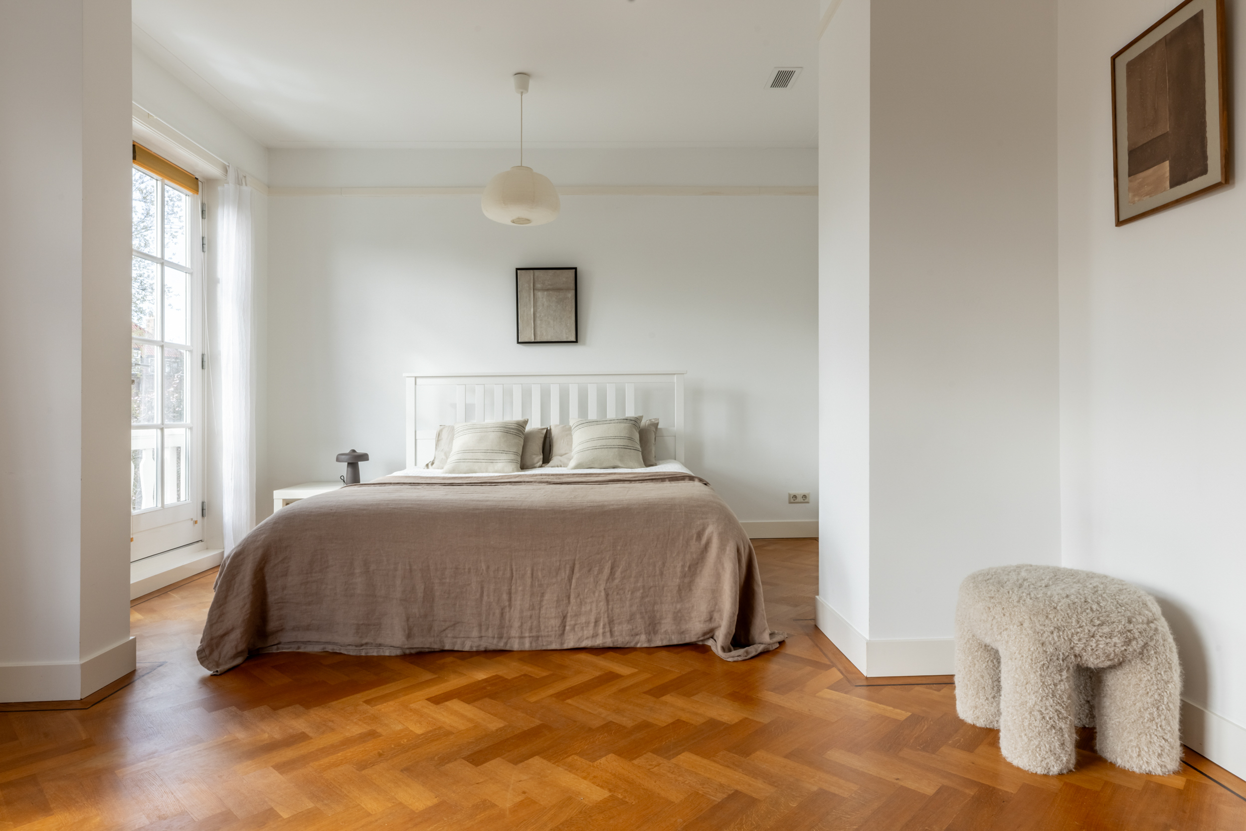 De trap heeft een dubbel bordes en komt uit op een ruime overloop met stijlvolle schouw. De eerste verdieping is geheel voorzien van visgraat parketvloer. Vanuit de overloop toegang tot de kamers. De voorslaap- werkkamer met schouw, erker en inbouwkast. De royale achterslaapkamer (voorheen 2 kamers) met erker, kastenwand en openslaande deuren naar frans balkon (ZW), tussenliggende moderne ruime badkamer met inloopdouche, 2e toilet (zwevend), wastafel en wasmachine/droger aansluiting en CV-ketel.