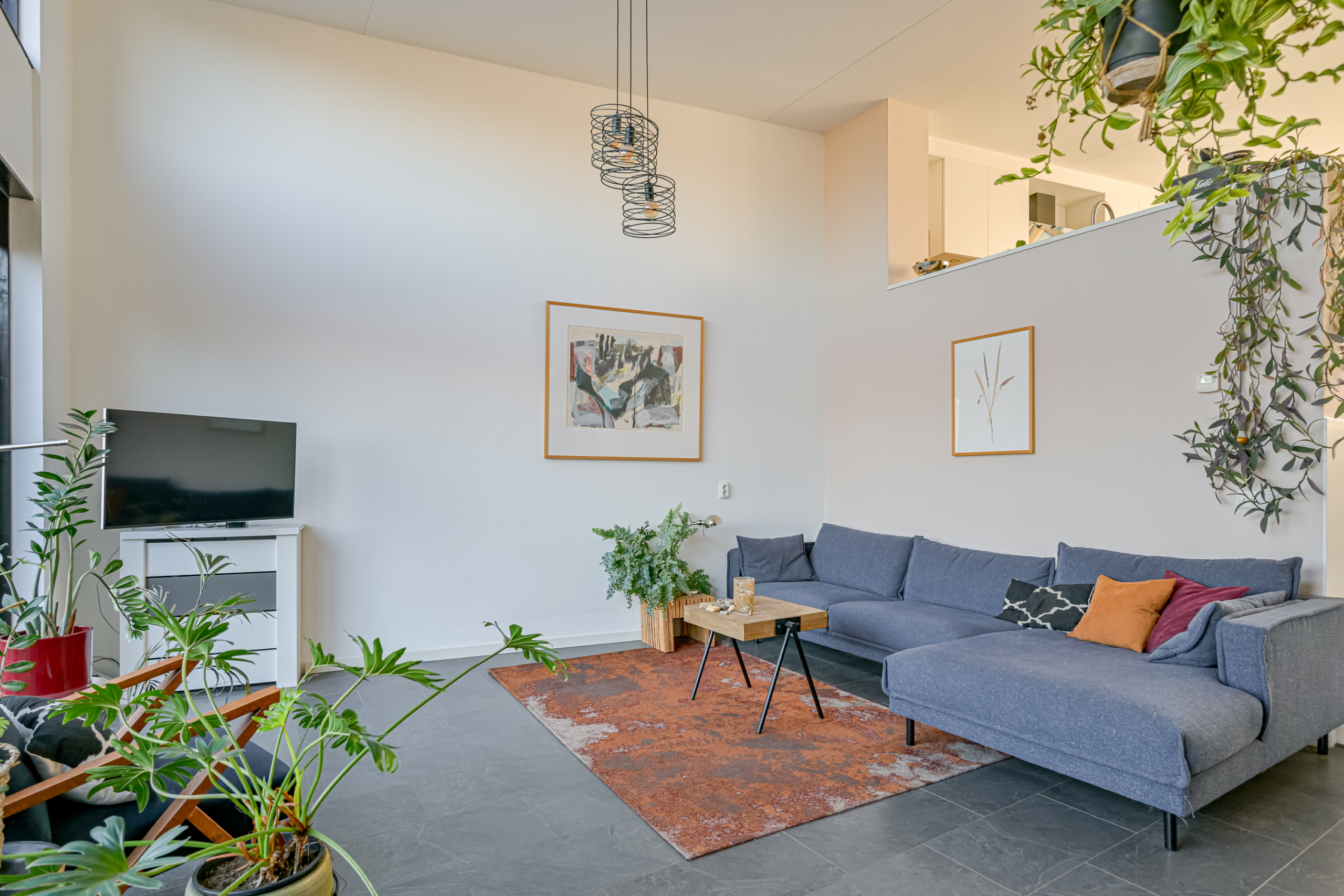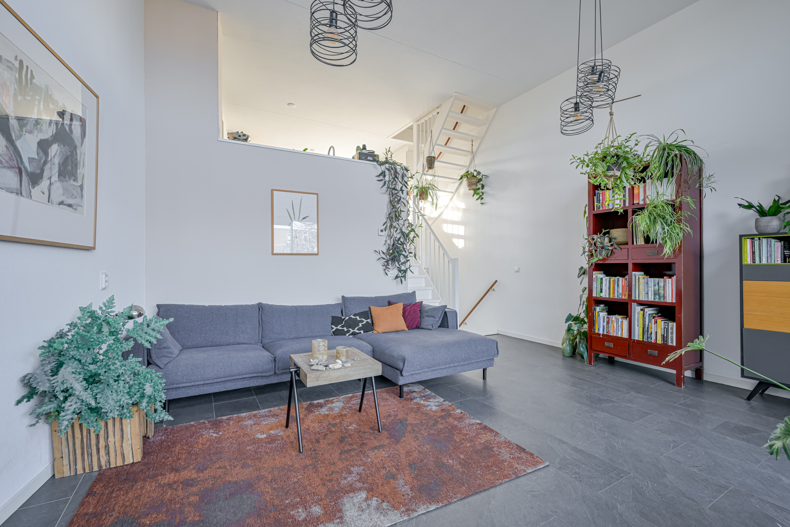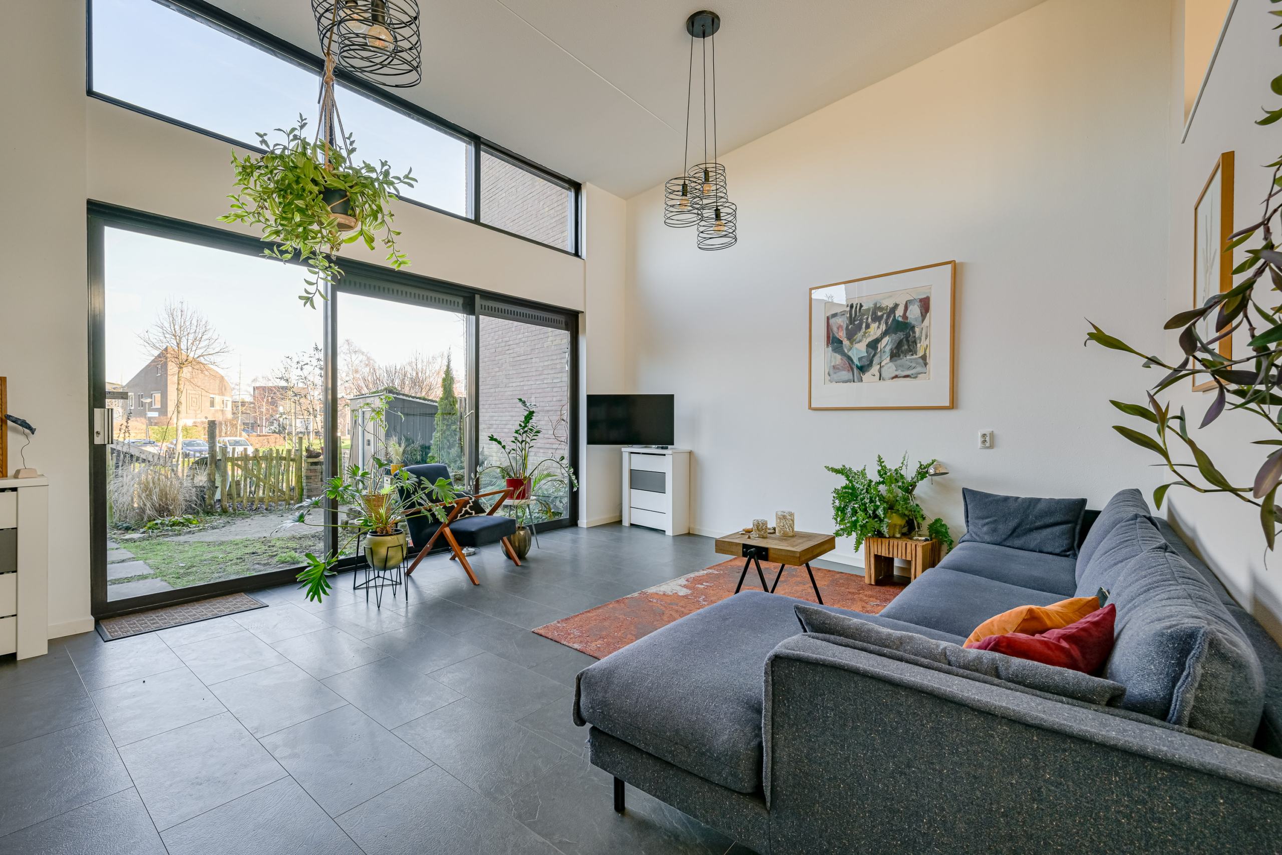 De woonkamer springt direct in het oog door het 3,75 meter hoge plafond en de grote raampartij met schuifdeur naar de tuin. Hierdoor geniet je de hele dag van een prachtige lichtinval en vrij uitzicht op de tuin.