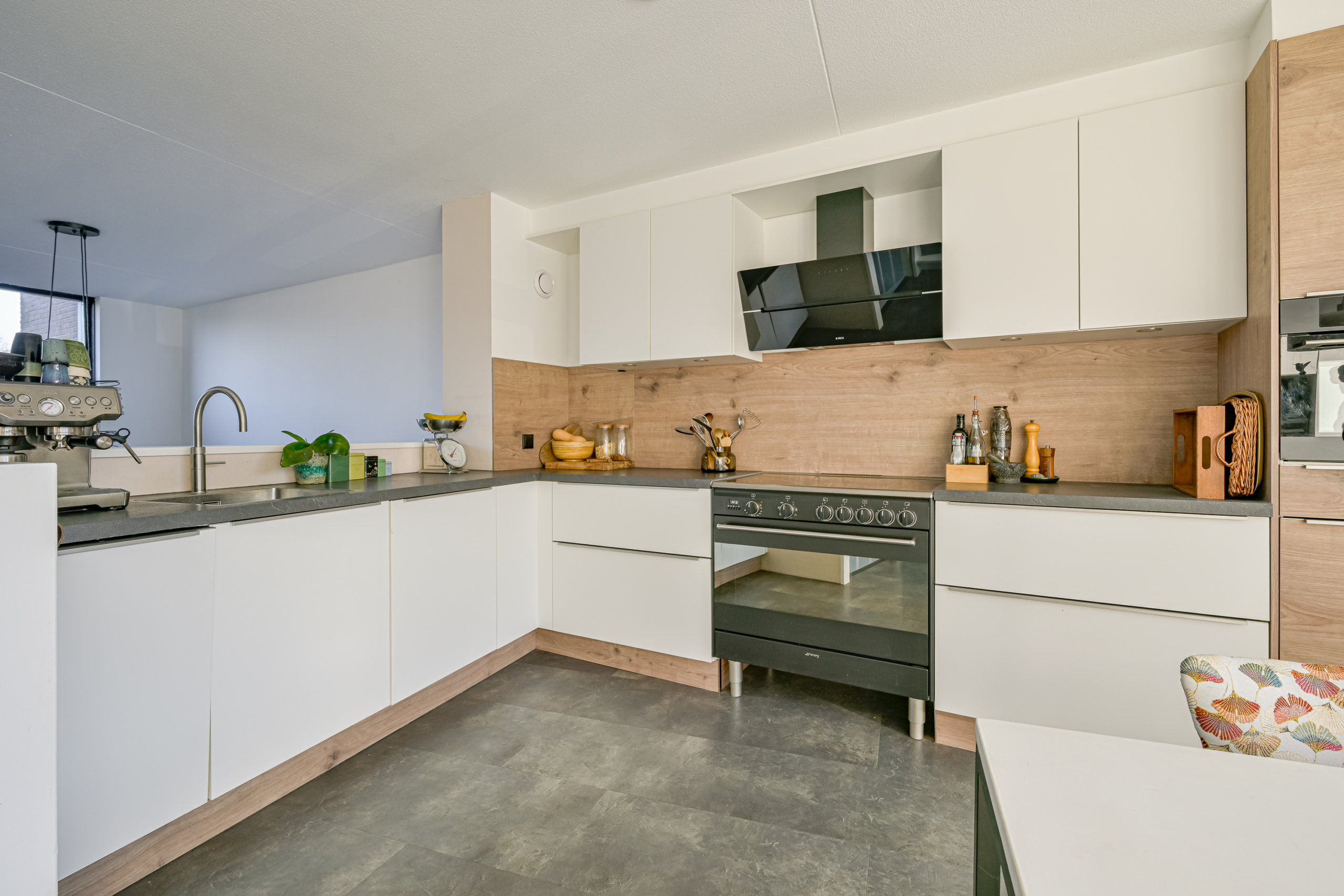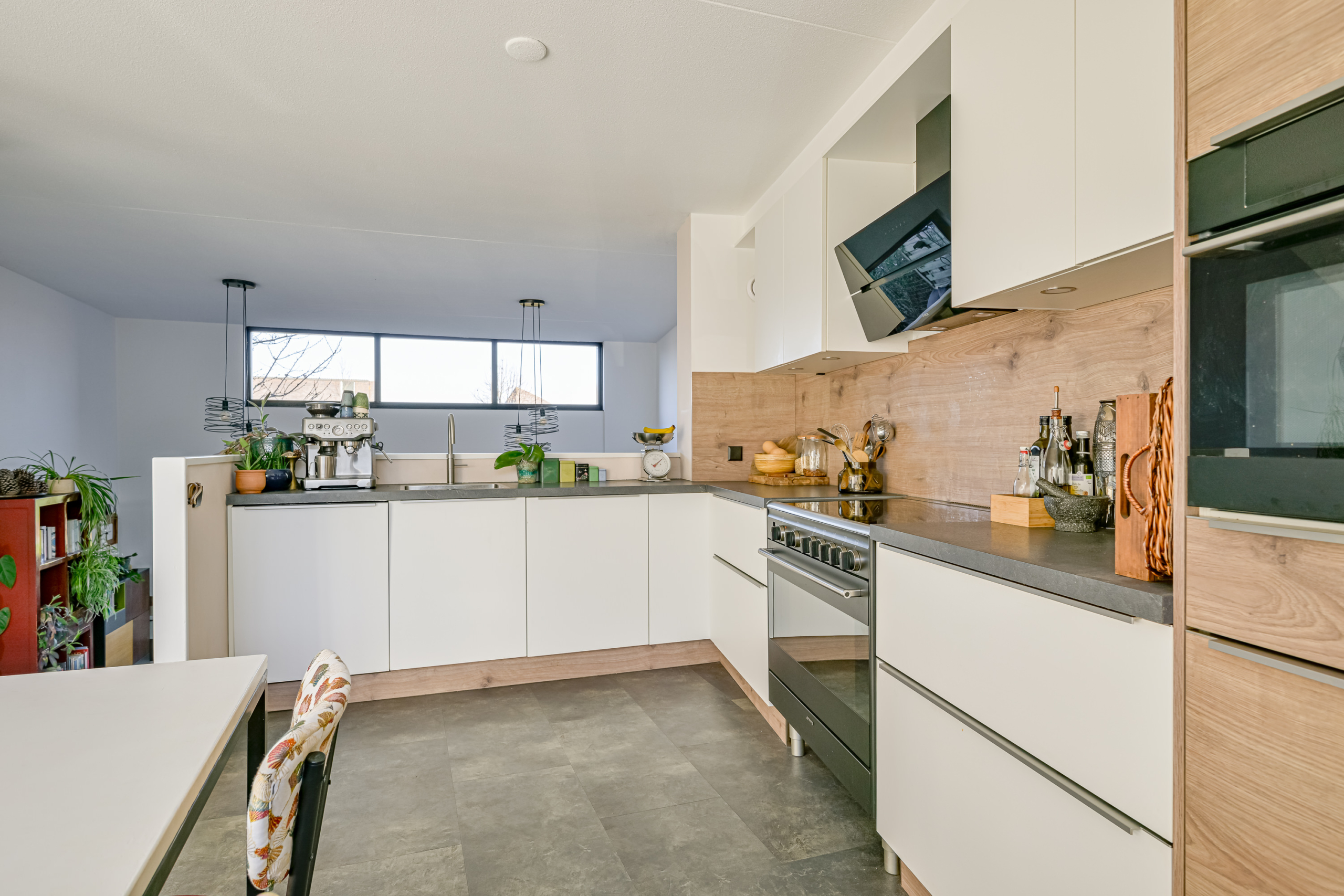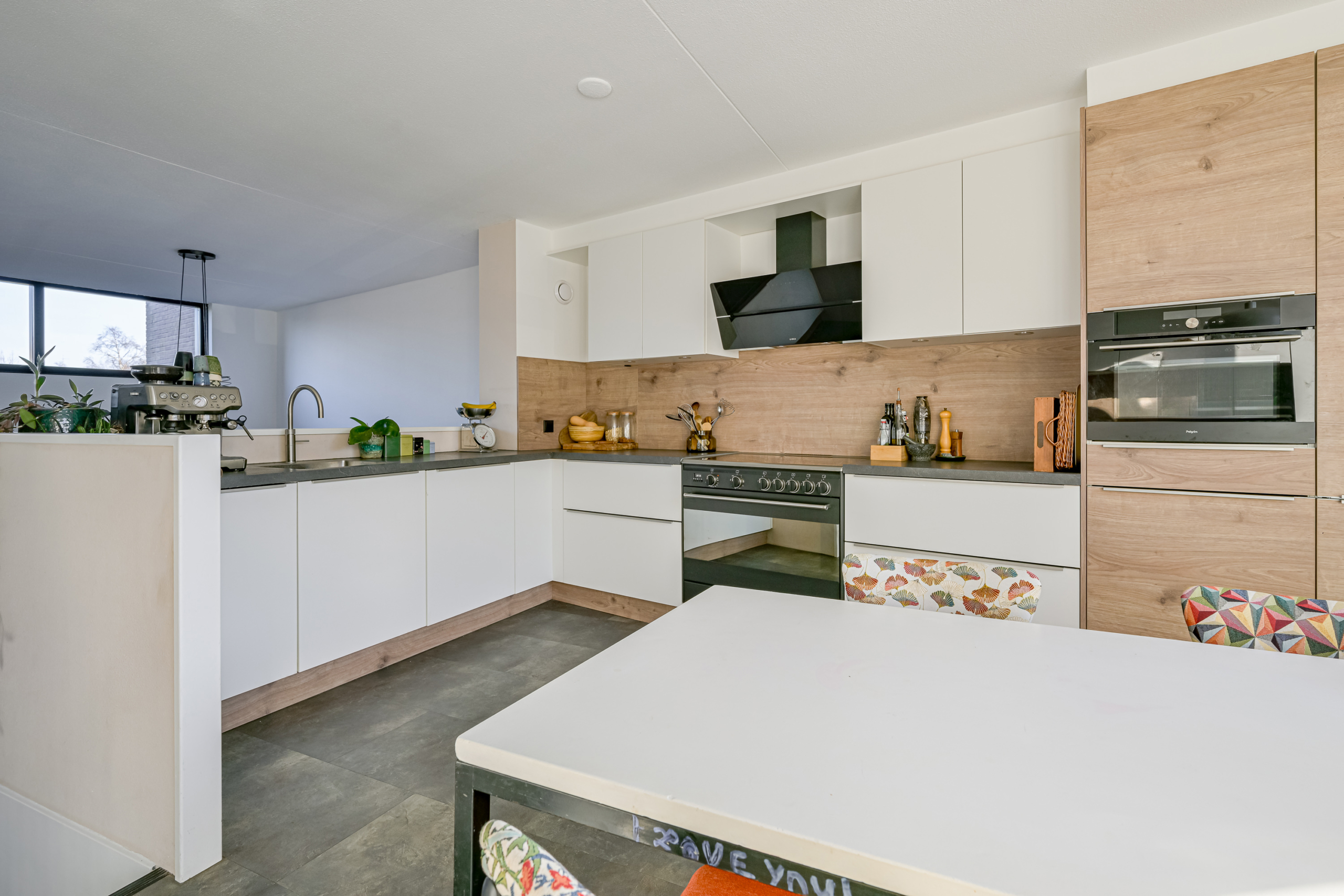 De woonkeuken (2019) is ruim opgezet en uitgevoerd in een moderne wit-houtlook. Dankzij de hoekopstelling en extra kastruimte met werkblad aan de tegenoverliggende zijde heb je hier enorm veel kastruimte en is dit een fijne plek om samen te koken, eten en leven. De keuken is luxe en compleet uitgerust met o.a. een Quooker, een groot kooktoestel met inductiekookplaat en brede oven, een magnetron met ovenfunctie (2e oven!), vaatwasser en een nieuwe koelkast (2025).