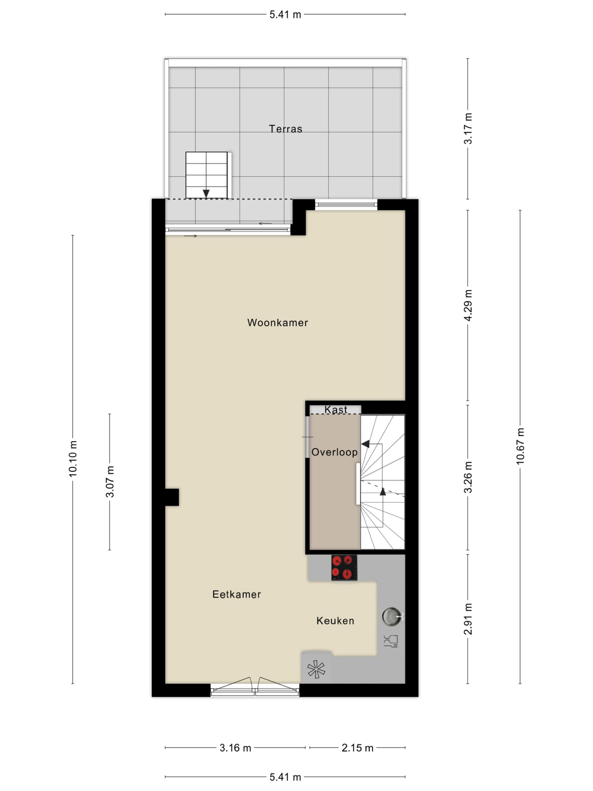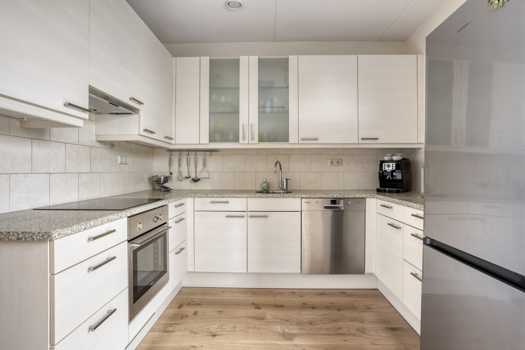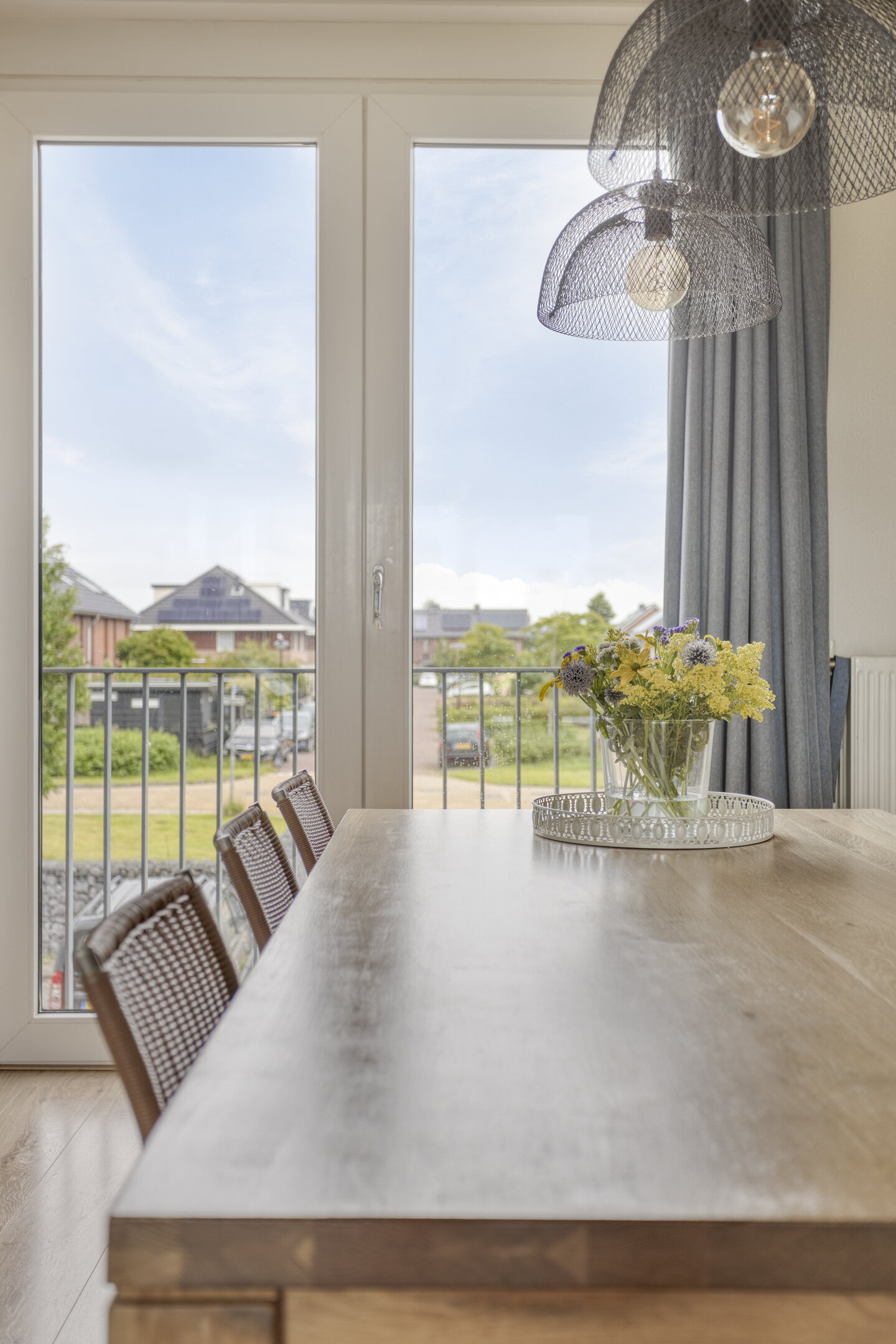 De eerste verdieping is het hart van het huis. Hier vind je een ruime woonkamer met grote raampartijen aan beide zijden, wat zorgt voor veel lichtinval en een gevoel van ruimte. De afwerking is keurig en neutraal, met lichte wanden en een nette laminaatvloer als tijdloze basis voor je eigen inrichting. De open keuken bevindt zich aan de voorzijde en is uitgerust met diverse inbouwapparatuur. Door de ruime opzet is er voldoende plek voor een eettafel. De dubbele openslaande deuren geven toegang tot een Frans balkon, perfect om even een raam open te zetten of te genieten van het vrije uitzicht.