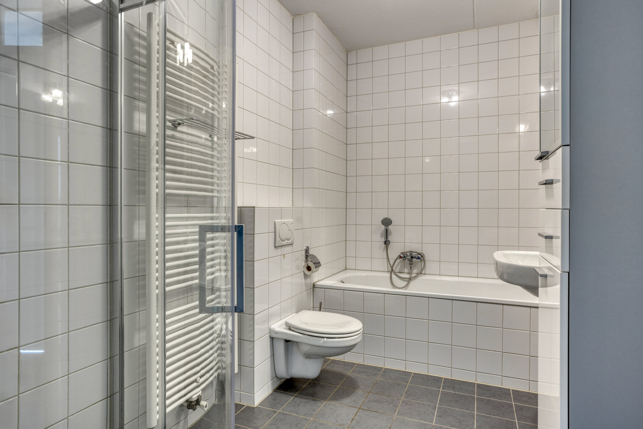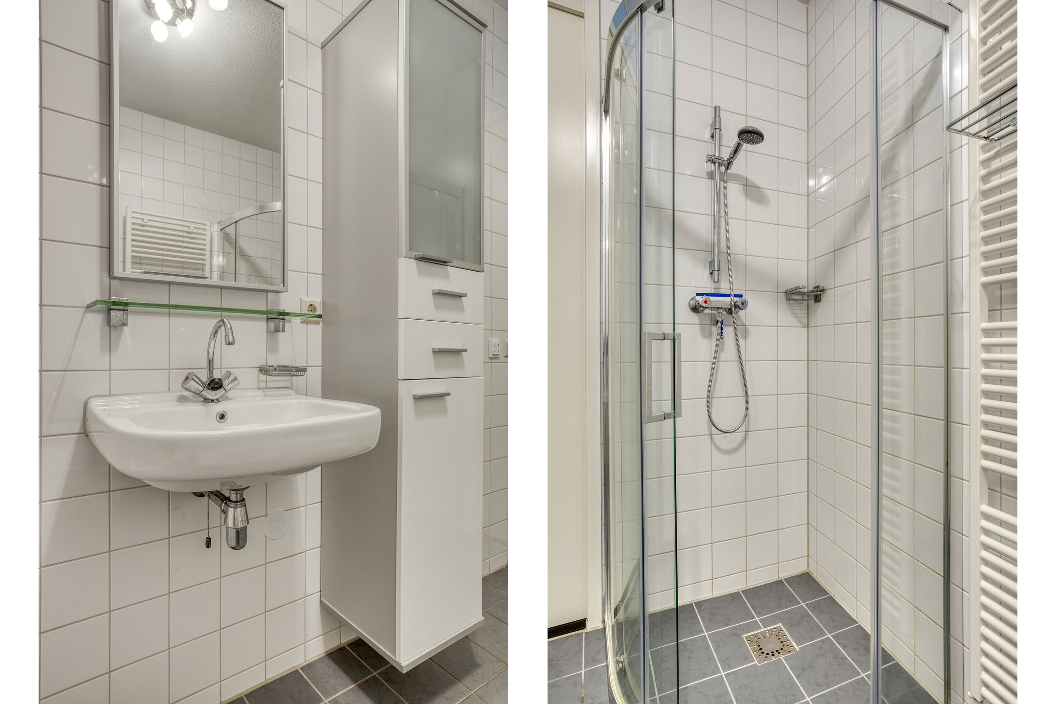De badkamer is ruim en compleet: voorzien van een ligbad, douche, toilet, wastafel en een designradiator. Een fijne plek om de dag ontspannen te beginnen of juist af te sluiten.