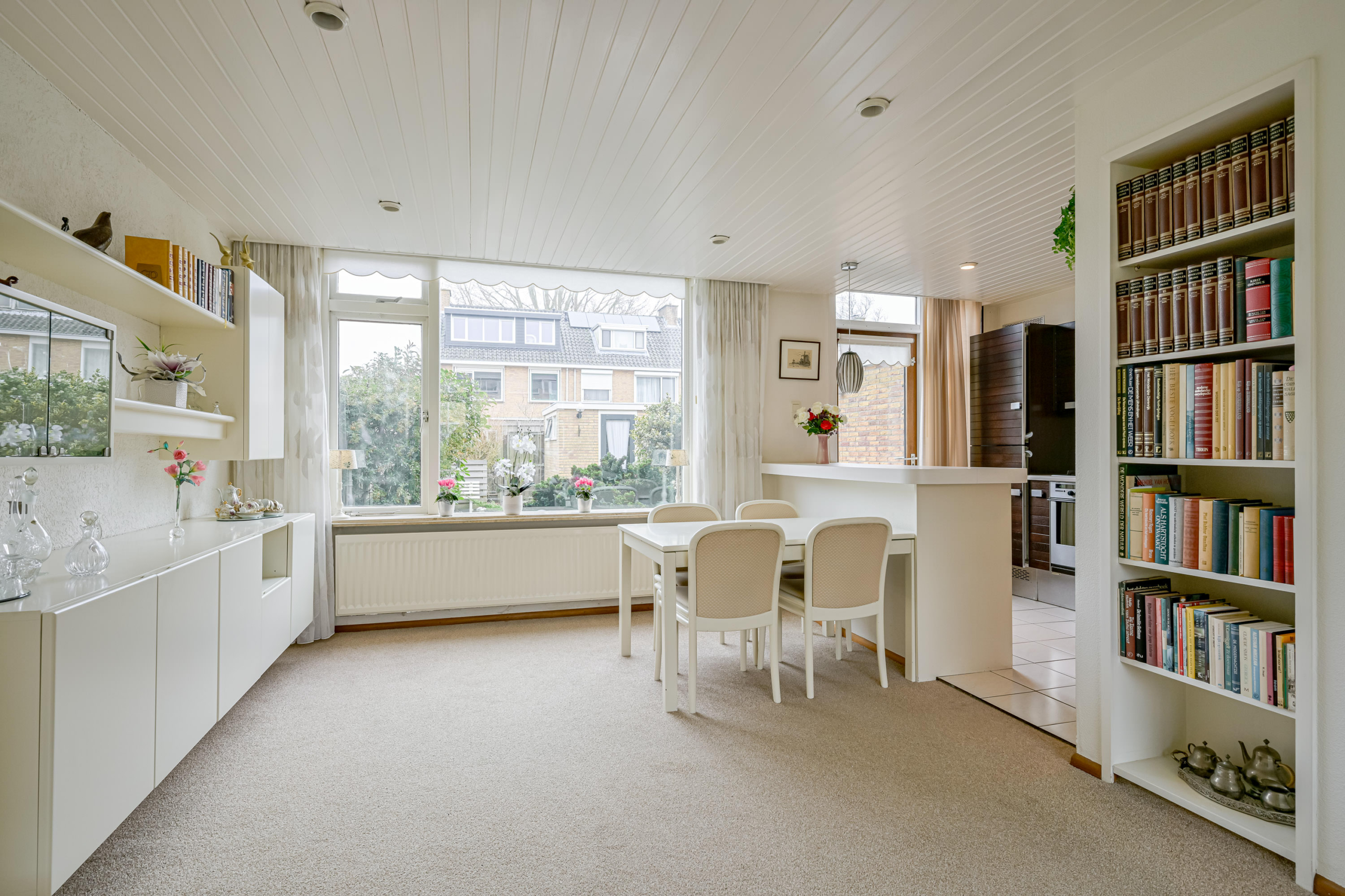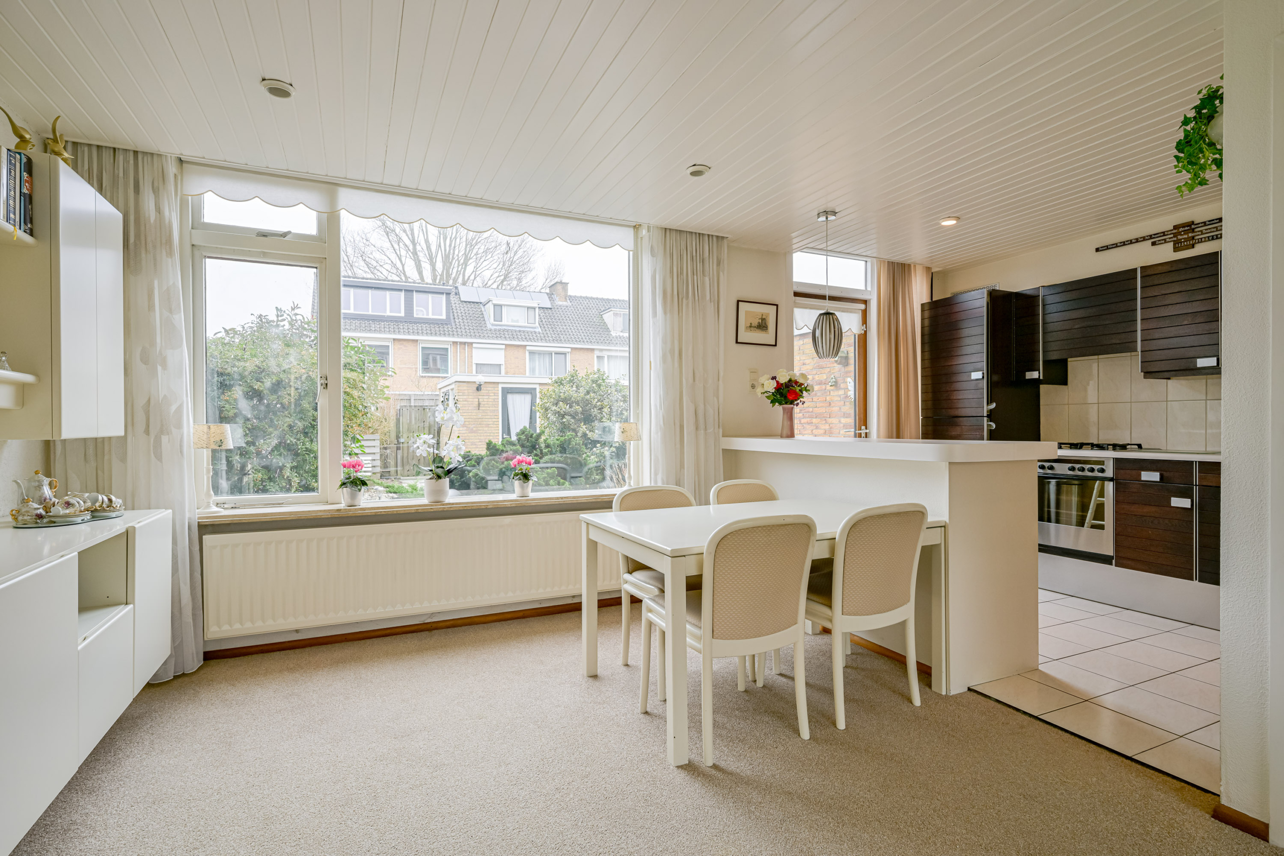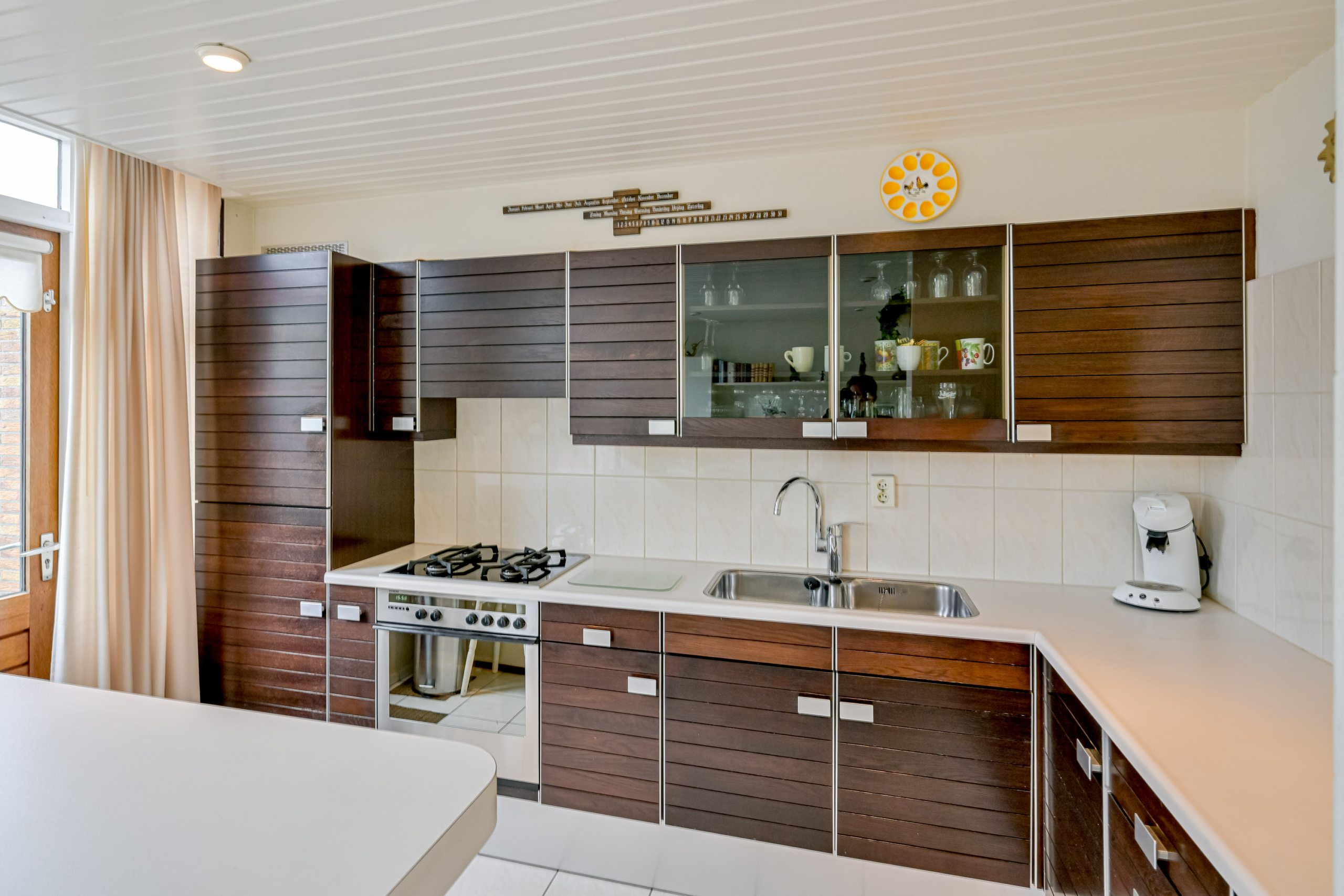 De verrassend ruime en lichte woonkamer met open keuken heeft een totale oppervlakte van circa 34,5 m² en is praktisch ingedeeld. Het zitgedeelte met haardpartij bevindt zich aan de voorzijde, terwijl de eethoek aan de tuinzijde ligt. De keukenruimte is middels een bargedeelte afgescheiden van de woonkamer. De keukeninrichting is op leeftijd maar deze Poggenpohl hoekkeuken is dan ook van een onverwoestbare kwaliteit. De keuken is voorzien van een wit gelamineerd werkblad met dubbele spoelbak, een inbouw koel-/vriescombinatie, 4-pits gaskookplaat, oven en wasemkap.