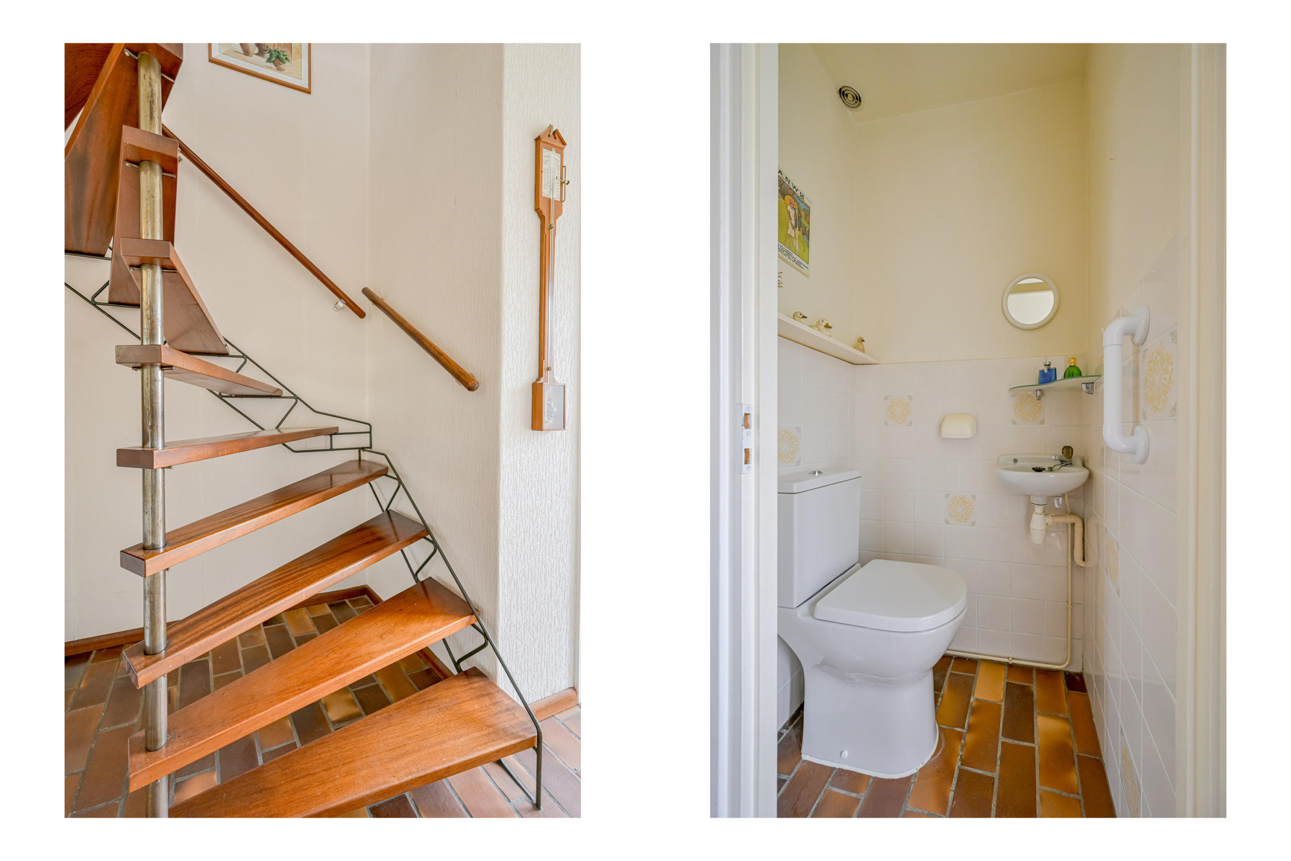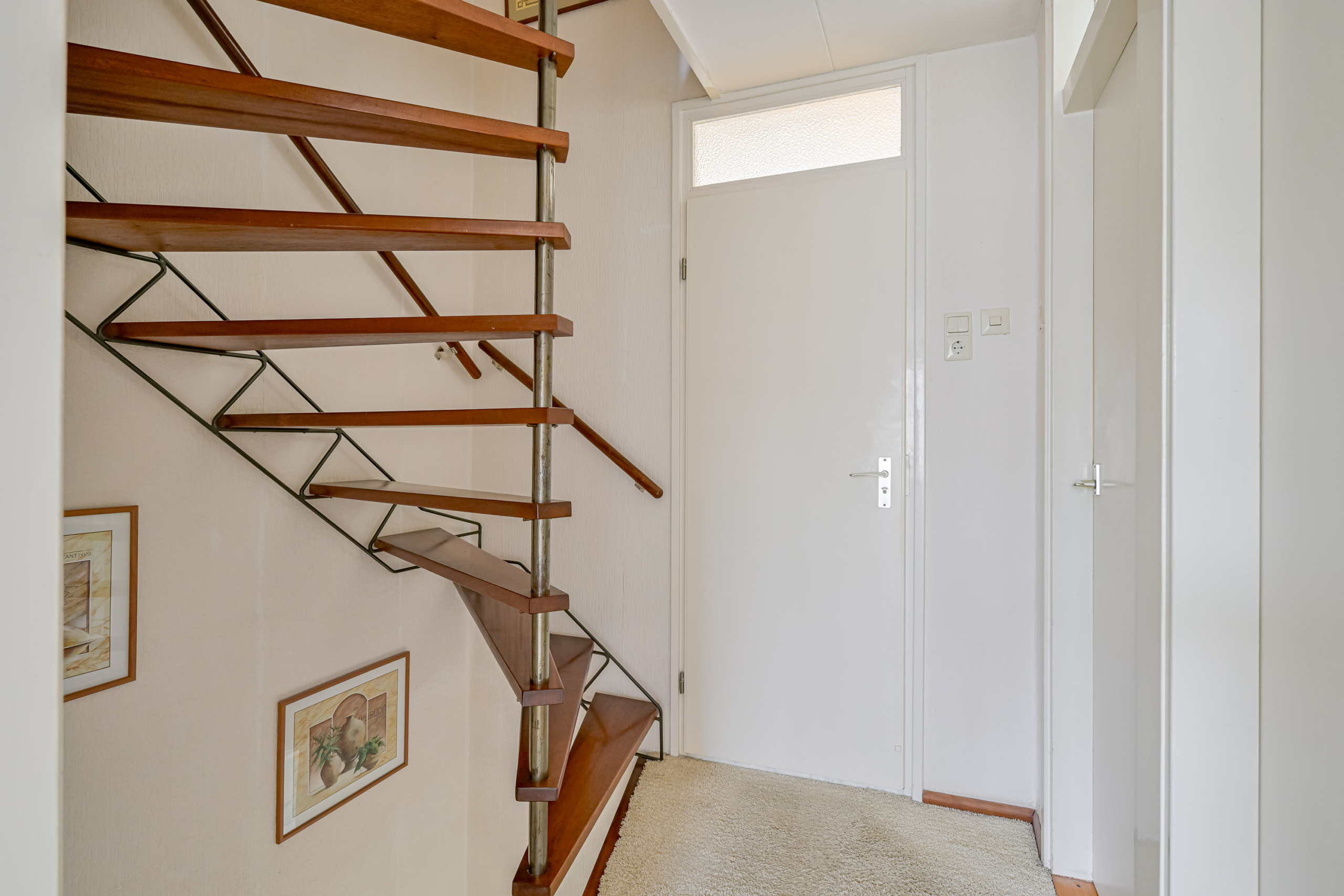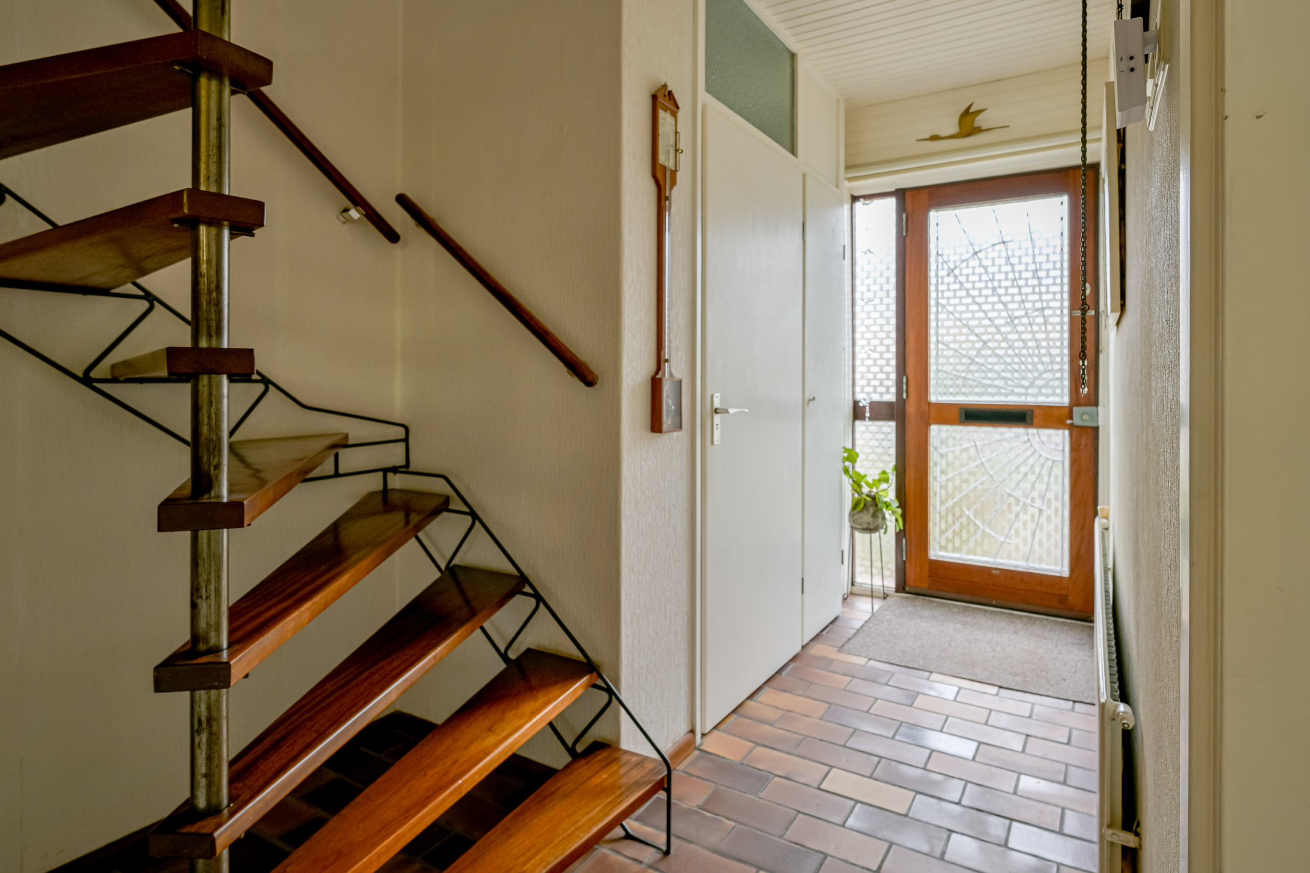 Via de voortuin bereik je de entree met naast de voordeur de meterkast. In de hal bevinden zich een bergkast, het toilet met fonteintje en de trap naar de eerste verdieping.