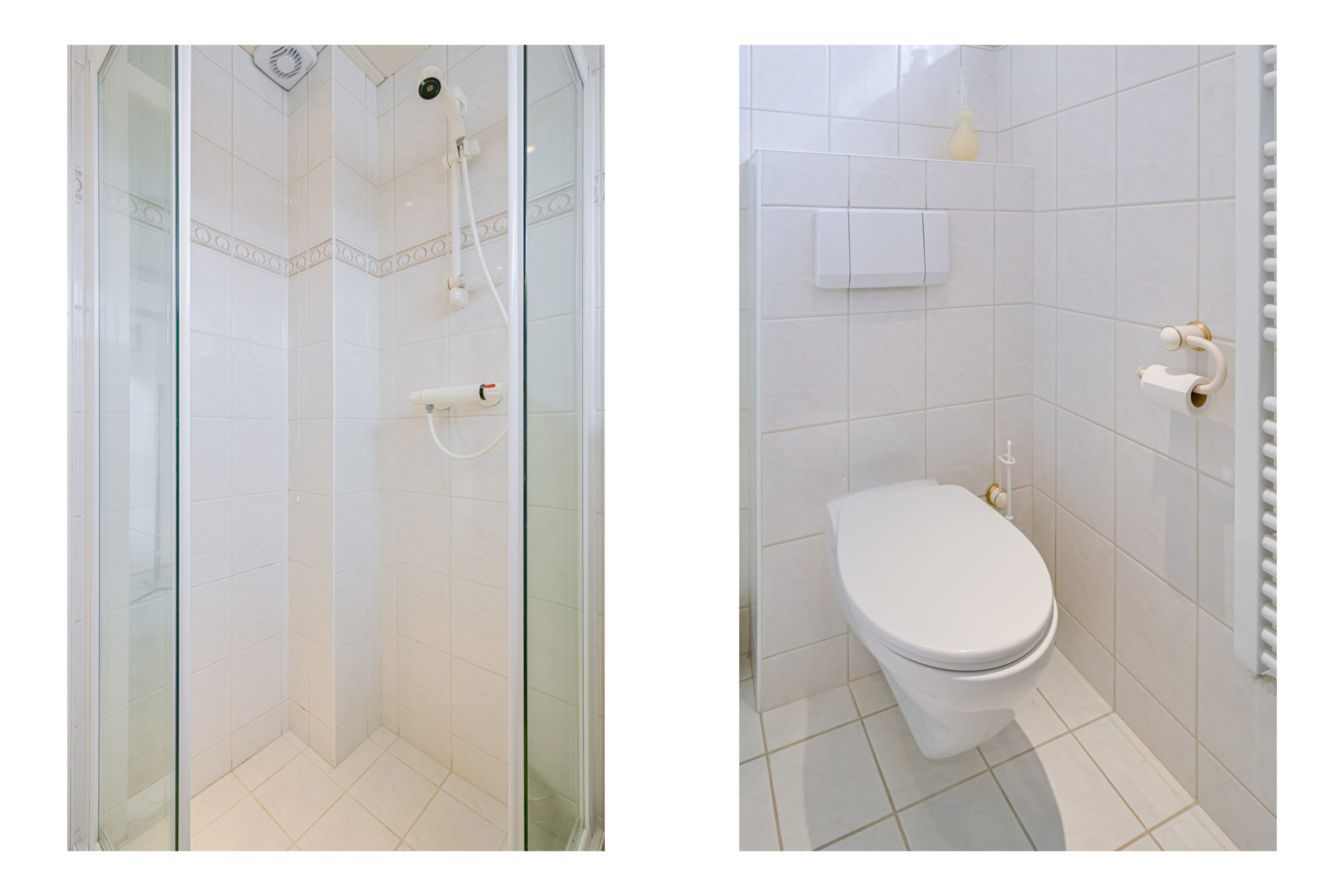 De badkamer is efficiënt ingedeeld met een inloopdouche met schuifdeuren, een wandcloset, een wastafelmeubel met enkele wastafel en spiegelkast alsmede een handdoekradiator en aansluitpunt voor een wasmachine. De badkamer is verder voorzien van een raam voor daglichttoetreding en ventilatie alsmede mechanische ventilatie ter plaatse van de douche.