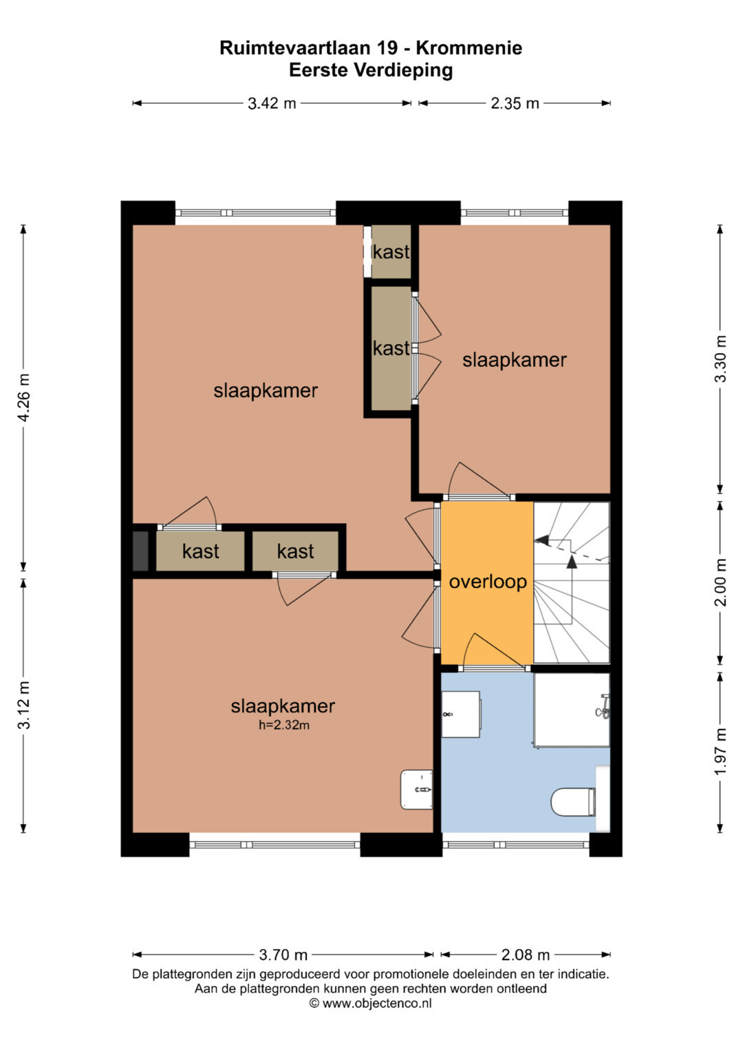 Op de eerste verdieping bevinden zich twee ruime 2-persoons slaapkamers met vaste kasten en een derde 1-persoons slaapkamer