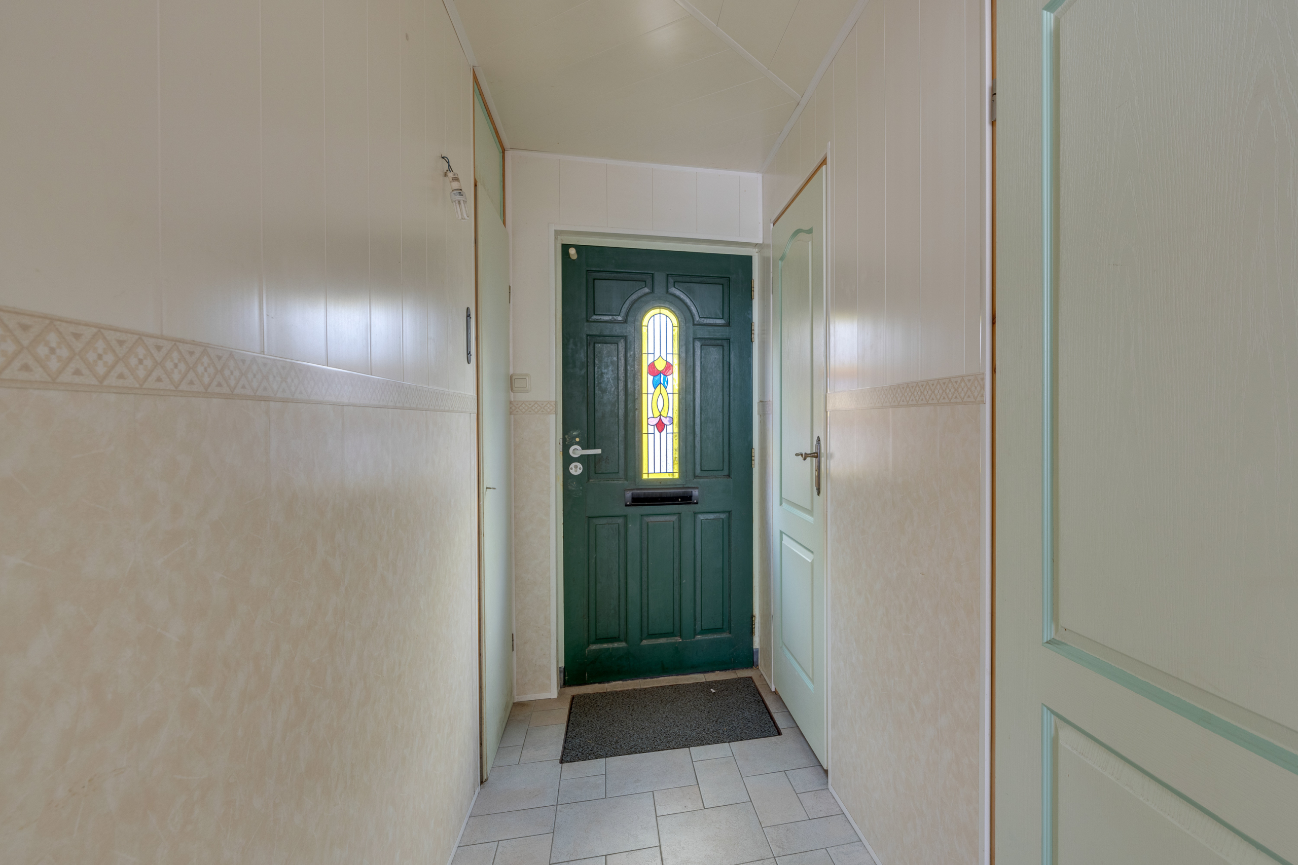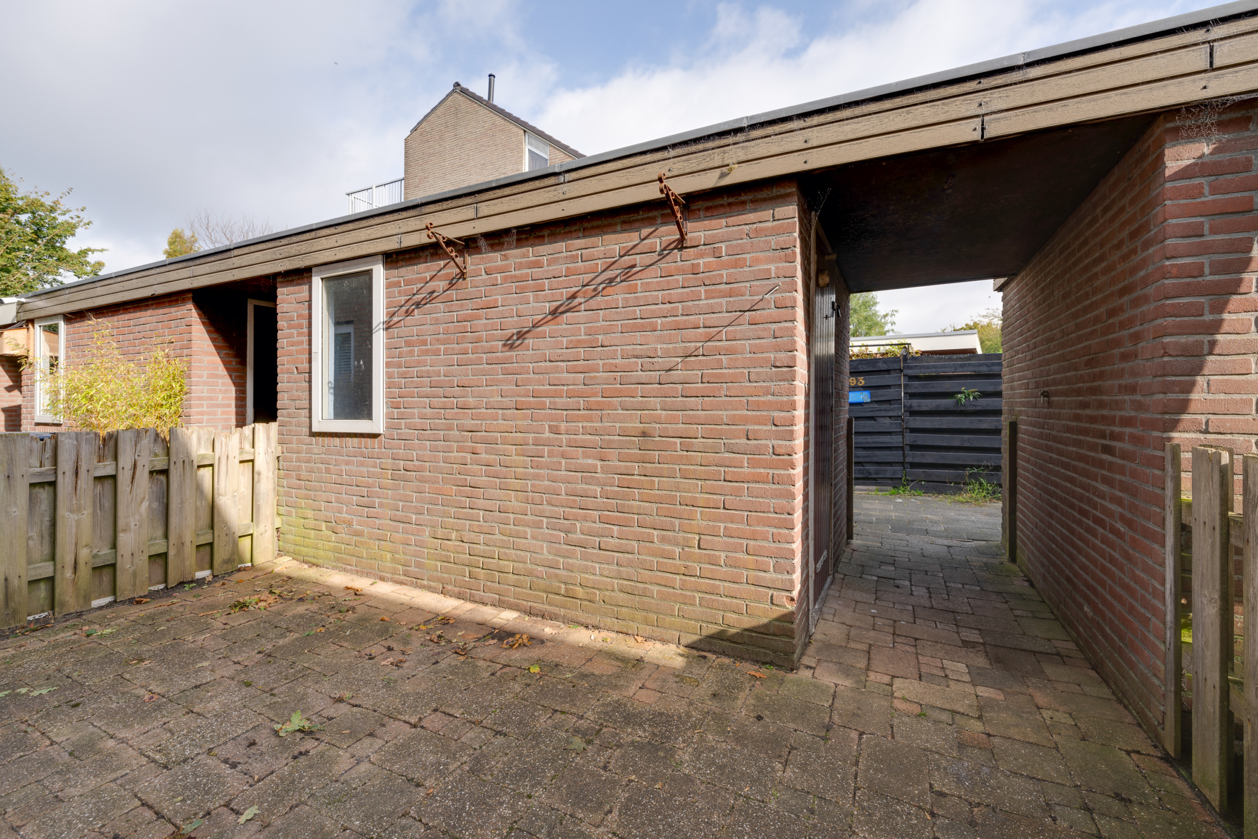 De stenen (fietsen)berging aan de voorzijde van de woning is geschakeld met die van beide naaste buren.