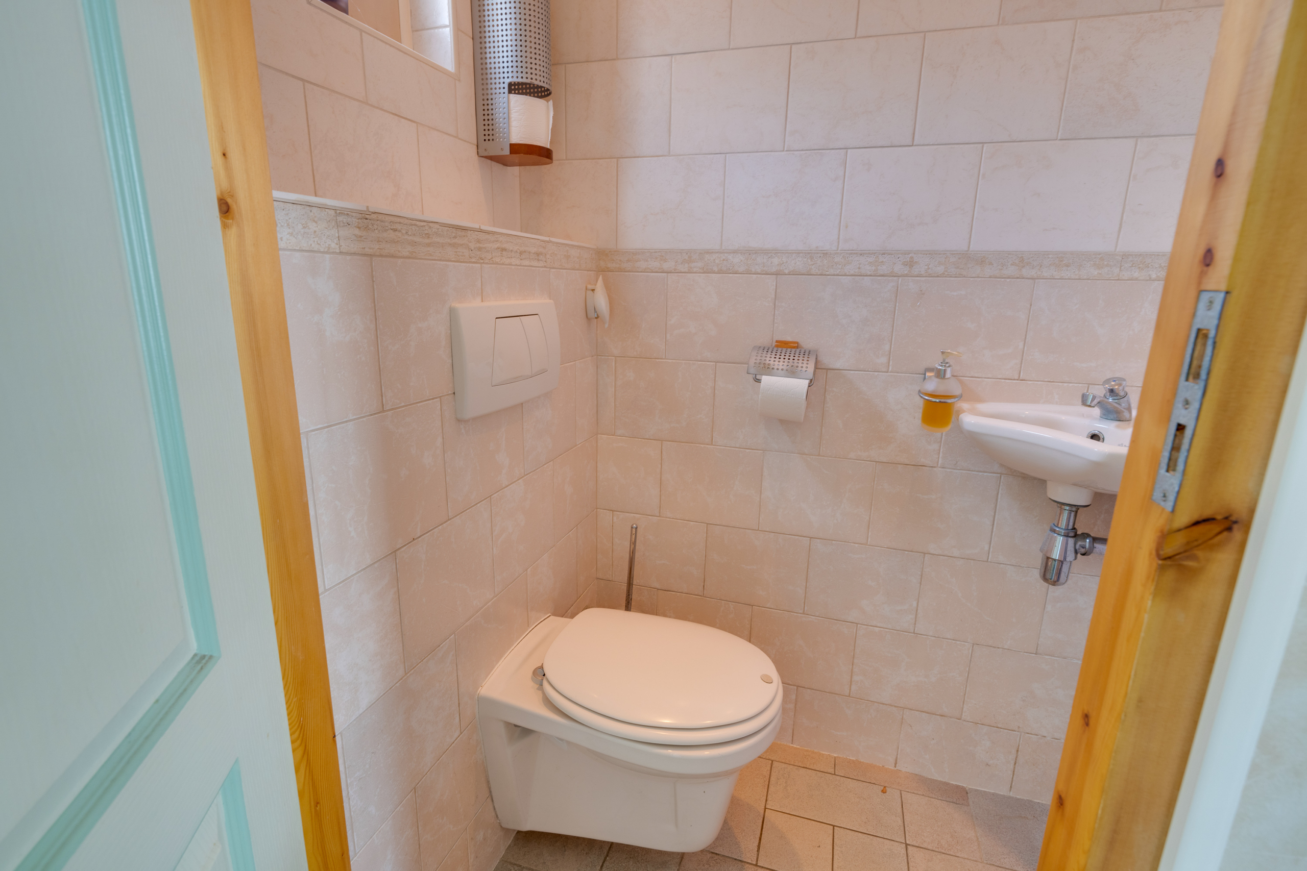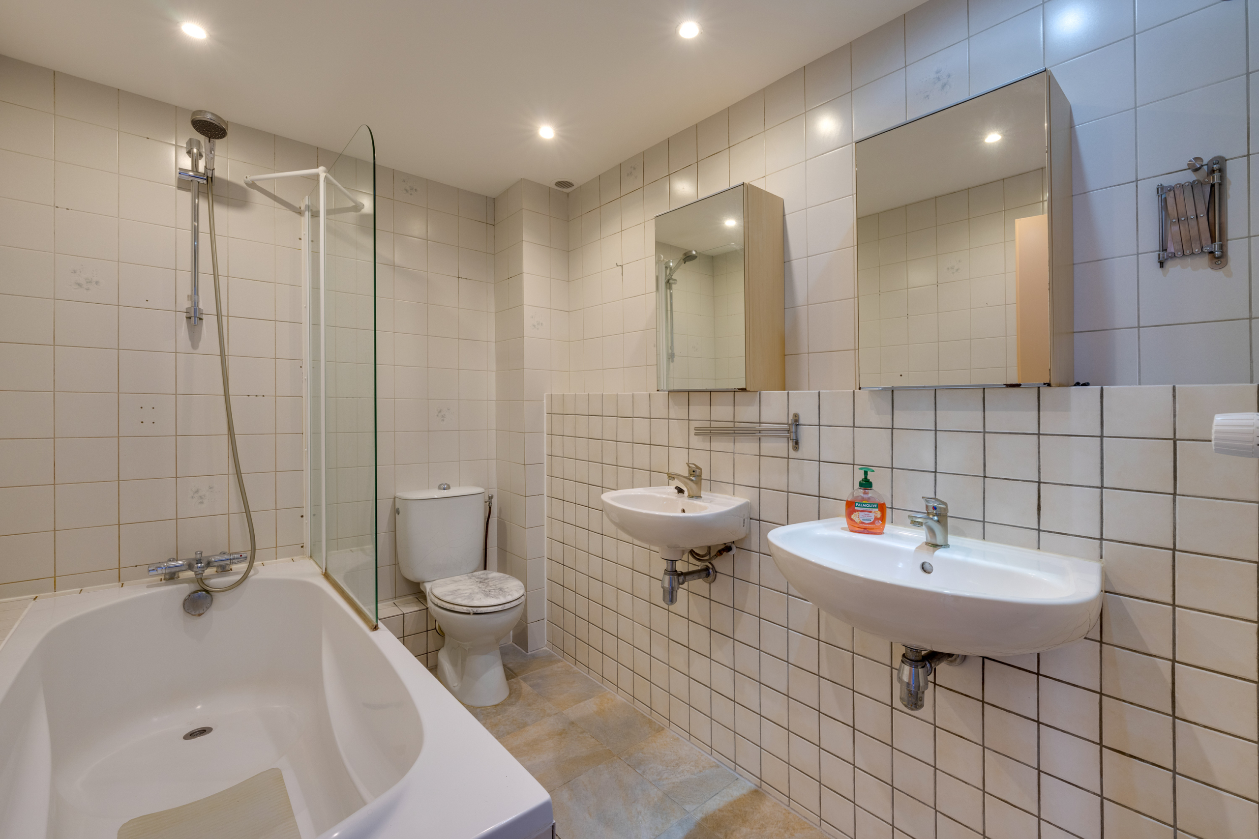 De master bedroom -op de eerste etage aan de voorzijde van de woning gelegen – is een ruime kamer, voorzien van een vaste kastenwand. Ook de badkamer, met een ligbad, twee wastafels en een toilet is op deze verdieping gelegen.