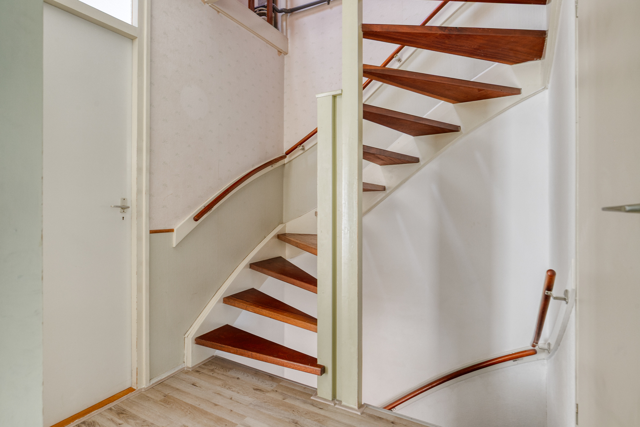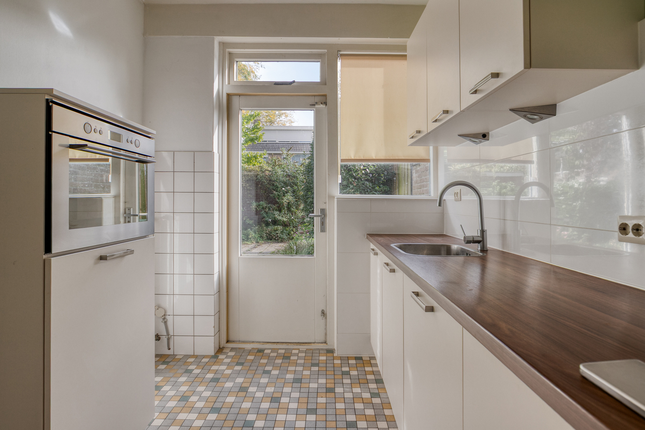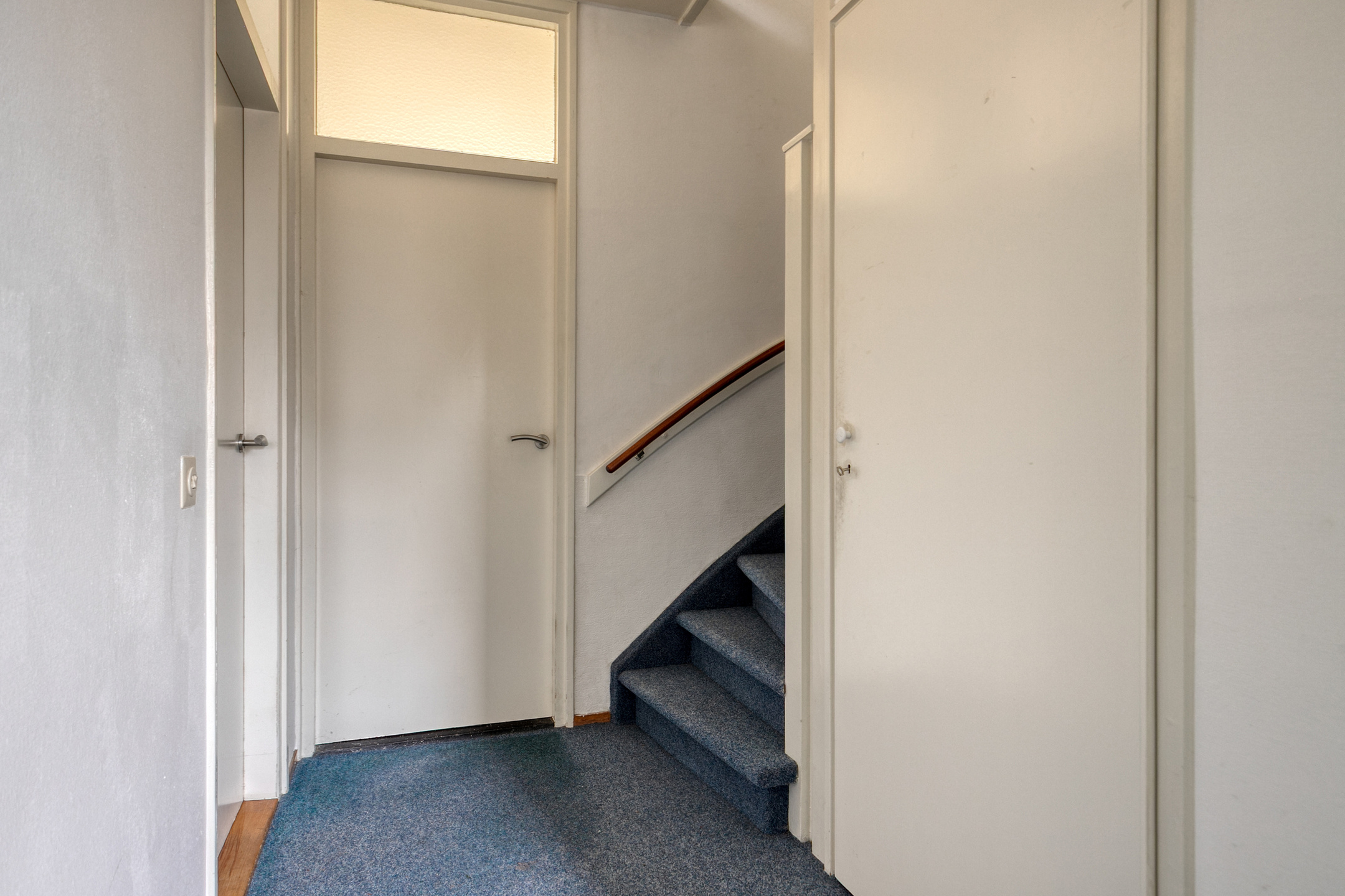Via de entree bereik je de hal met meterkast en vloerbedekking. Aansluitend bevindt zich een portaal met toiletruimte, trapopgang naar de eerste verdieping, trapkast en toegang tot de keuken en woonkamer. De dichte keuken is netjes en praktisch ingericht met onder andere een magnetron, vaatwasser, 4-pits gaskookplaat, gootsteen, vaste kast en deels witte betegeling. Vanuit de keuken heeft u toegang tot de achtertuin.