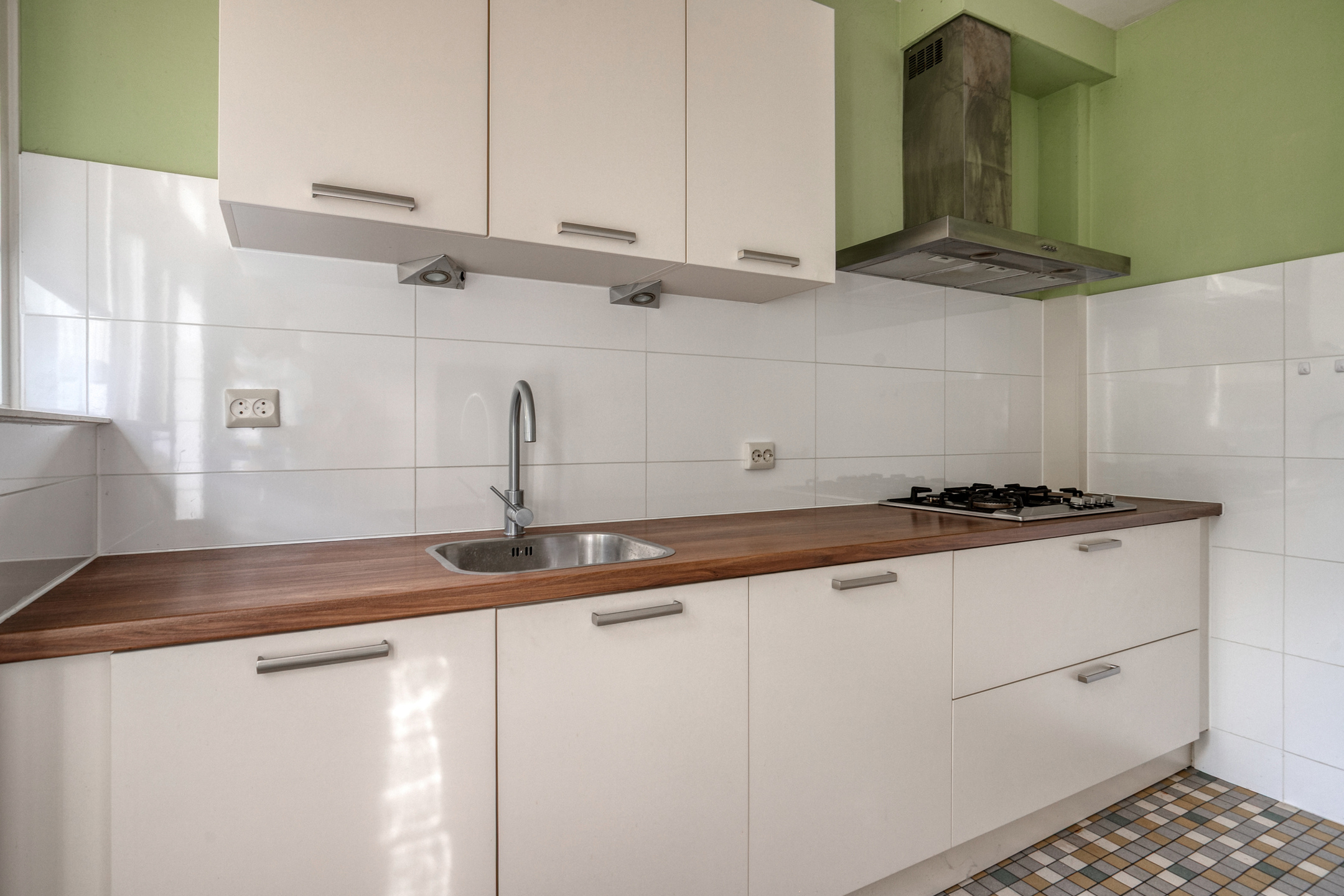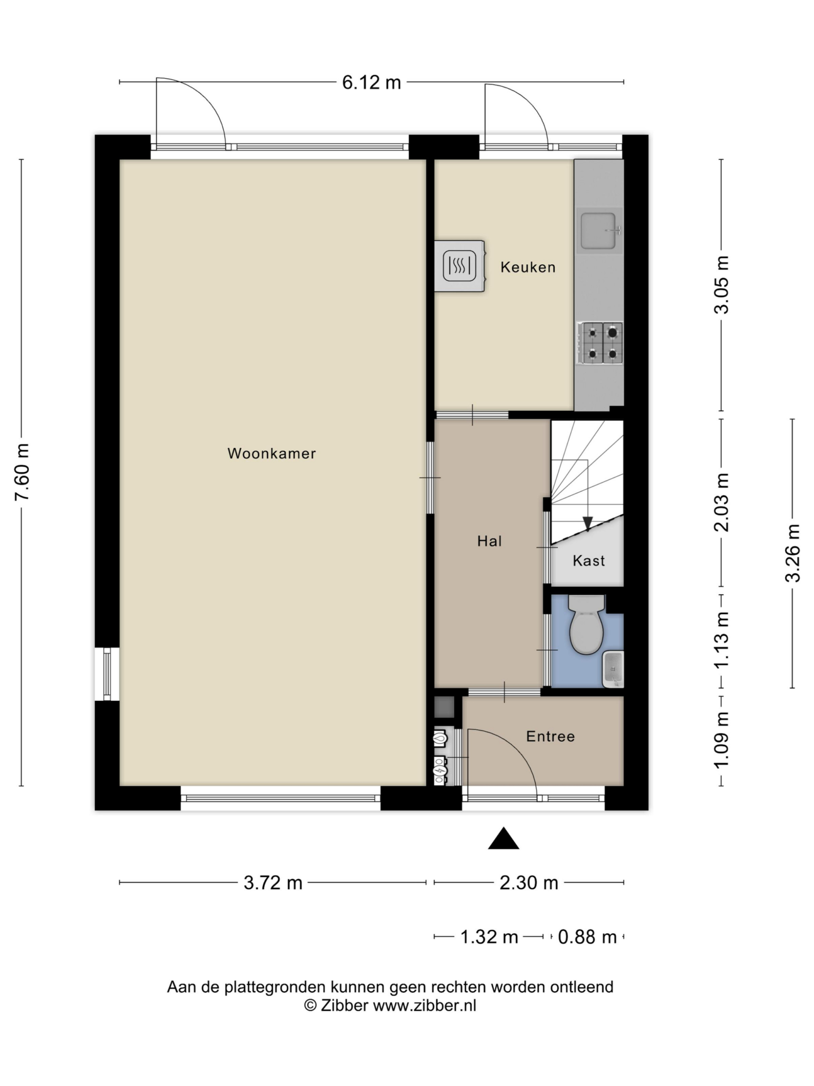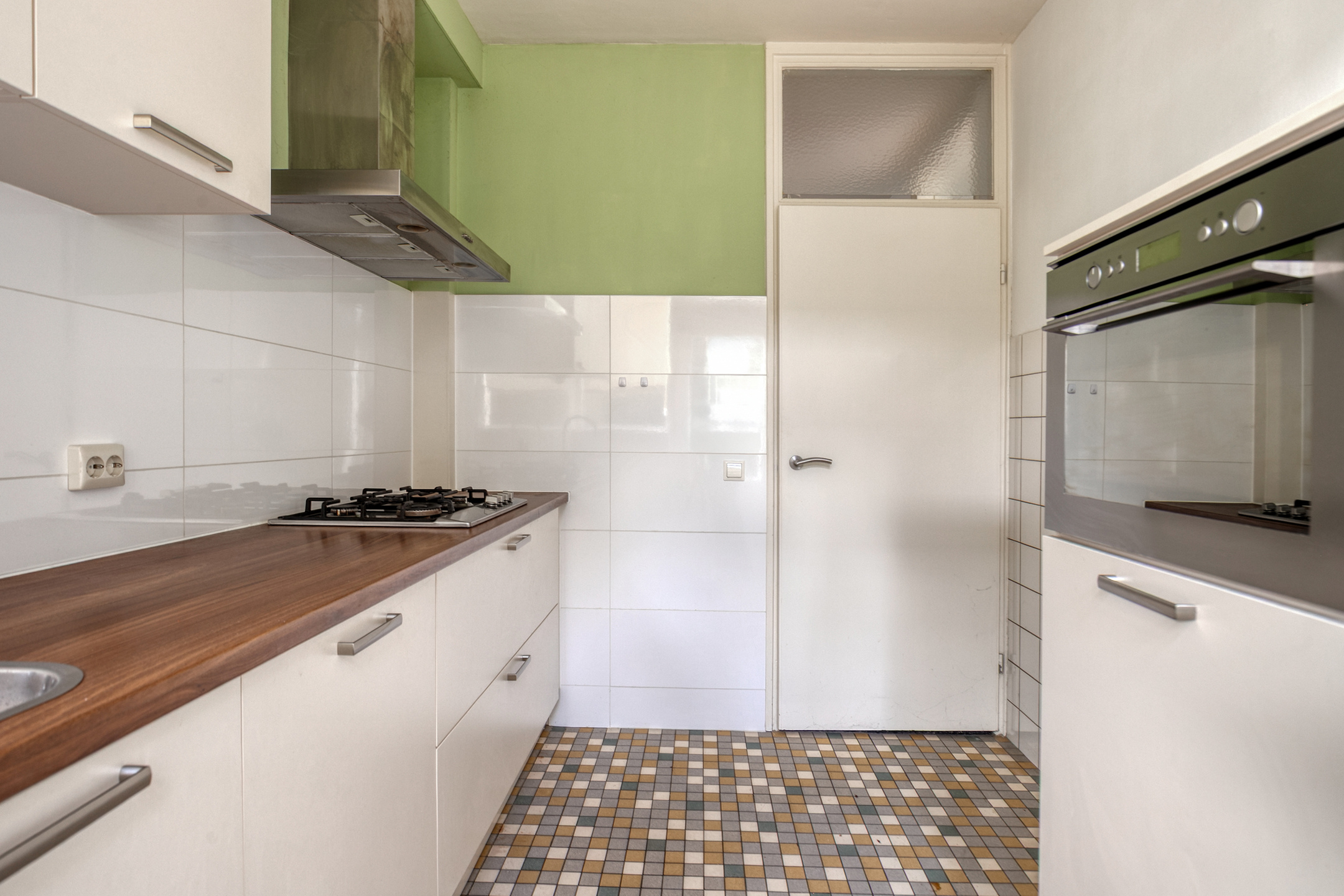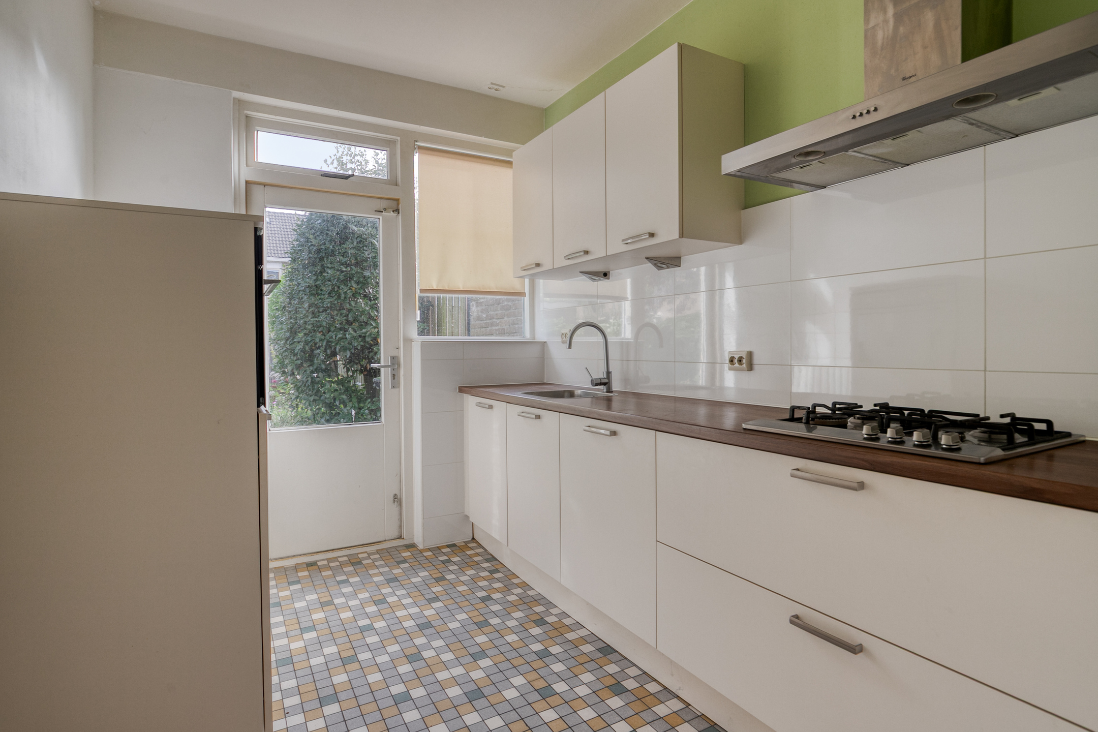 Via de entree bereik je de hal met meterkast en vloerbedekking. Aansluitend bevindt zich een portaal met toiletruimte, trapopgang naar de eerste verdieping, trapkast en toegang tot de keuken en woonkamer. De dichte keuken is netjes en praktisch ingericht met onder andere een magnetron, vaatwasser, 4-pits gaskookplaat, gootsteen, vaste kast en deels witte betegeling. Vanuit de keuken heeft u toegang tot de achtertuin.