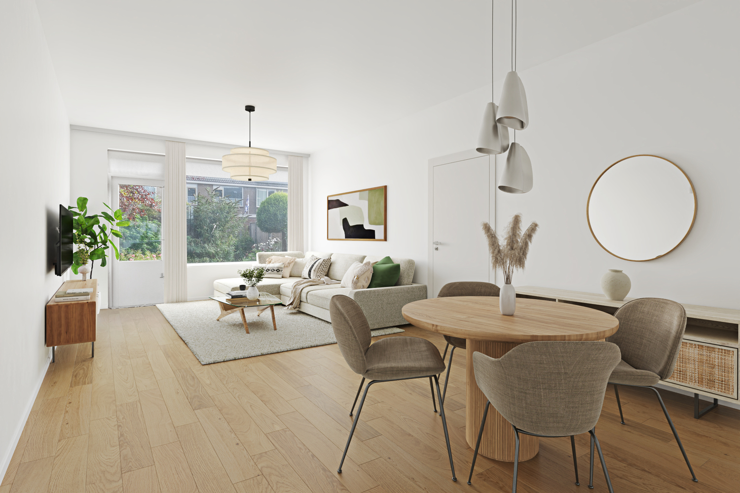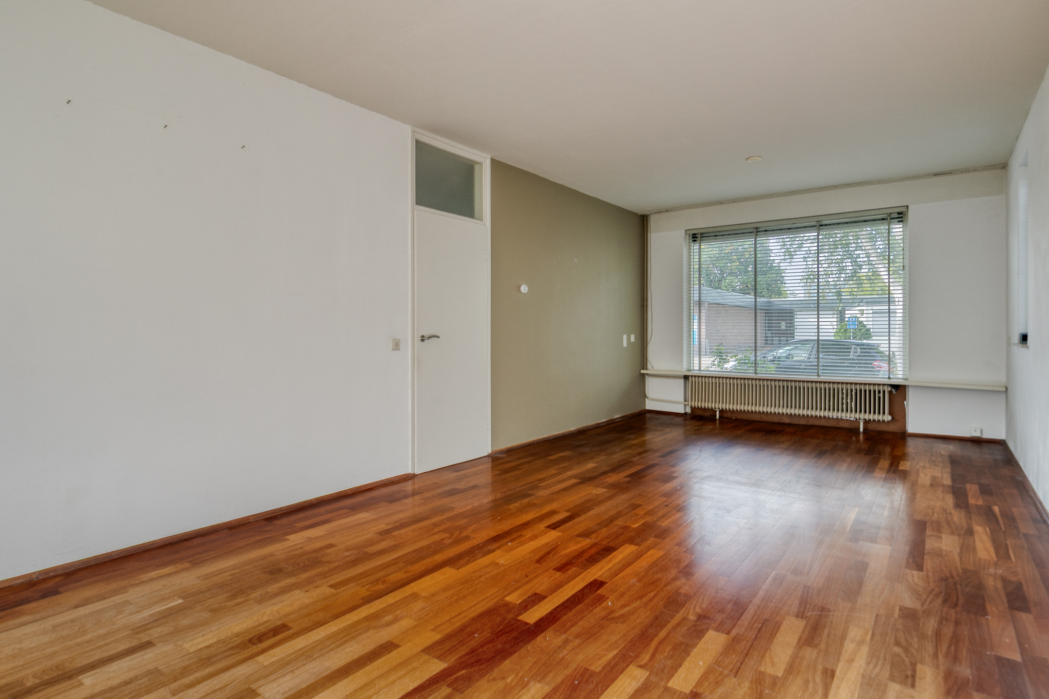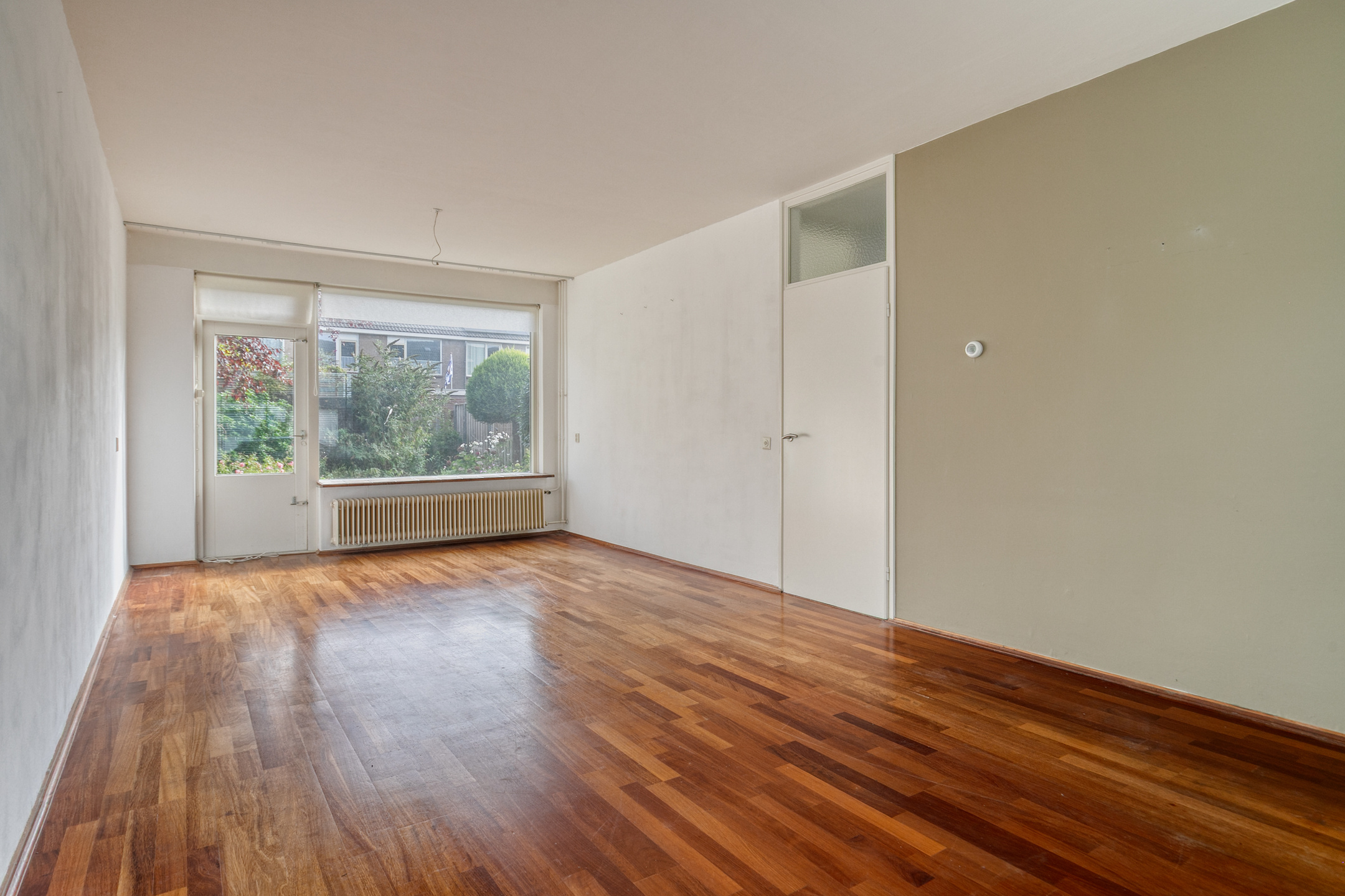 De ruime doorzonwoonkamer met houten vloer heeft grote ramen aan zowel de voor- als achterzijde, waardoor er veel daglicht binnenvalt. Via een loopdeur bereikt u direct de achtertuin.