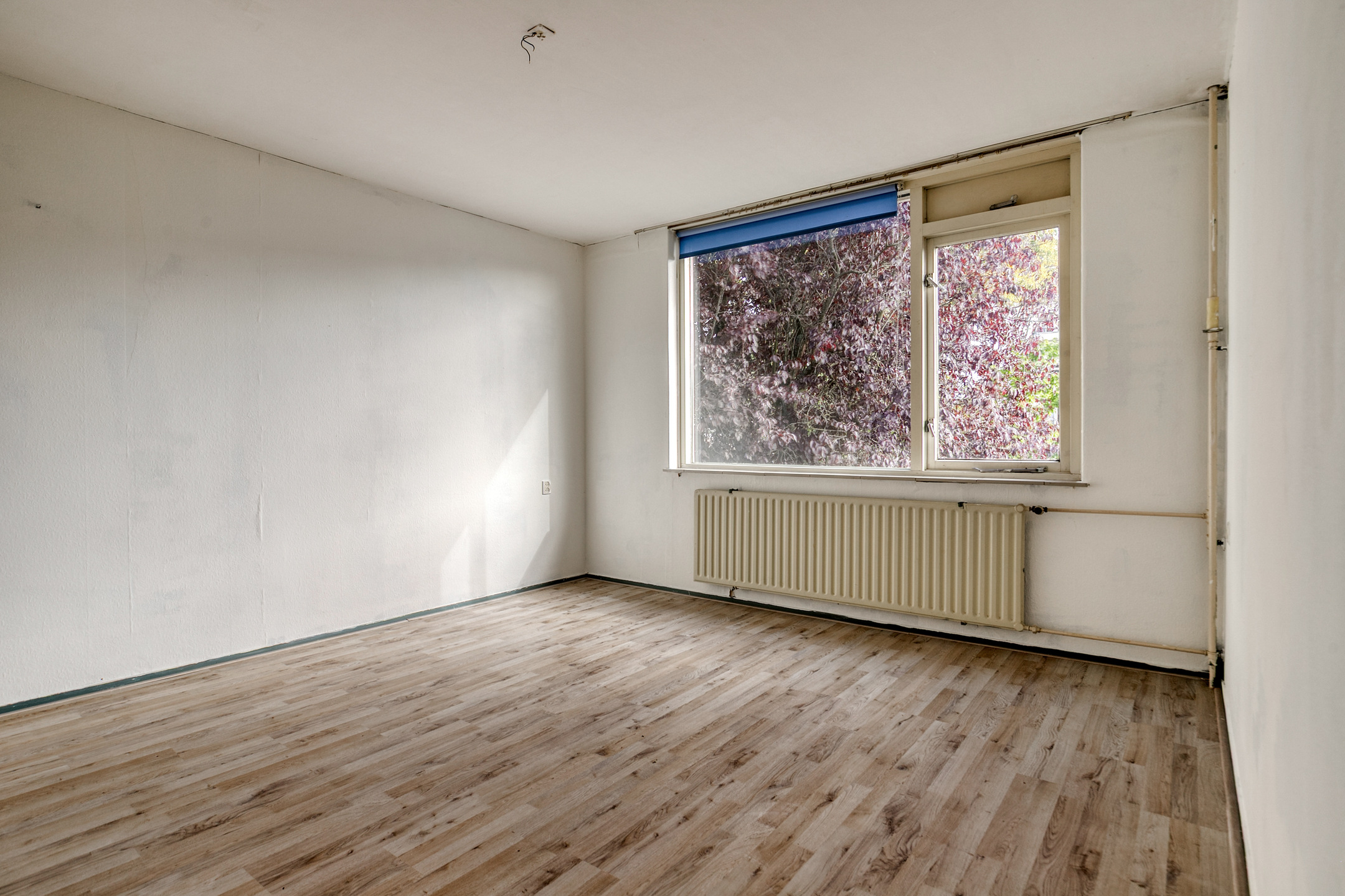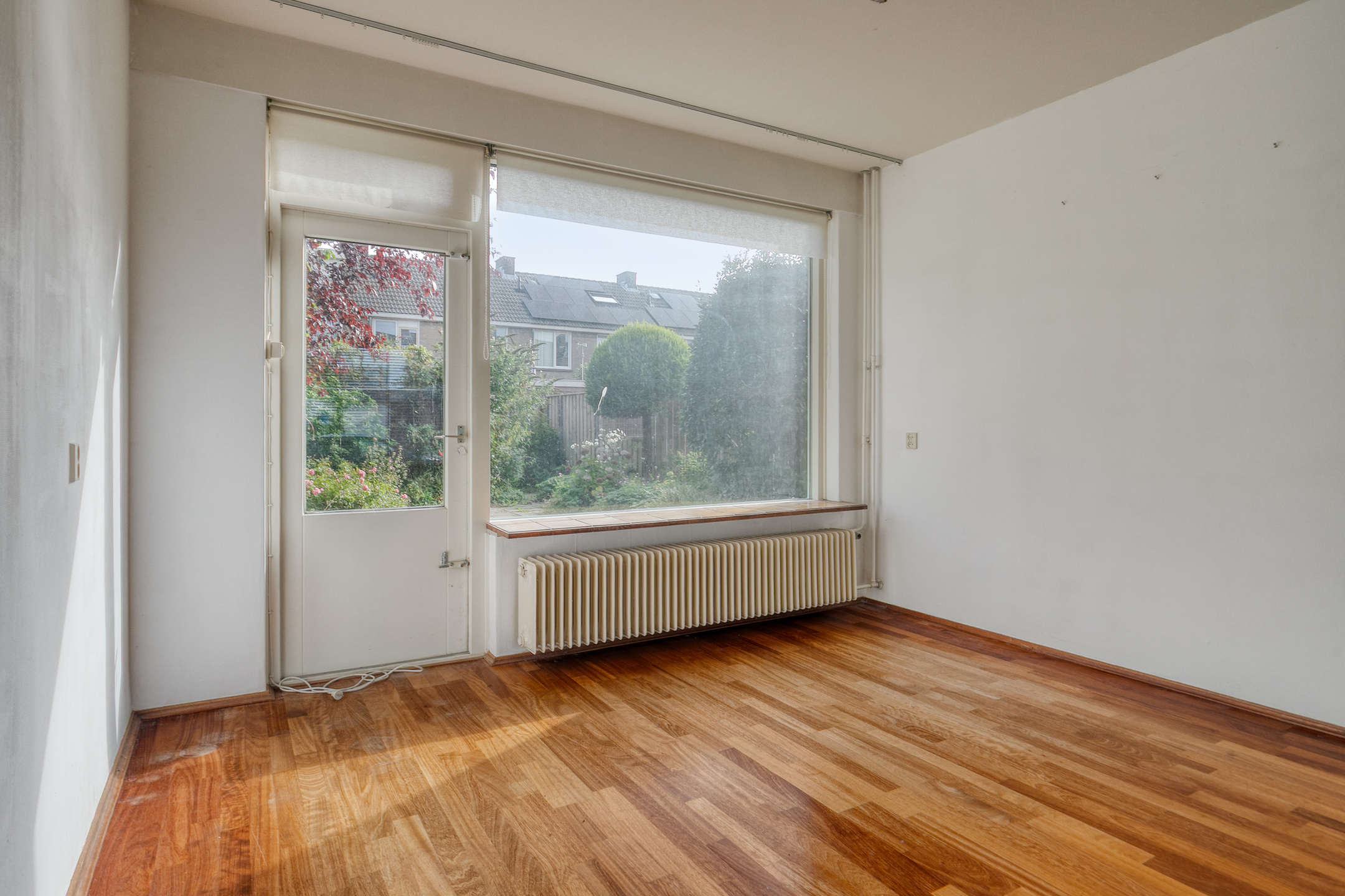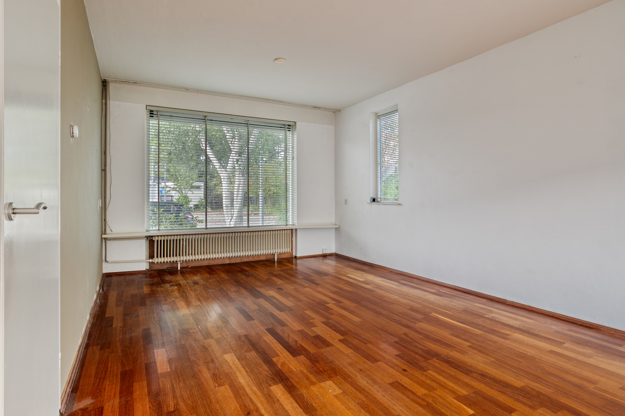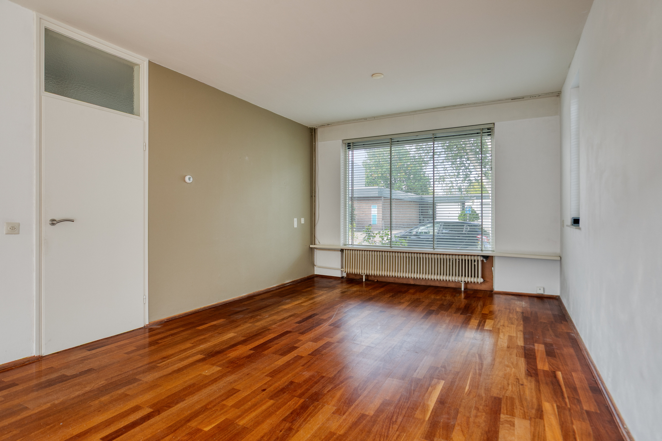 De ruime doorzonwoonkamer met houten vloer heeft grote ramen aan zowel de voor- als achterzijde, waardoor er veel daglicht binnenvalt. Via een loopdeur bereikt u direct de achtertuin.