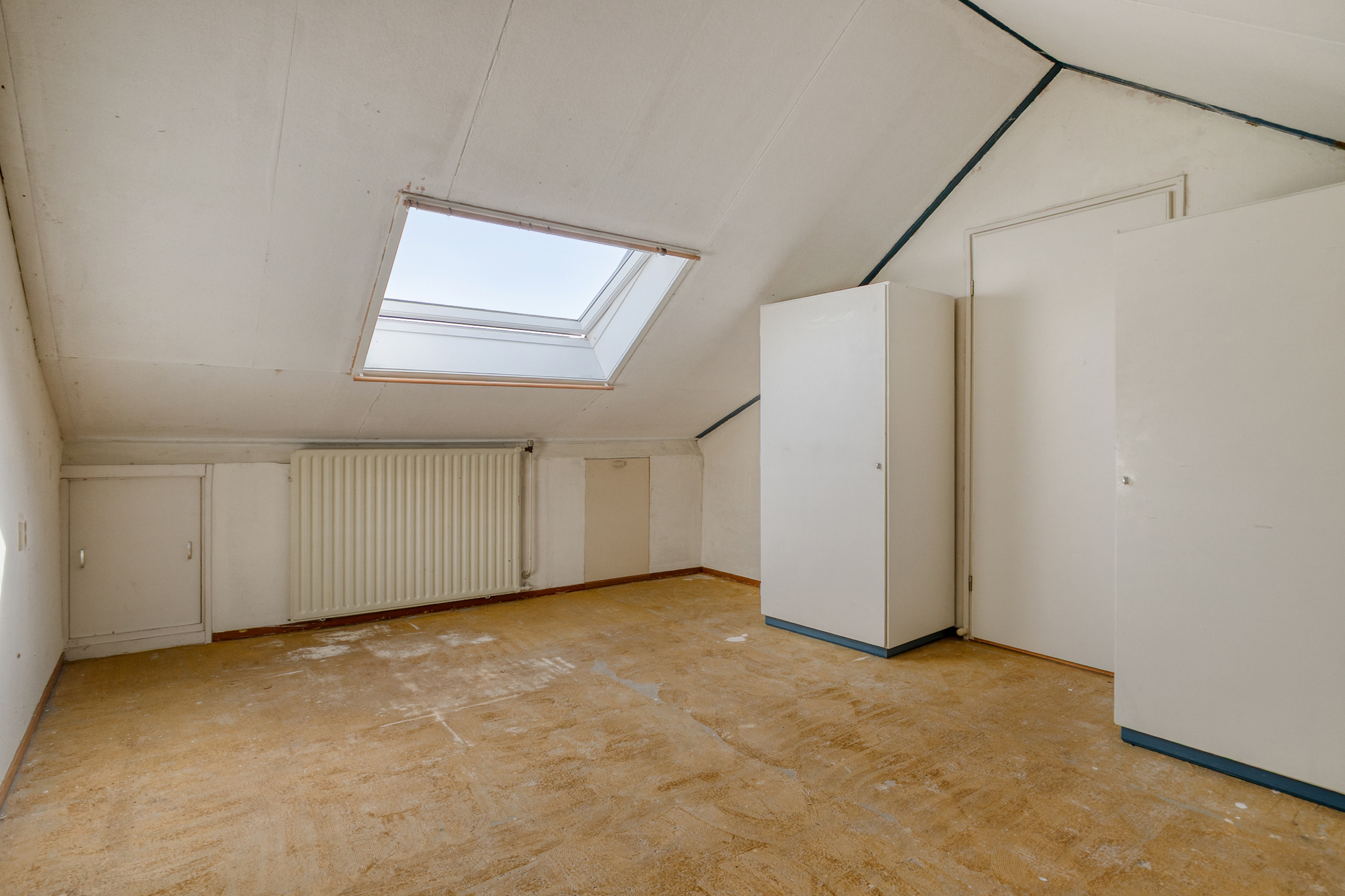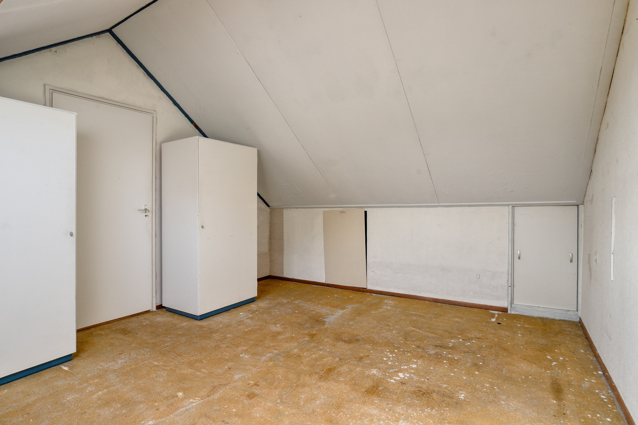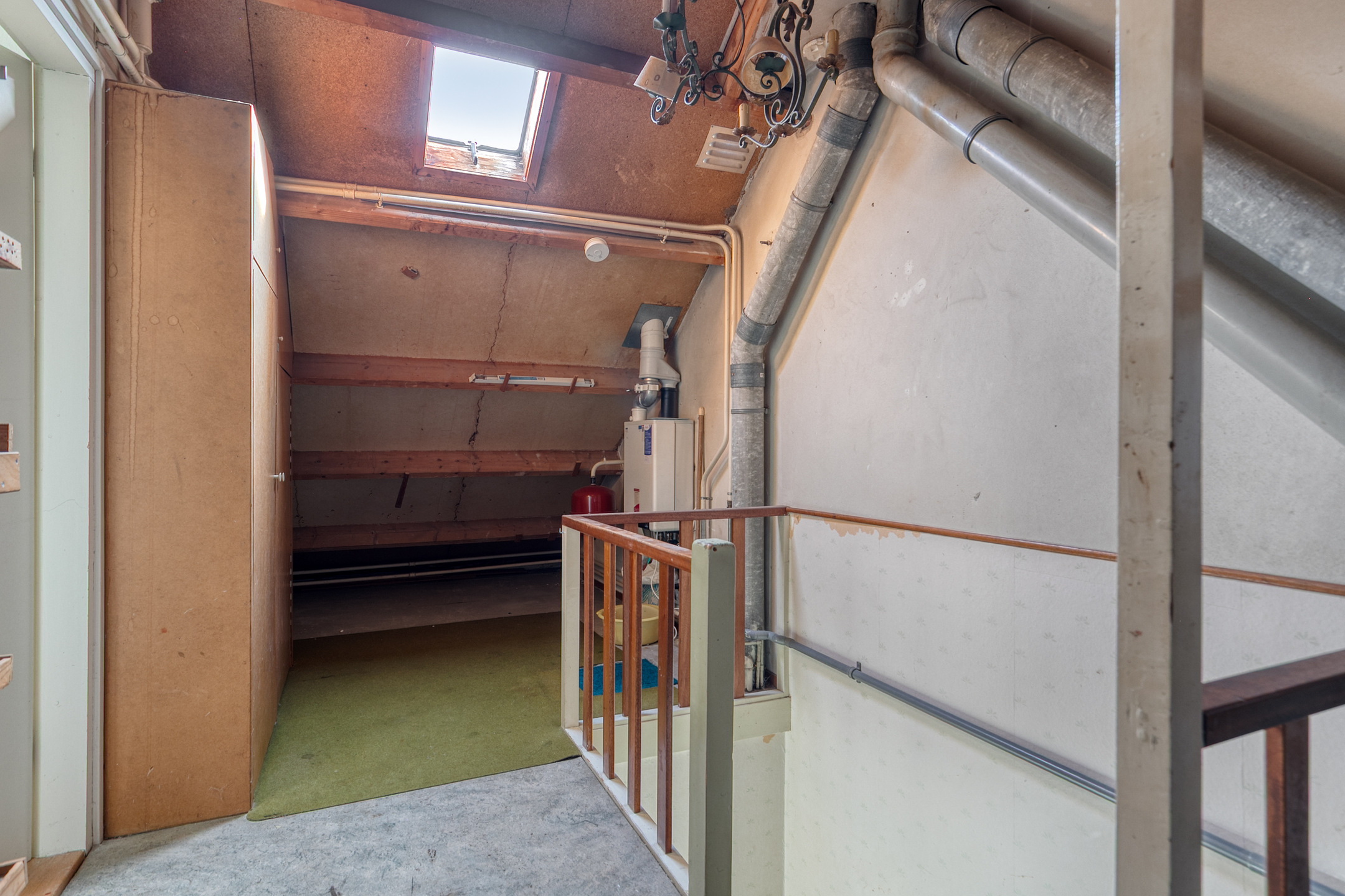 De zolderverdieping is bereikbaar via een vaste trap. Hier vindt u een overloop met aansluitingen voor wasapparatuur en de opstelplaats van de Intergas cv-ketel. Daarnaast is er een vierde slaapkamer met Velux dakraam en bergruimte achter de knieschotten aanwezig.
