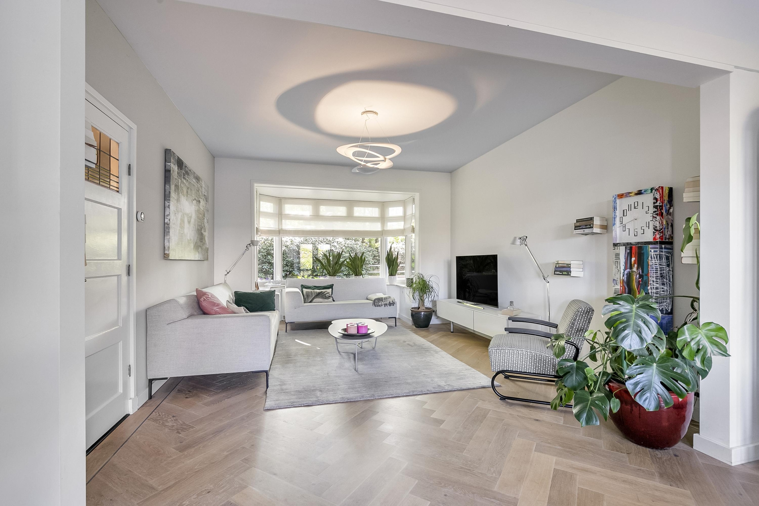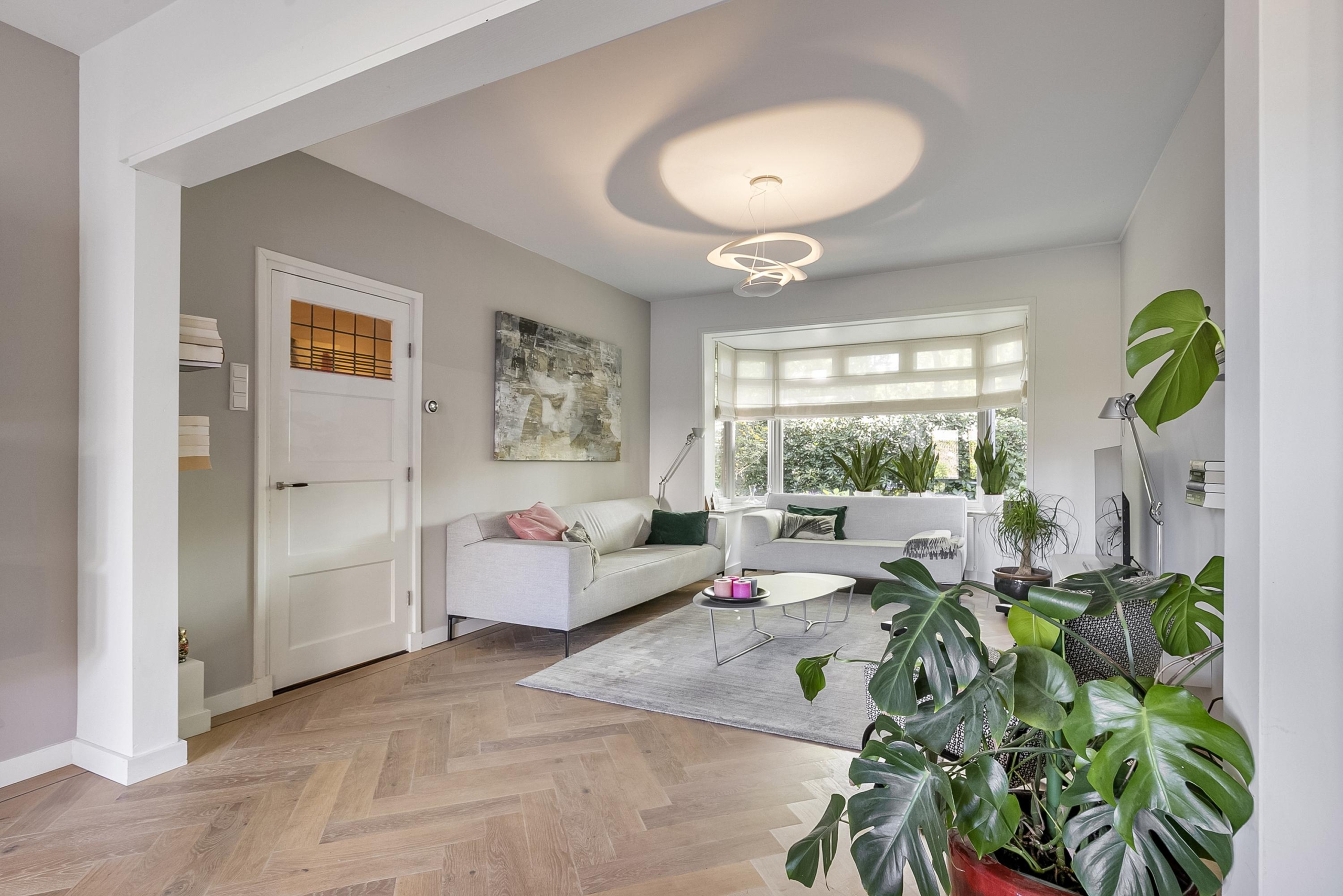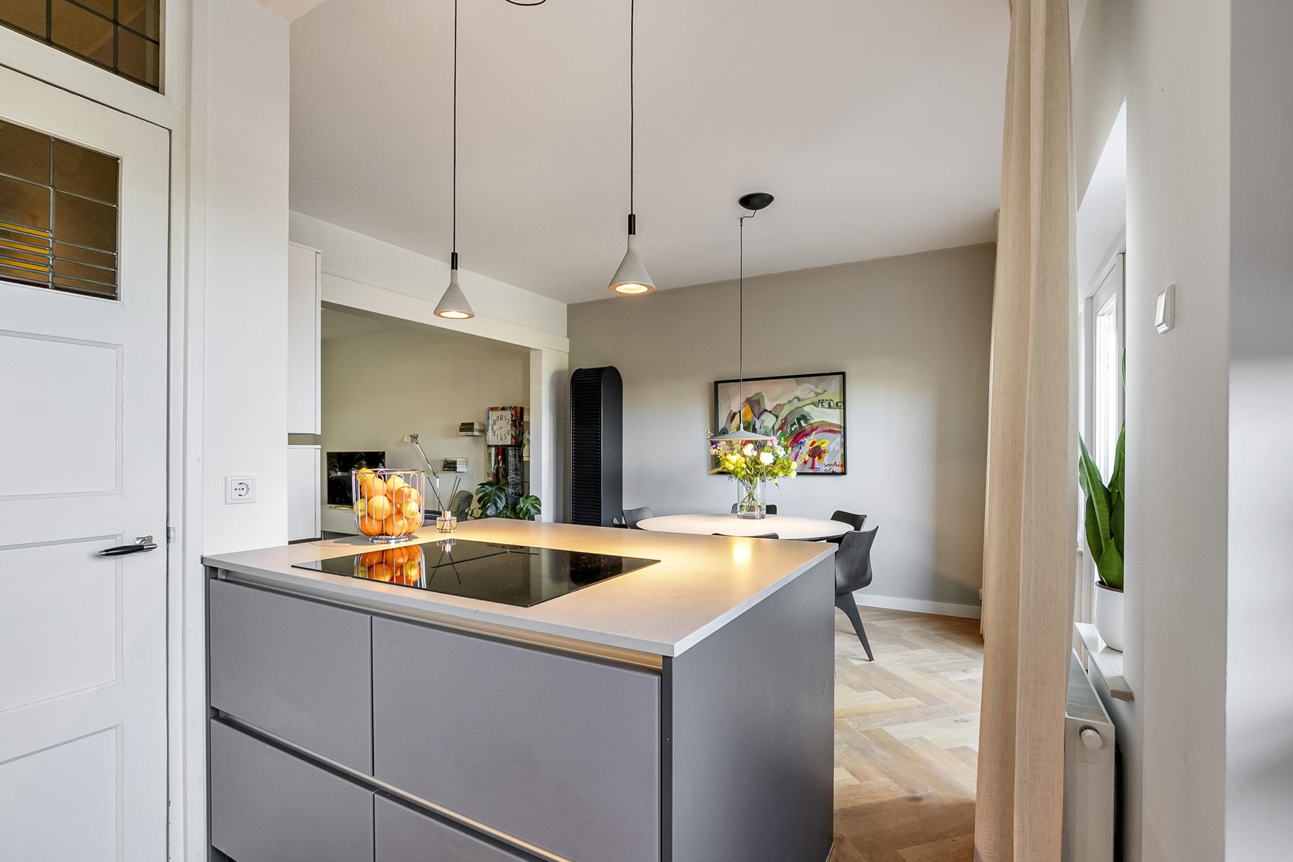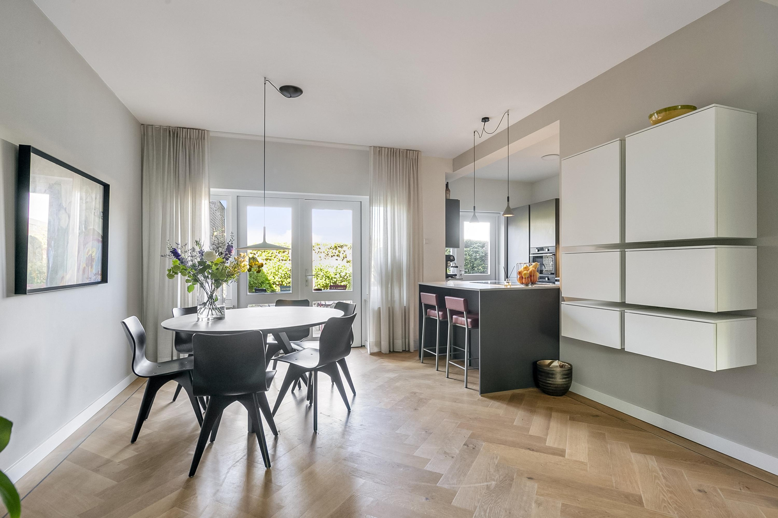 Bij binnenkomst kom je in een verzorgde hal met meterkast, modern toilet met fonteintje, en toegang tot de kelder. De keuken is in 2020 volledig vernieuwd en voorzien van moderne inbouwapparatuur. Aan de voorzijde van de woning bevindt zich de sfeervolle woonkamer met karakteristieke erker, die zorgt voor veel lichtinval en een prettig uitzicht op het groen. Aan de achterzijde geven openslaande deuren toegang tot de zonnige tuin op het westen – ideaal om binnen en buiten met elkaar te verbinden tijdens warme dagen.