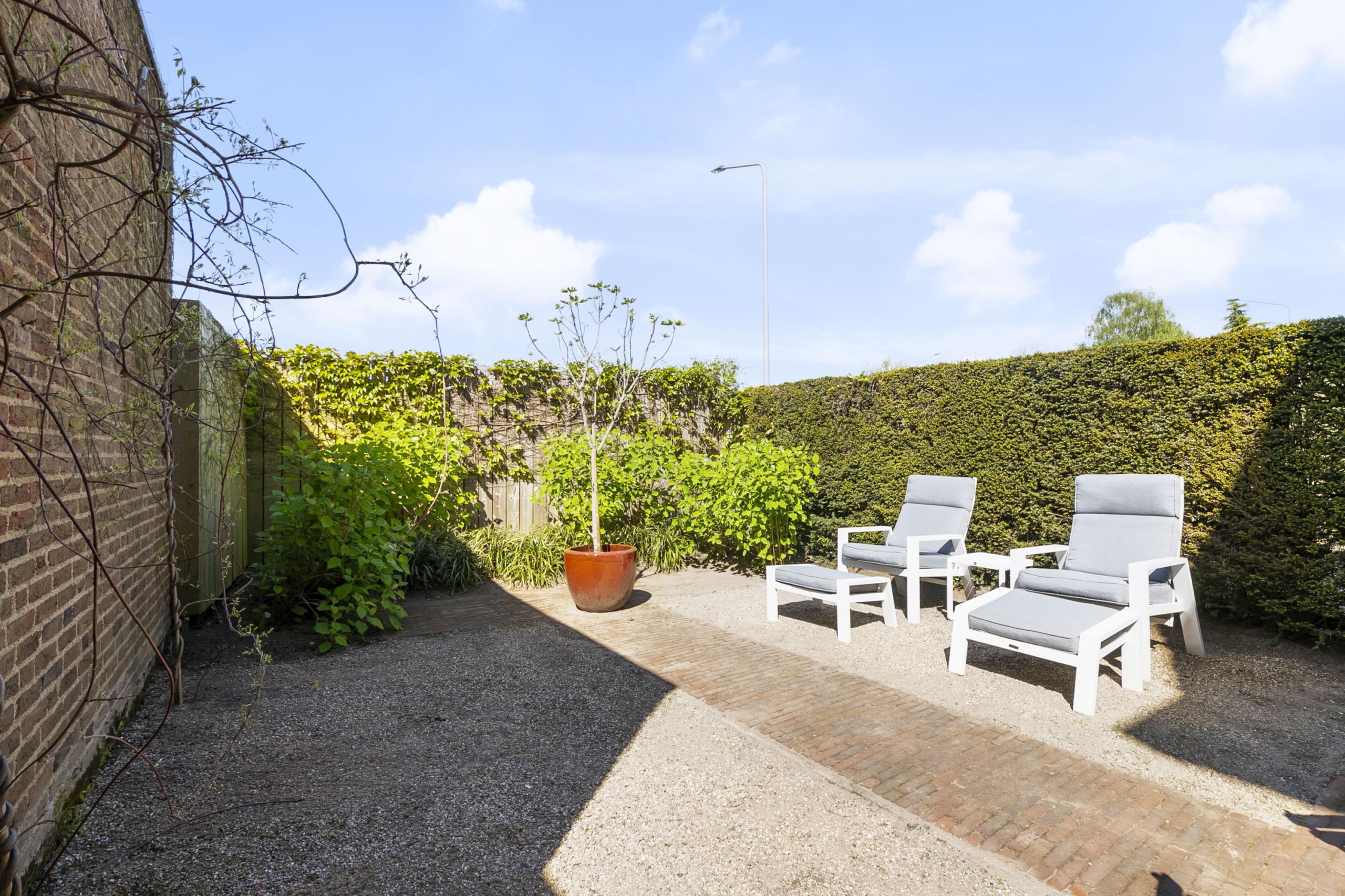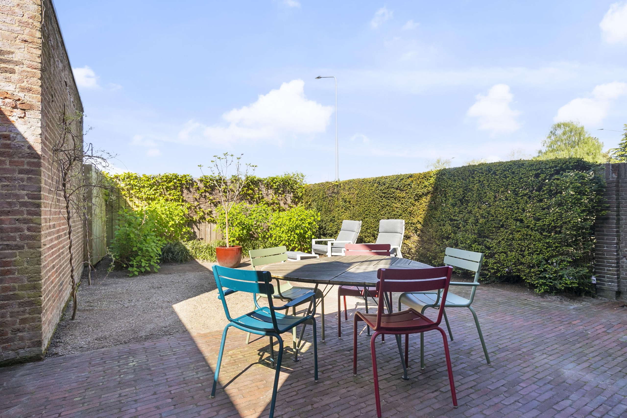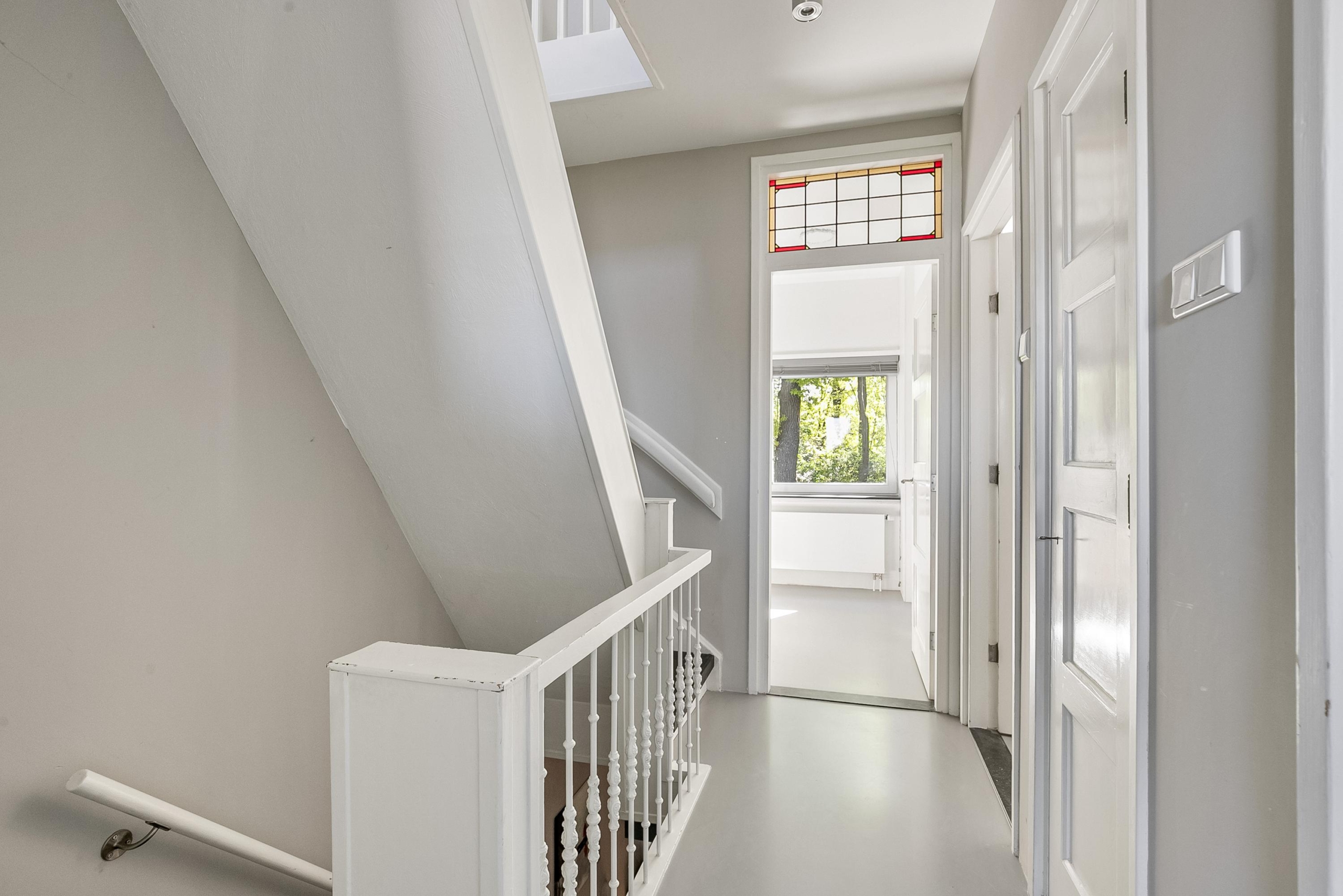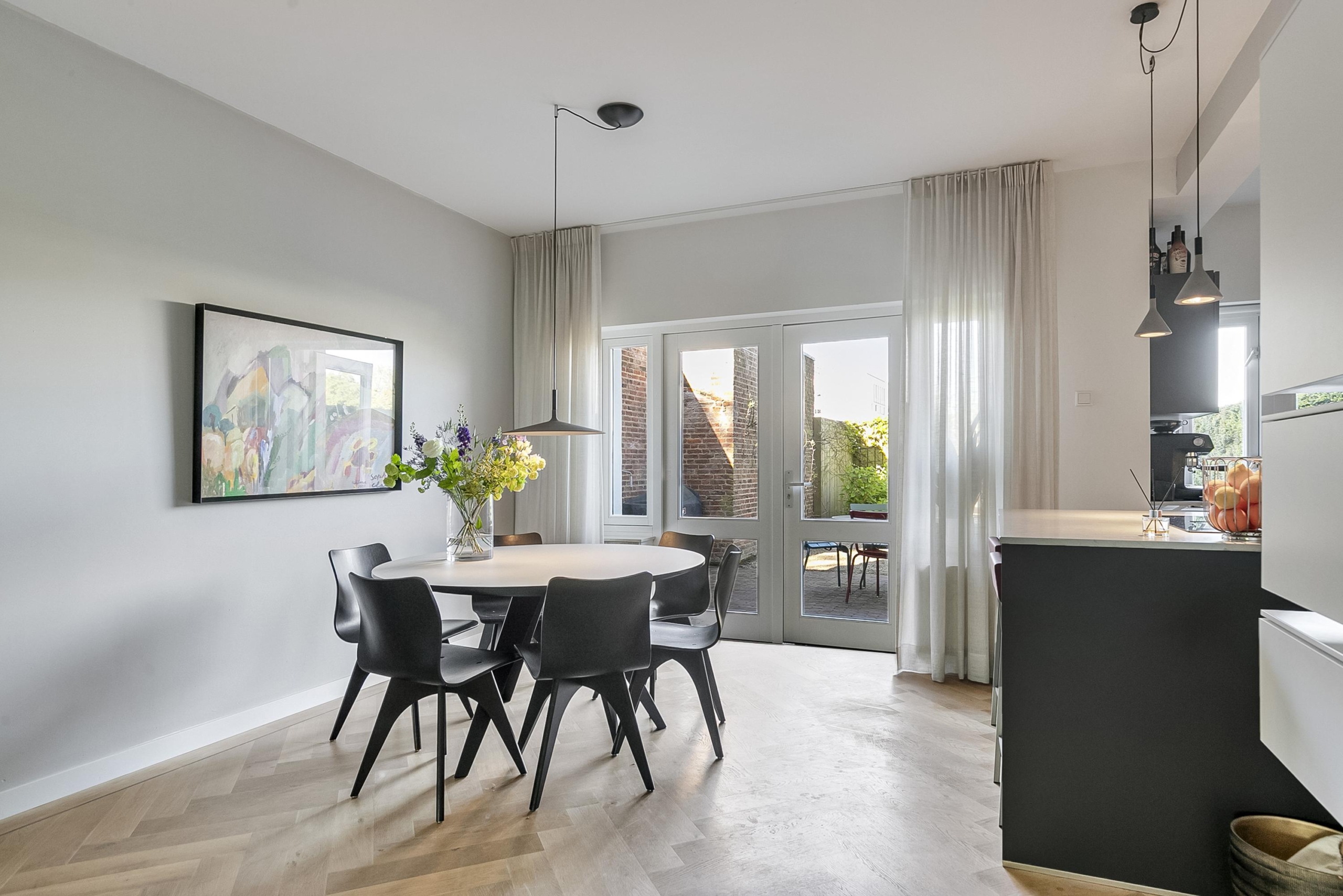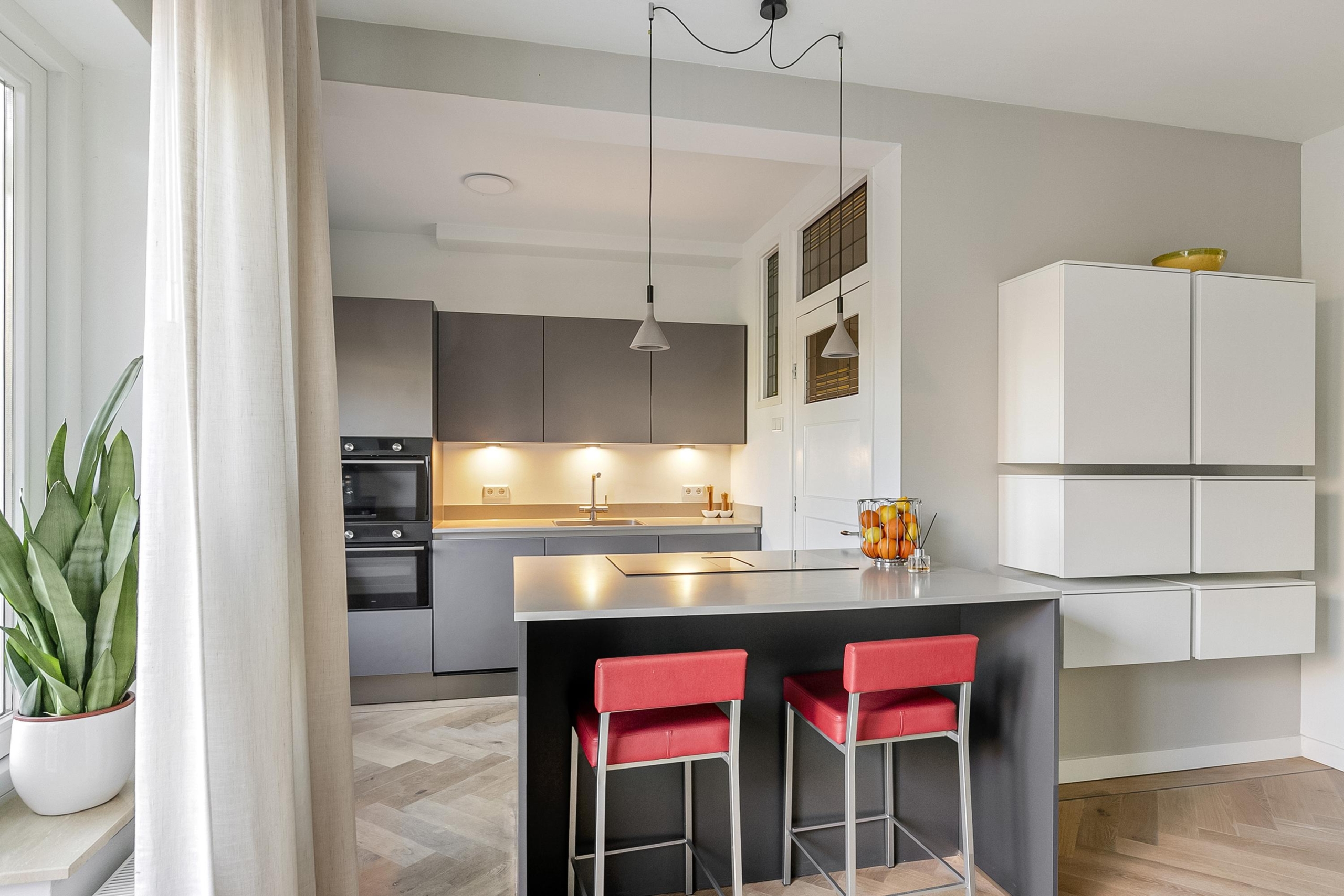 Bij binnenkomst kom je in een verzorgde hal met meterkast, modern toilet met fonteintje, en toegang tot de kelder. De keuken is in 2020 volledig vernieuwd en voorzien van moderne inbouwapparatuur. Aan de voorzijde van de woning bevindt zich de sfeervolle woonkamer met karakteristieke erker, die zorgt voor veel lichtinval en een prettig uitzicht op het groen. Aan de achterzijde geven openslaande deuren toegang tot de zonnige tuin op het westen – ideaal om binnen en buiten met elkaar te verbinden tijdens warme dagen.