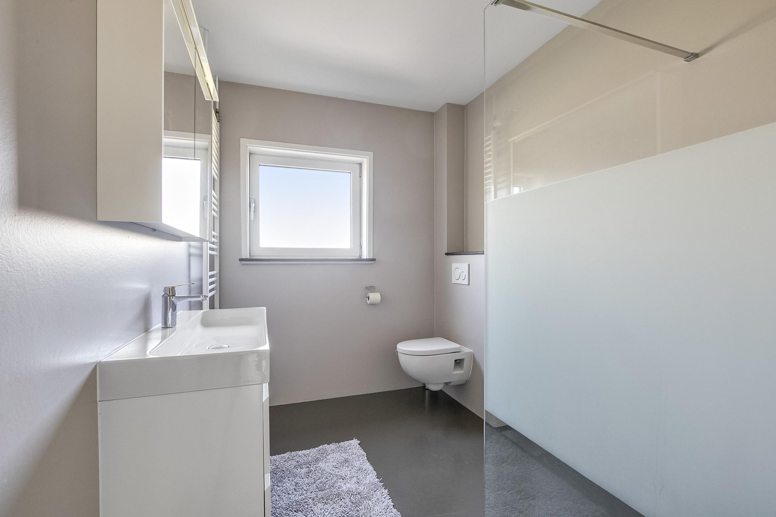 Ruime overloop. Drie slaapkamers, twee daarvan zijn voorzien van handige inbouwkasten, en één slaapkamer heeft bovendien toegang tot een balkon. De moderne badkamer beschikt over een inloopdouche, een tweede toilet en een stijlvol wastafelmeubel.