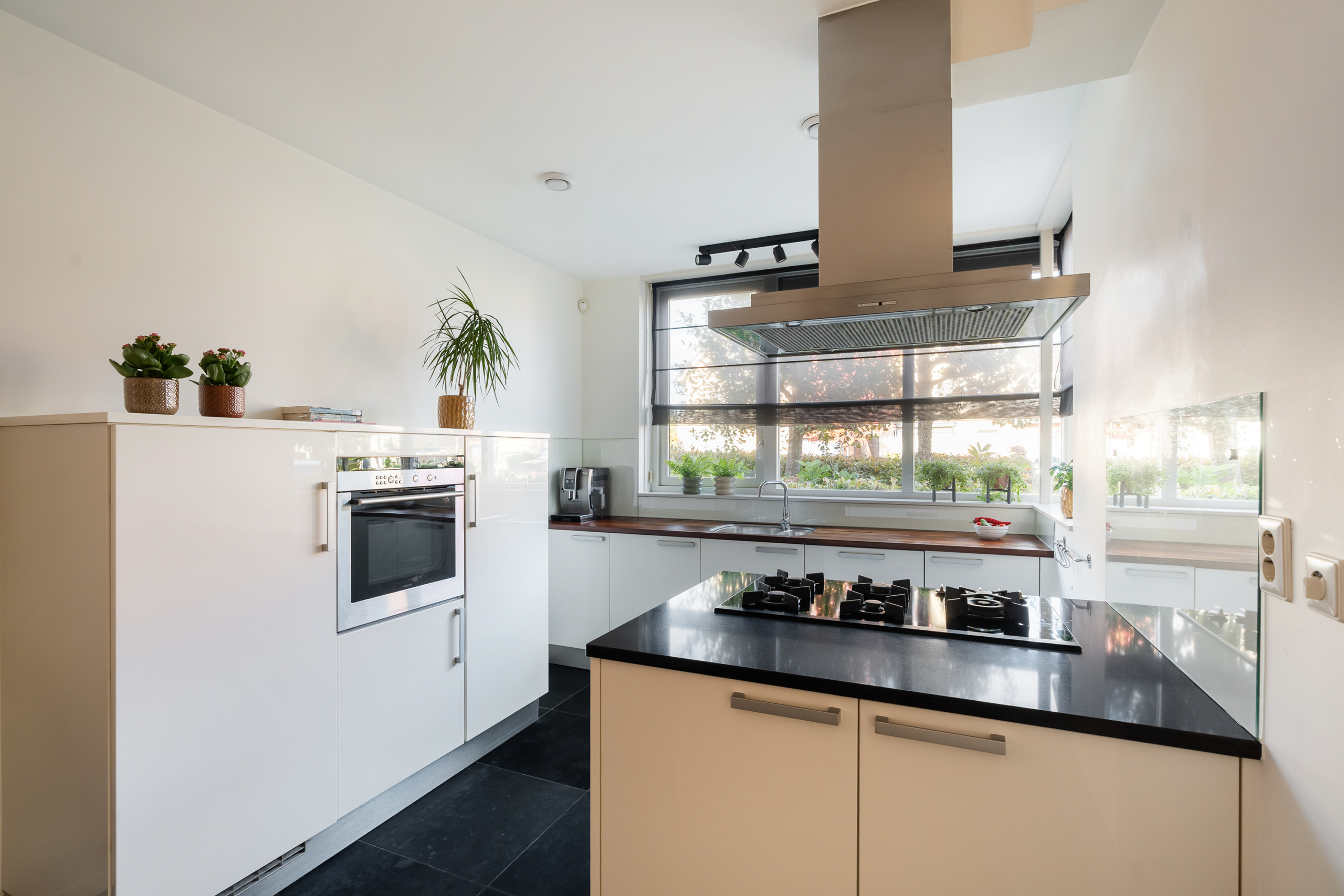De separate keuken beschikt over vloerverwarming en is uitgevoerd met een kookeiland met vijfpits gasfornuis, combi-oven, vaatwasser en spoelgedeelte aan de voorzijde met zicht op de rustige, doodlopende straat. De keuken biedt bovendien voldoende ruimte voor een eettafel.