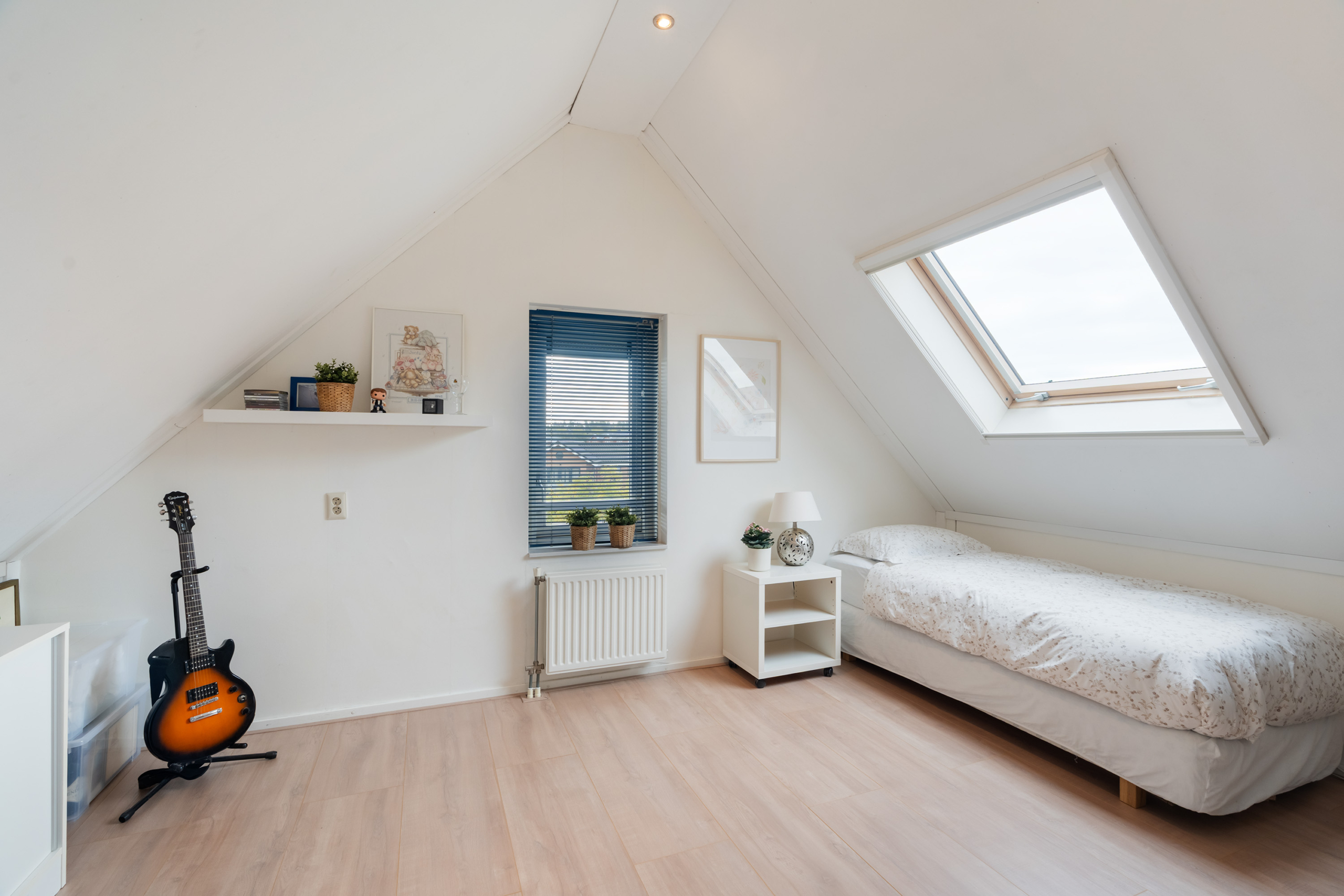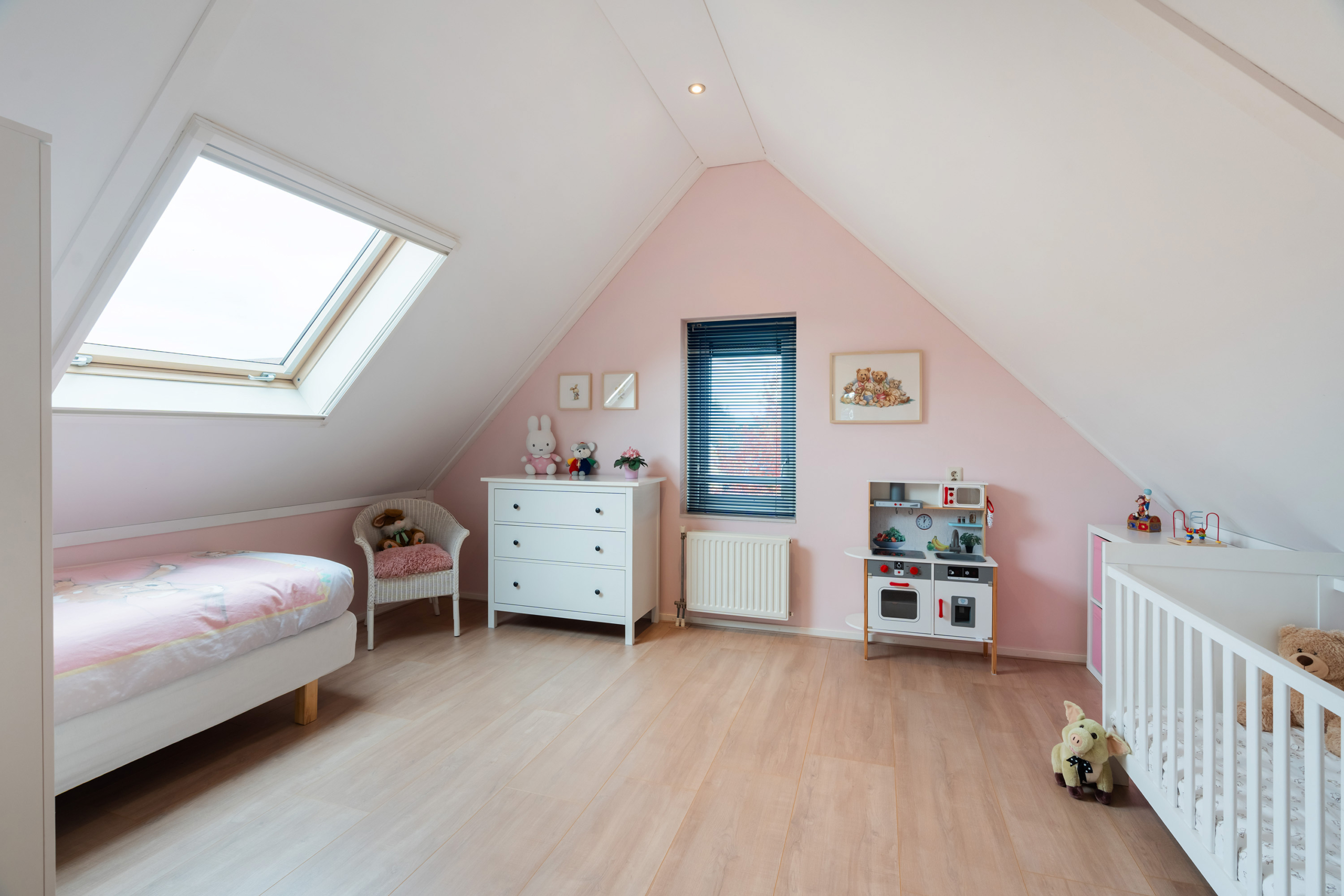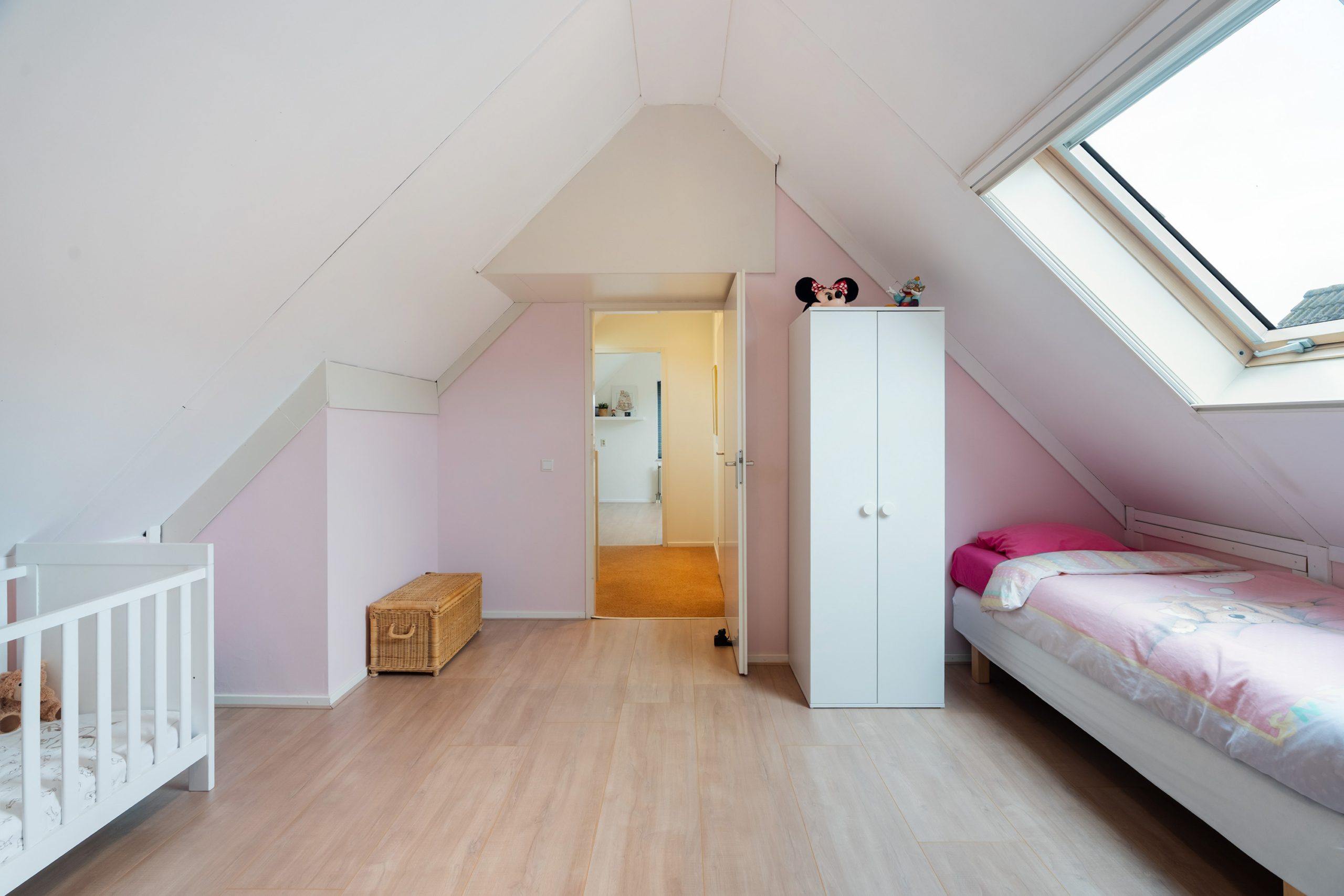 De tweede verdieping telt twee ruime slaapkamers, beide voorzien van laminaat en een dakraam. Op de overloop bevindt zich een aparte was- en strijkruimte met aansluitingen voor wasmachine en droger.