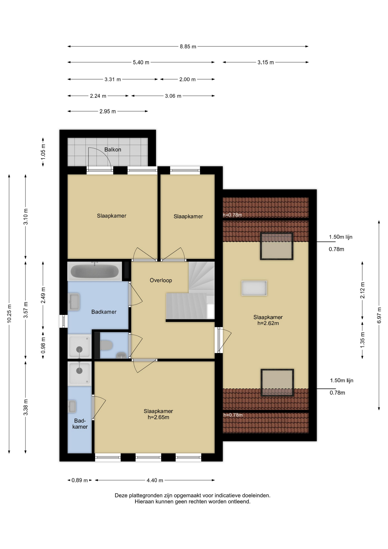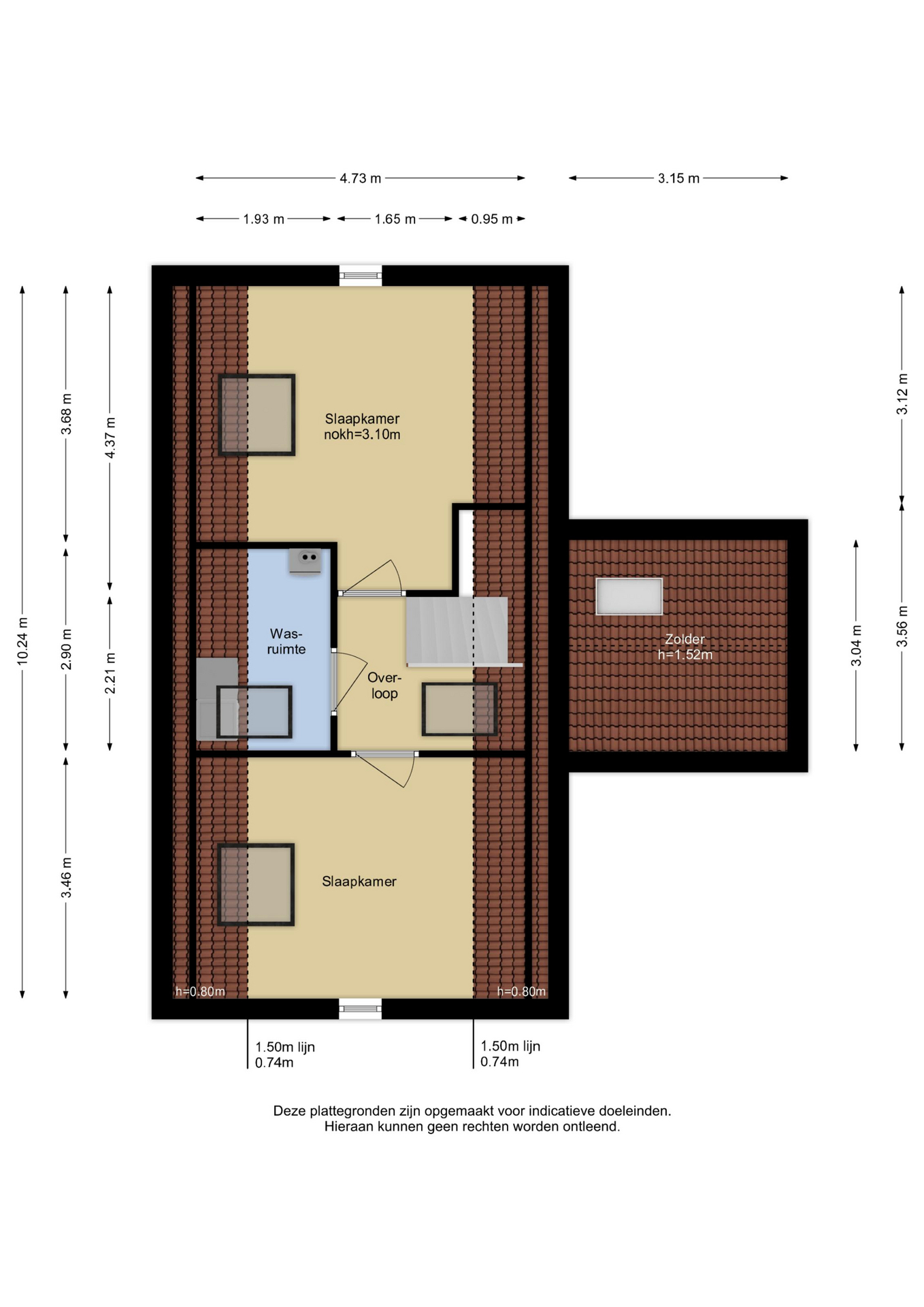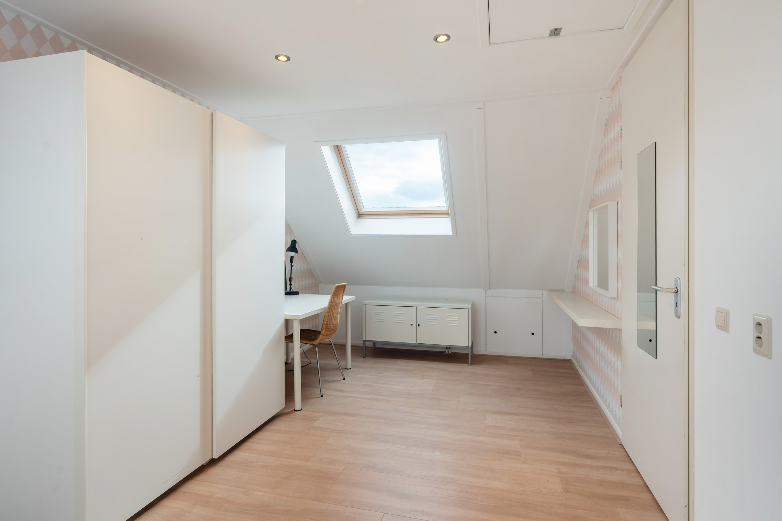 De tweede verdieping telt twee ruime slaapkamers, beide voorzien van laminaat en een dakraam. Op de overloop bevindt zich een aparte was- en strijkruimte met aansluitingen voor wasmachine en droger.