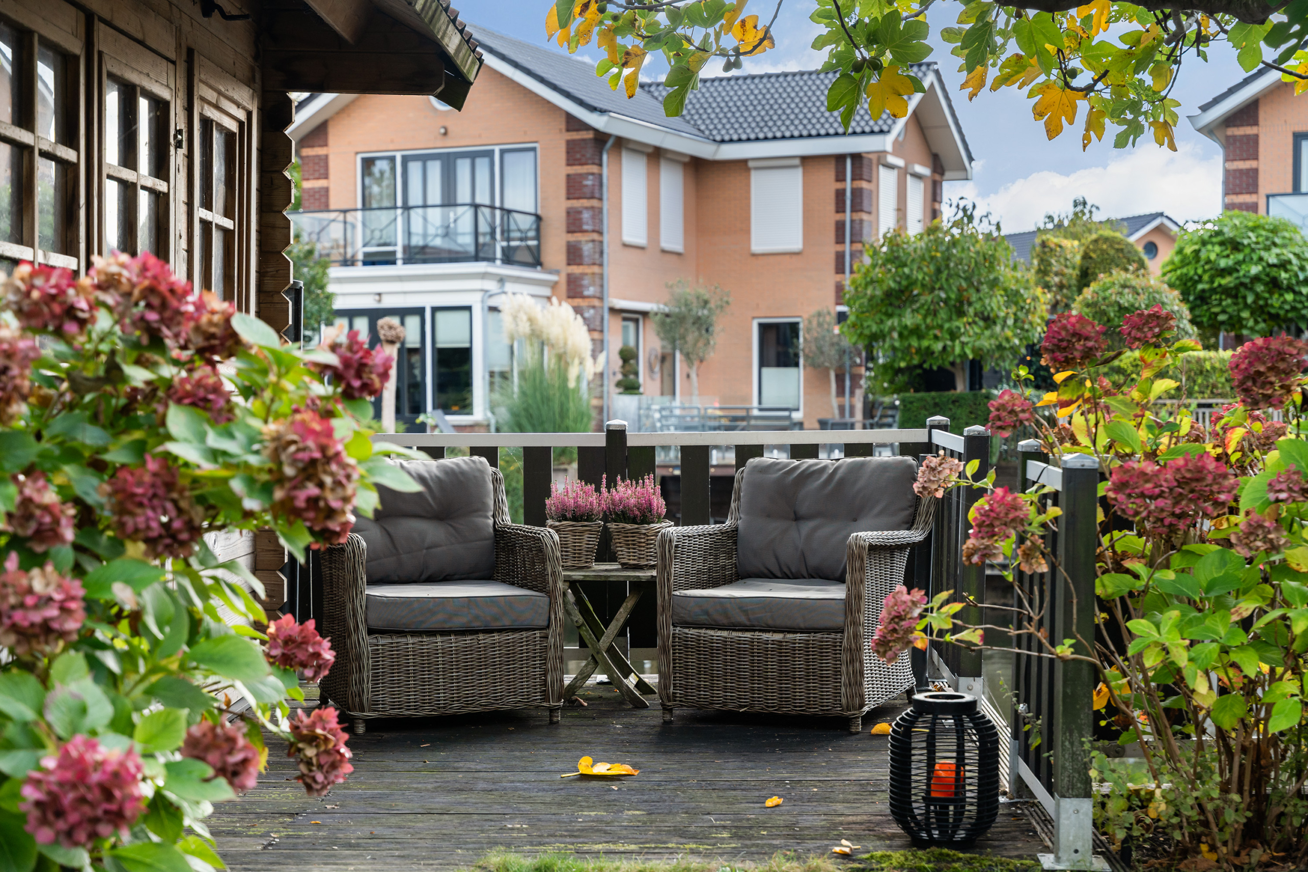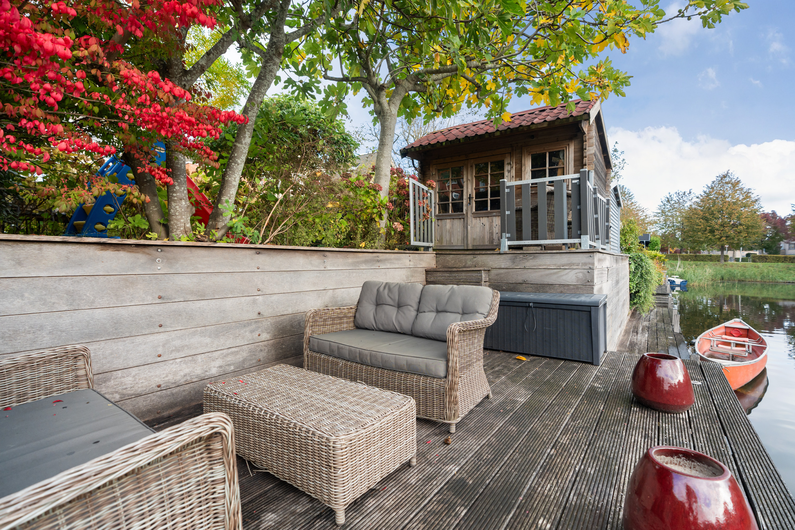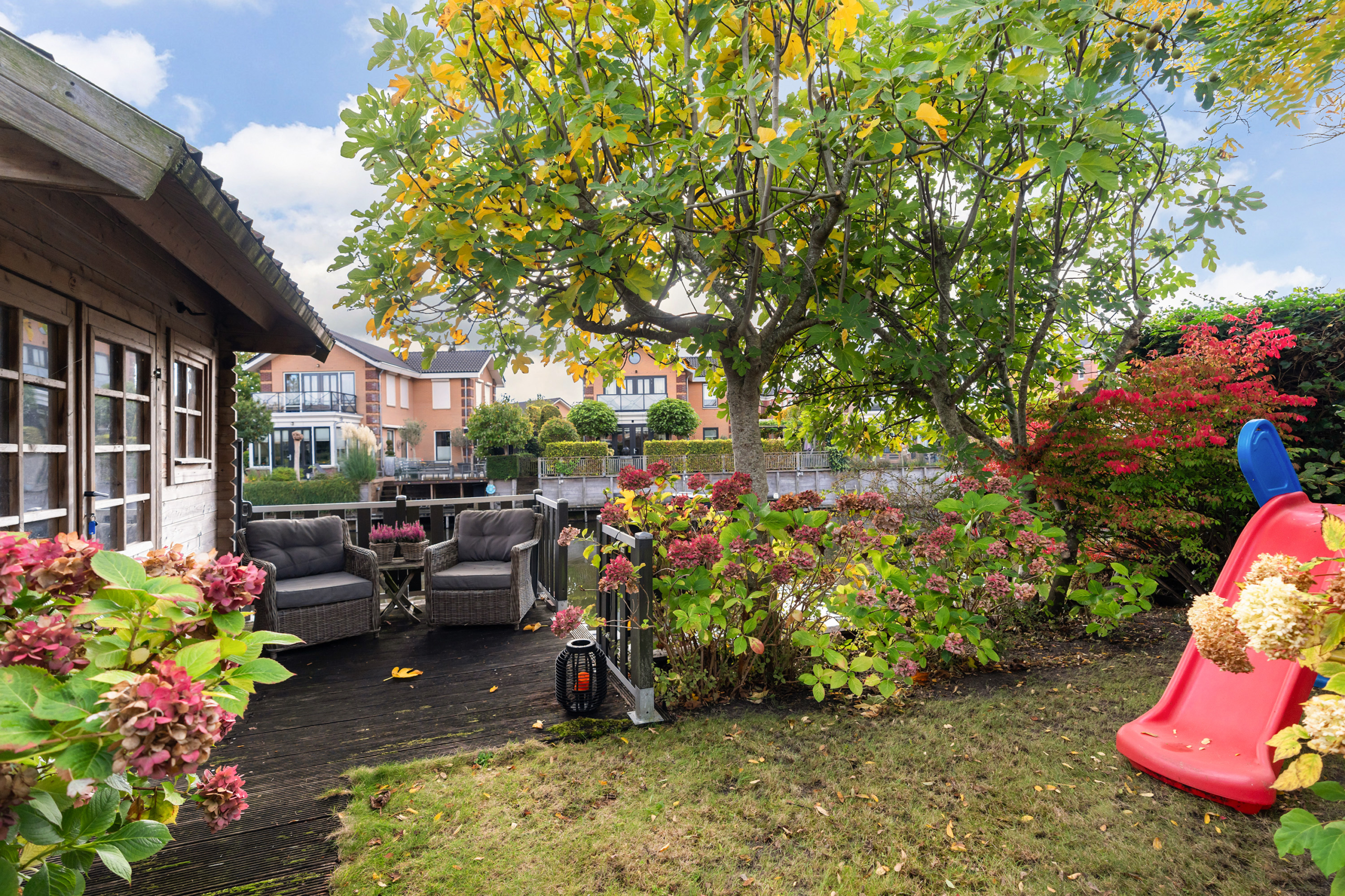 De zonnige tuin biedt veel privacy en is fraai gelegen aan het water. De eigen aanlegsteiger maakt het mogelijk een boot aan te leggen en direct het water op te gaan. Het vlonderterras vormt een prettige zitplek met uitzicht over het water en het natuurgebied. Daarnaast is er een ruim terras met plaats voor een grote eettafel en barbecue. Onder het elektrische zonnescherm op het derde terras gelegen aan de woonkamer is het ook op warme dagen comfortabel verblijven.