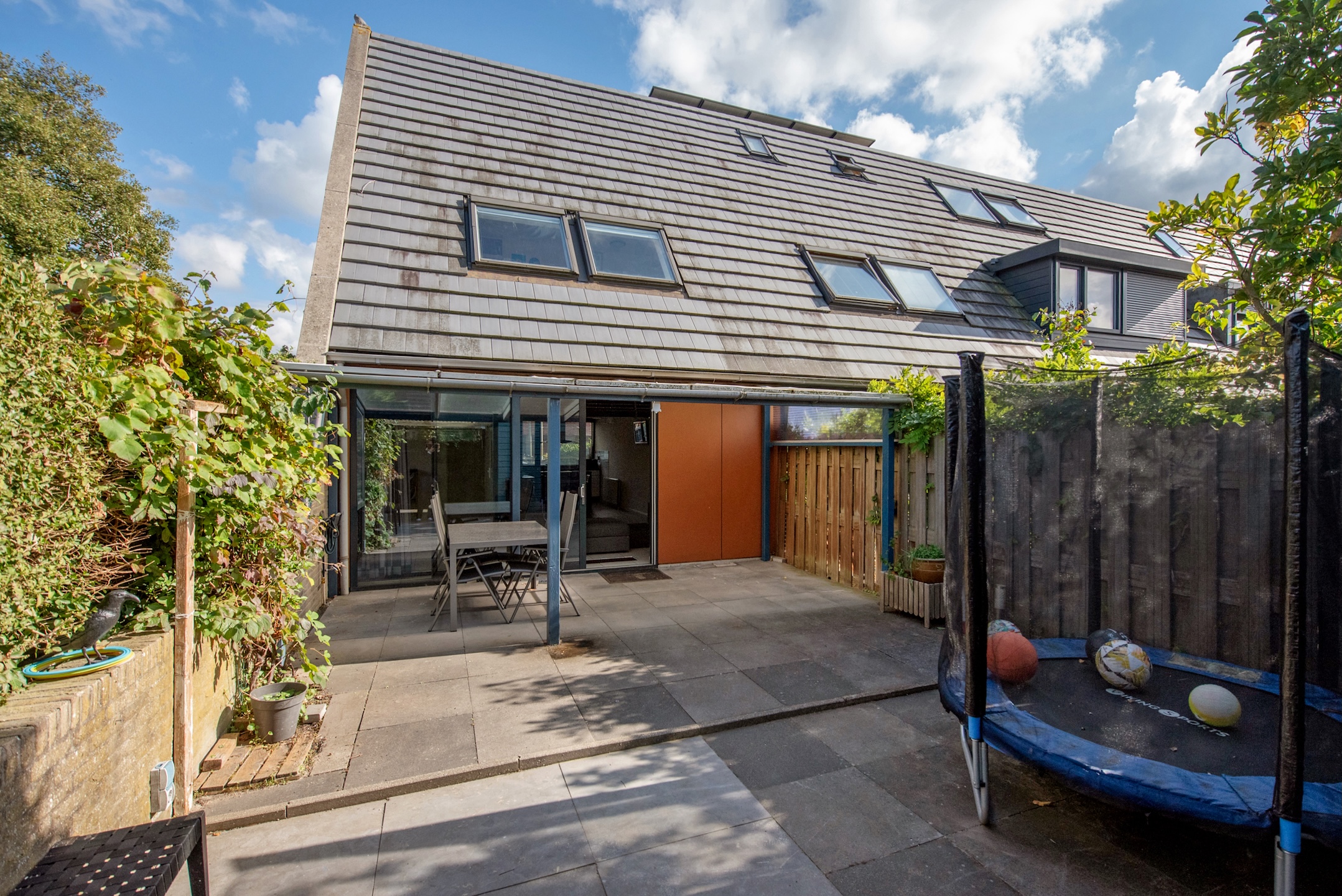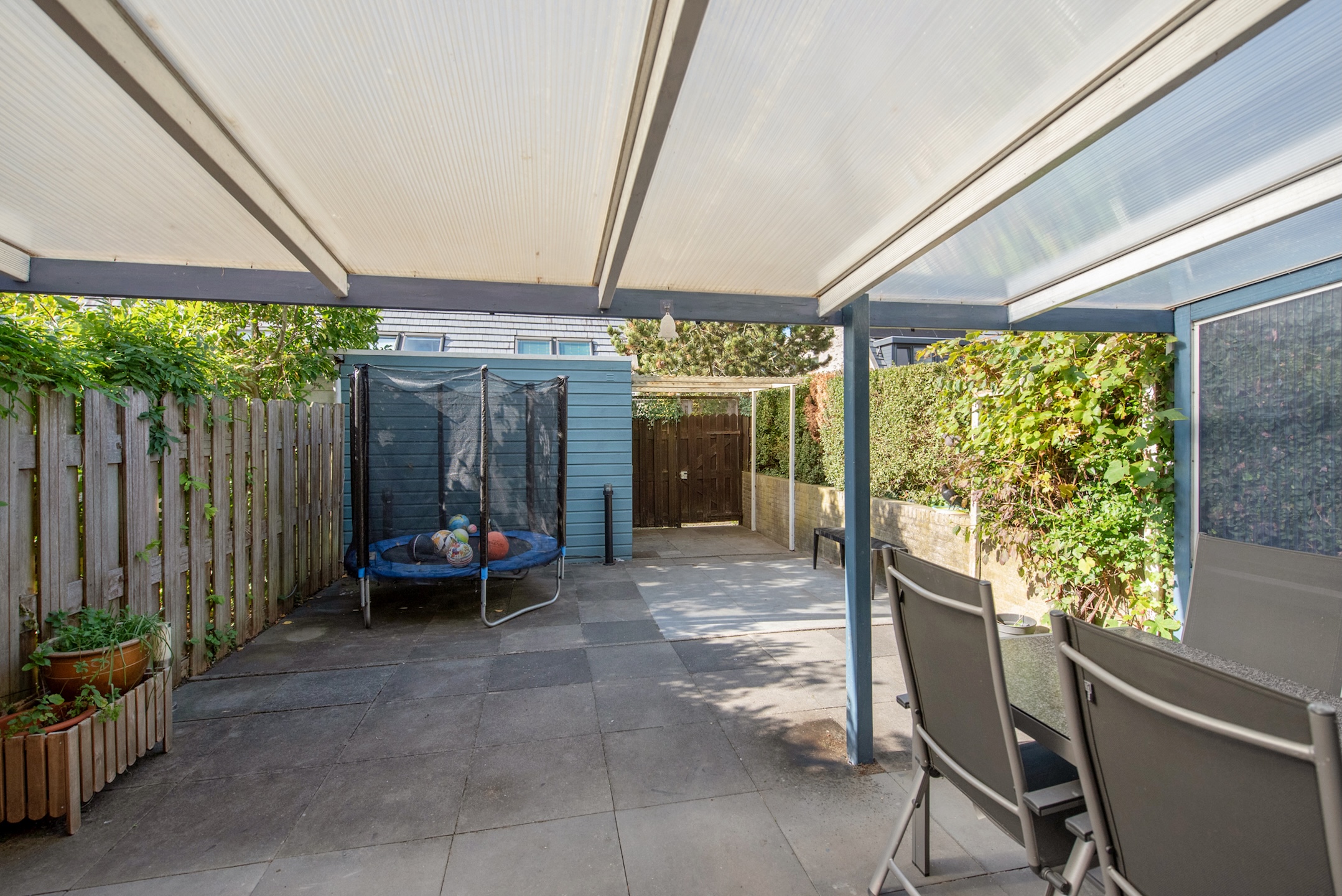 • Zonnige achtertuin met overkapping en ruime buitenberging