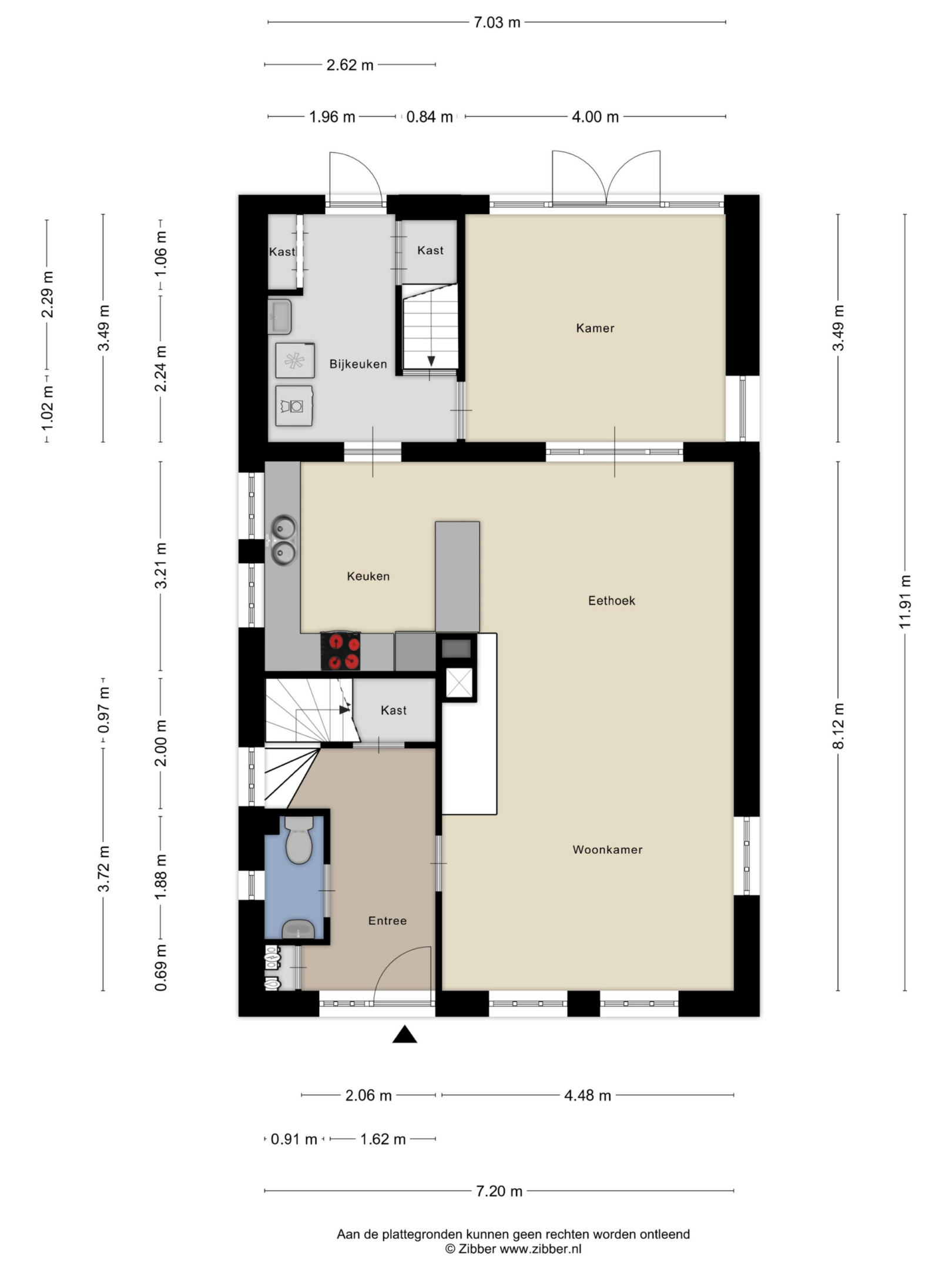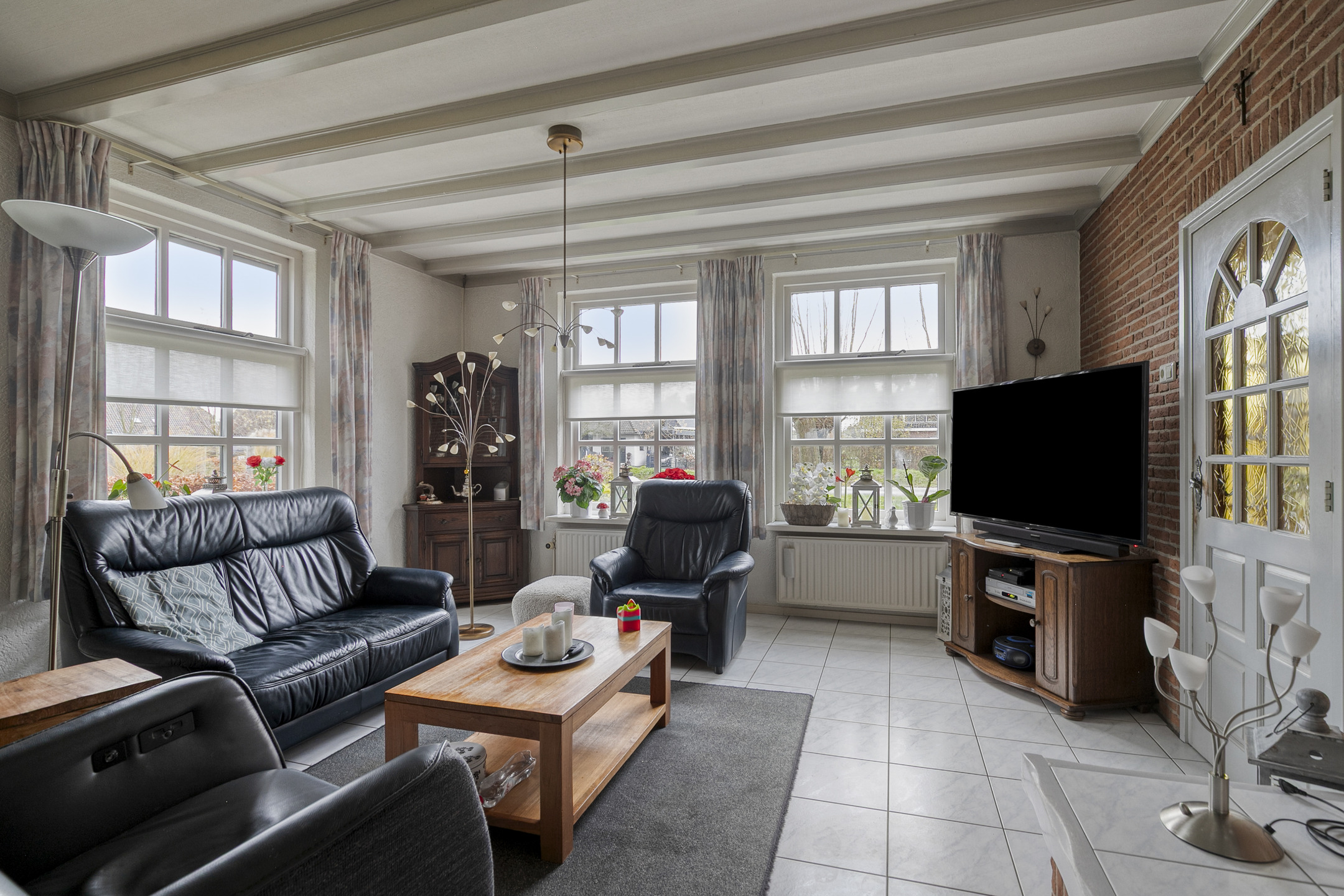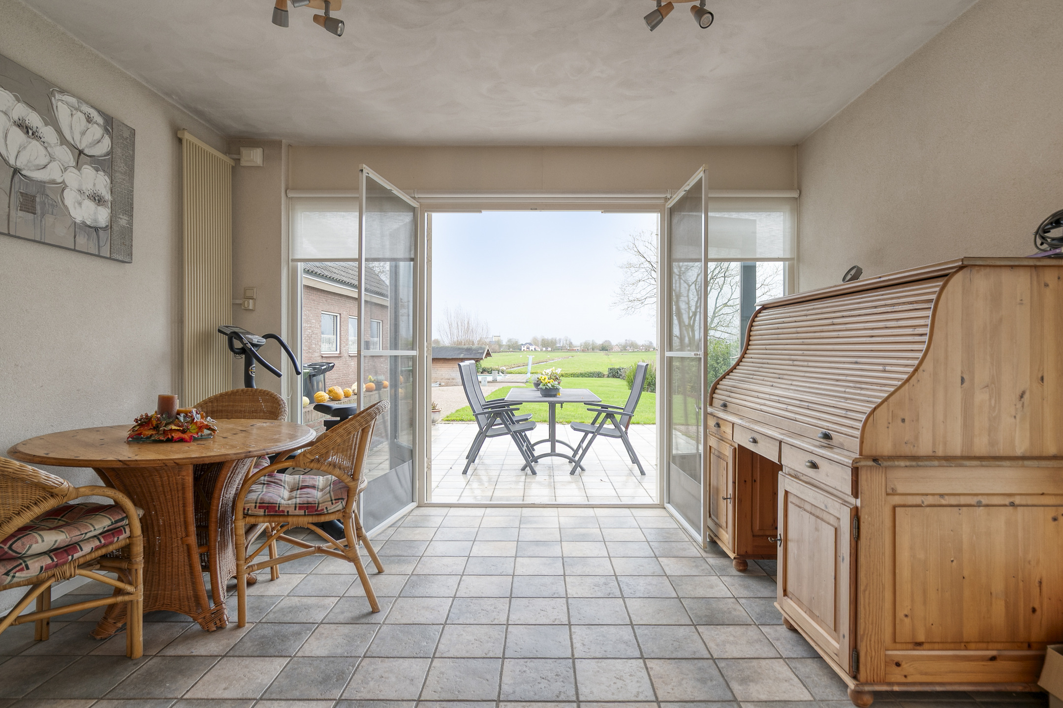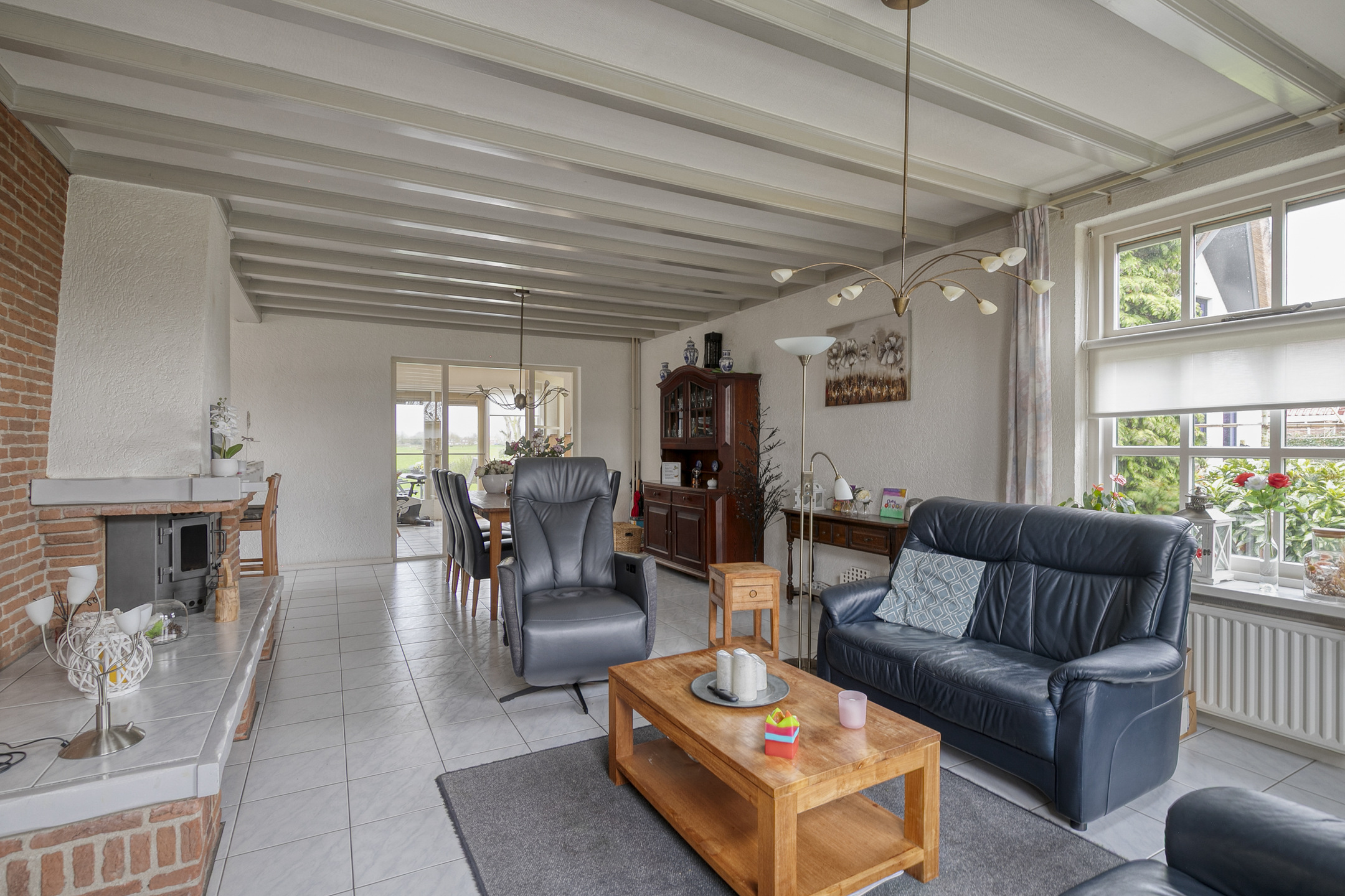 De woonkamer is ingericht met een houthaard en is voorzien van een zitgedeelte en eetgedeelte naast de open keuken met inbouwapparatuur zoals een inductiekookplaat, afzuigkap, koelkast, vaatwasser en elektrische oven. Vanuit de woonkamer bereik je de aanbouw/serre via een glazen pui met deur. Vanuit de keuken loop je direct door naar de bijkeuken, waar je via een 2e deur ook de aanbouw/serre kunt betreden.
