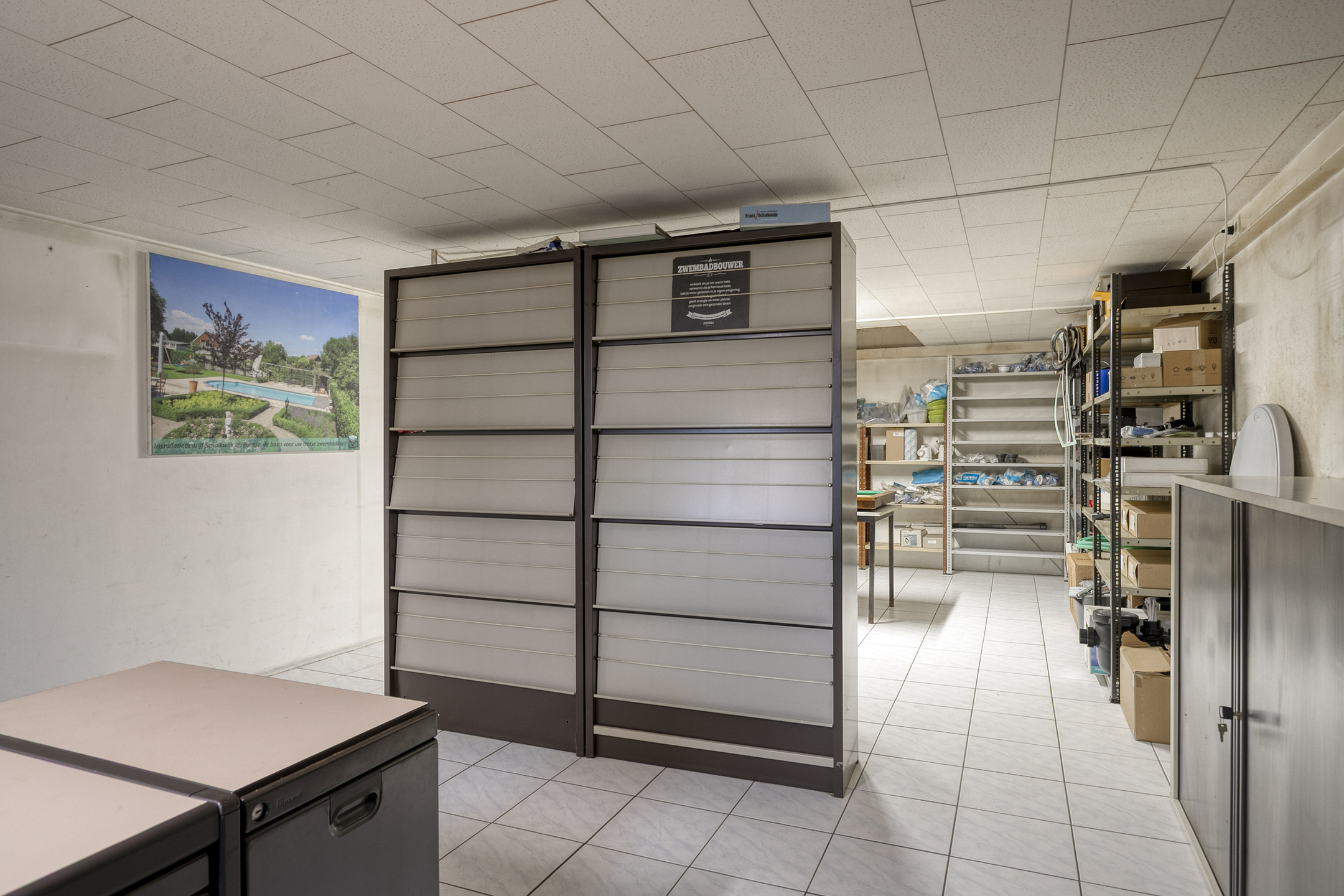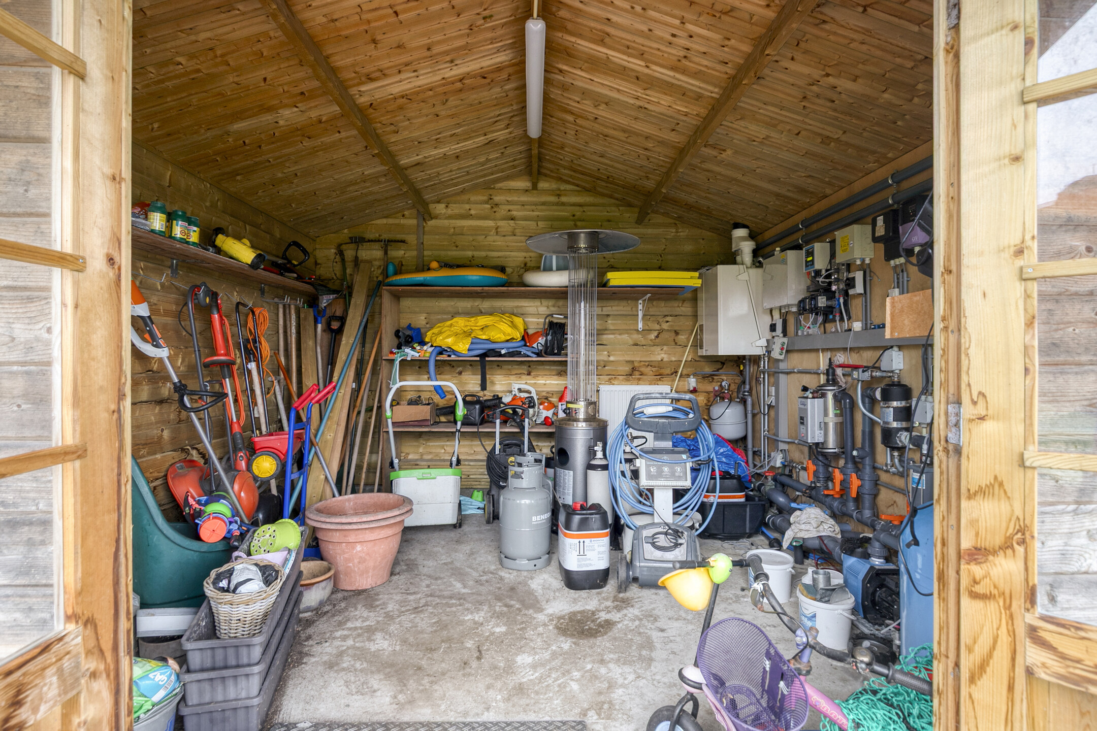 Achter het bijgebouw staat een houten berging met verwarming via een c.v.-ketel, radiator, en elektra. Hier bevindt zich de installatie voor het zwembad dat ervoor zorgt dat het zwembadwater schoon, helder en veilig blijft door te filteren, rond te pompen en automatisch de juiste hoeveelheid chemicaliën toe te voegen.
