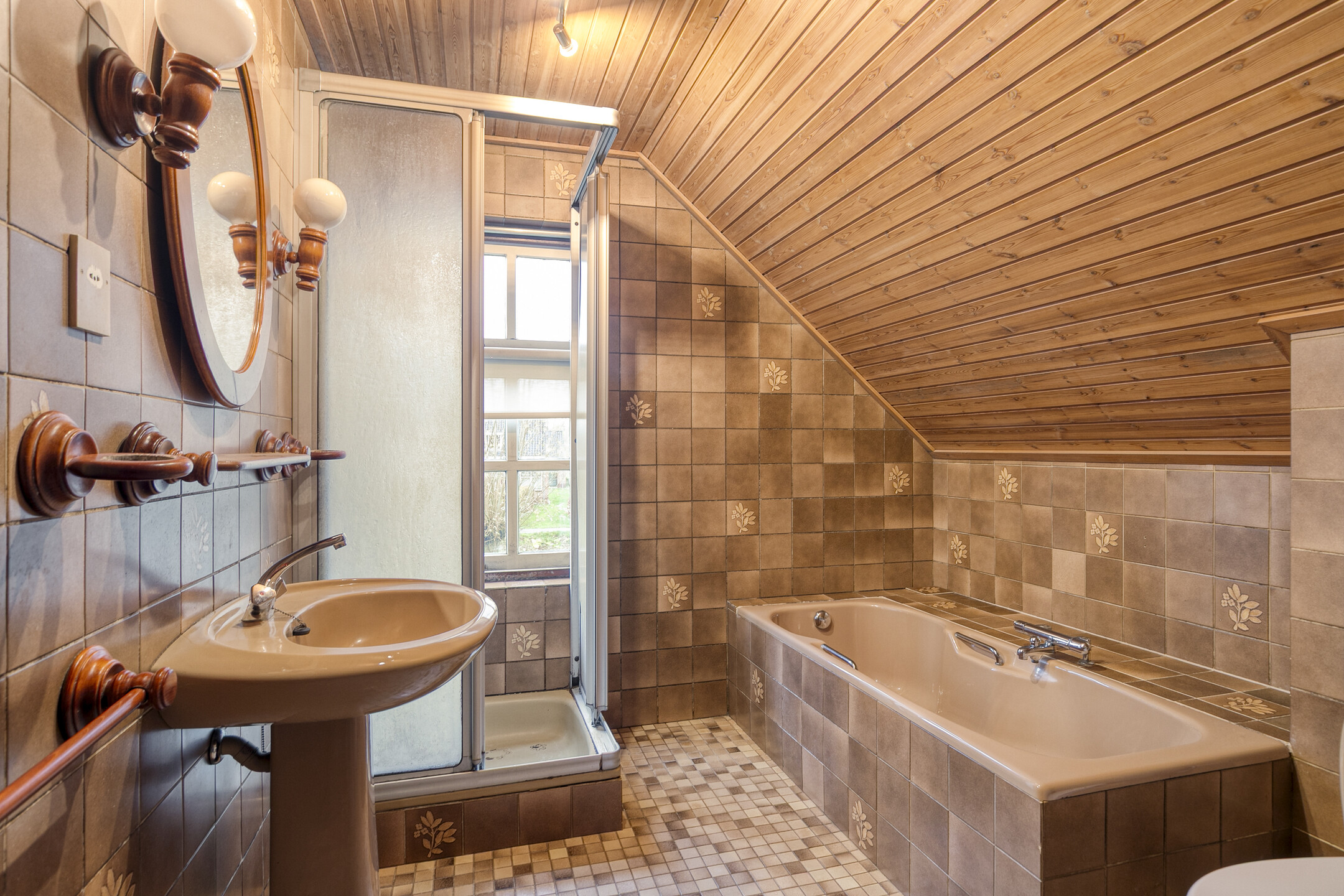 Badkamer: Deze badkamer is voorzien van een wastafel, ligbad en douche en toilet. (badkamer is gedateerd.)