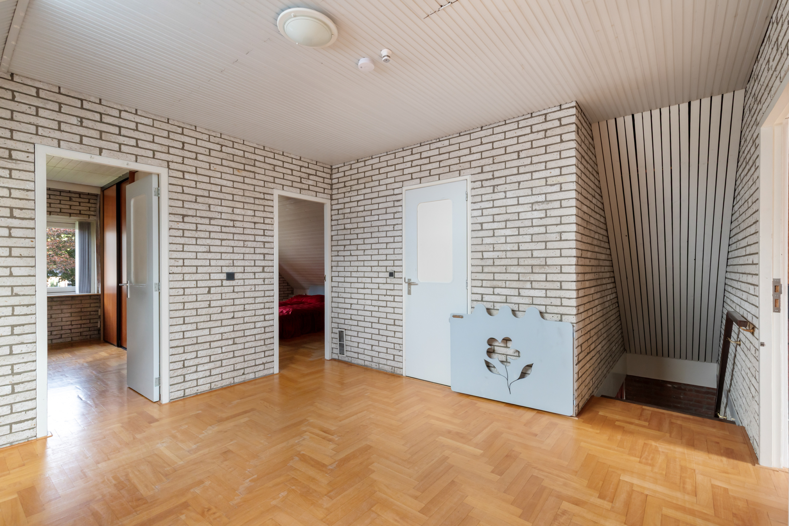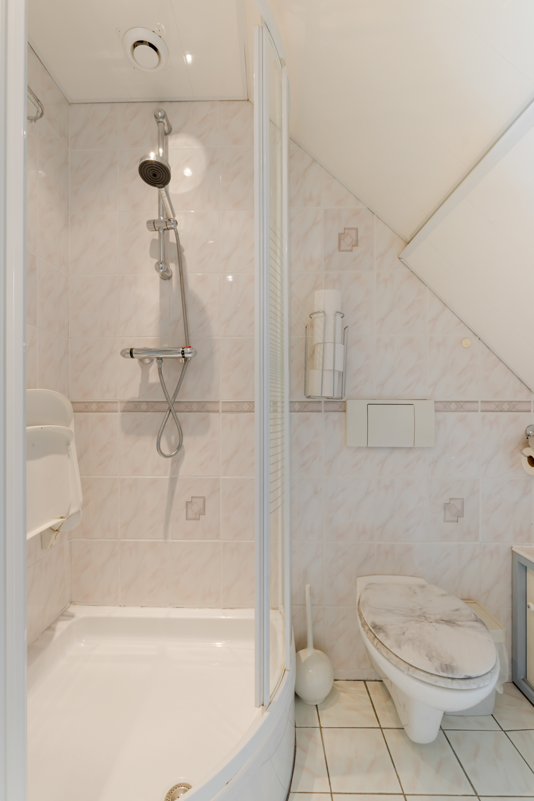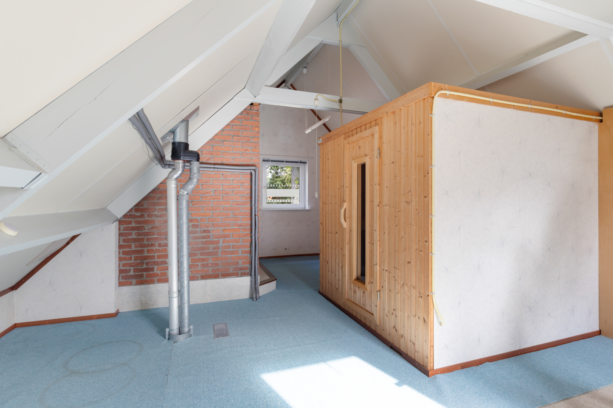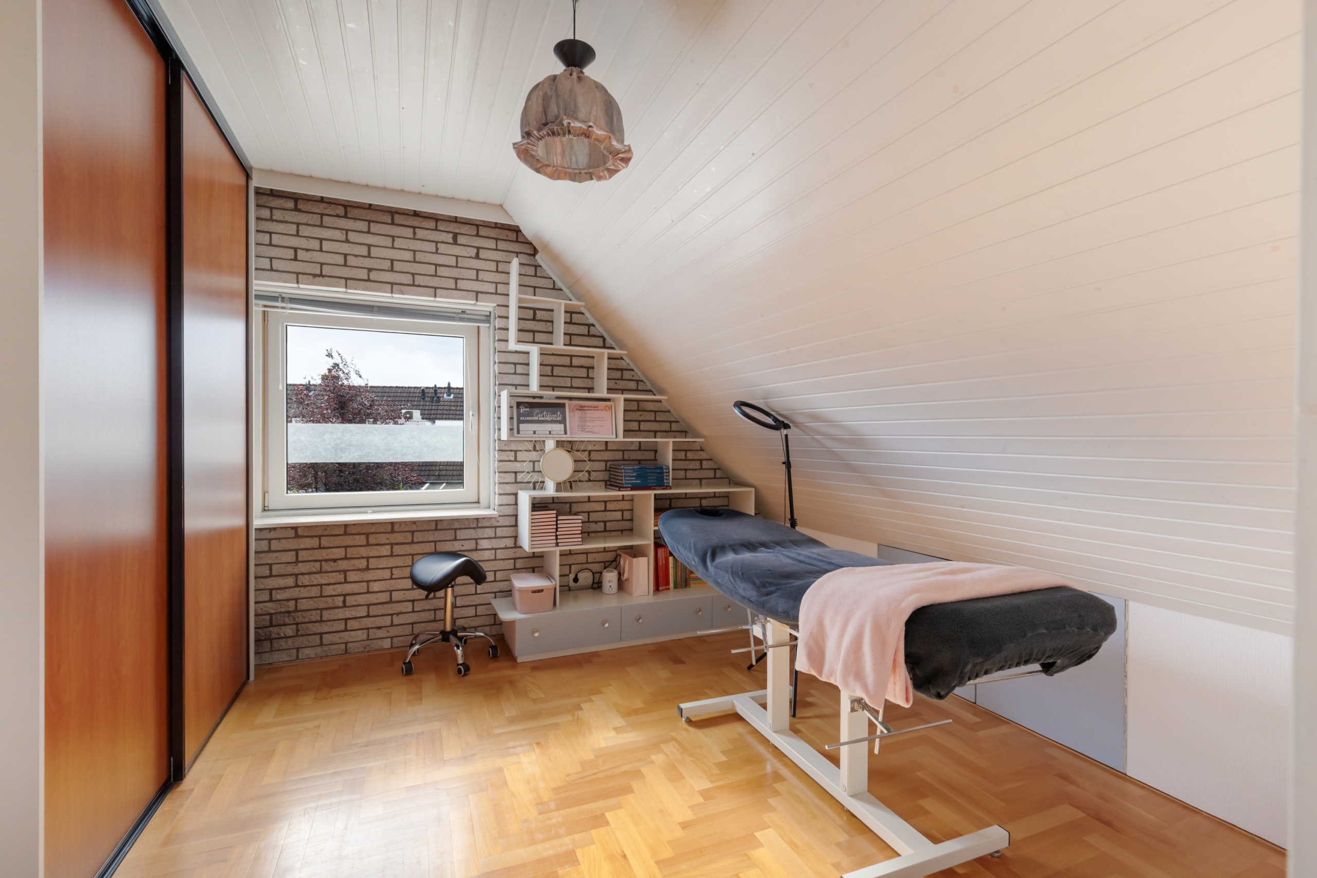 Overloop met toegang tot vier ruime slaapkamers, waarvan 3 voorzien zijn van een wastafel, en een badkamer voorzien van ligbad, douche en toilet. Tevens bevindt zich hier de wasmachine- en drogeraansluiting. Via de vierde slaapkamer heb je ook toegang tot een extra ruimte boven de garage waar zich de opgietsauna bevindt.