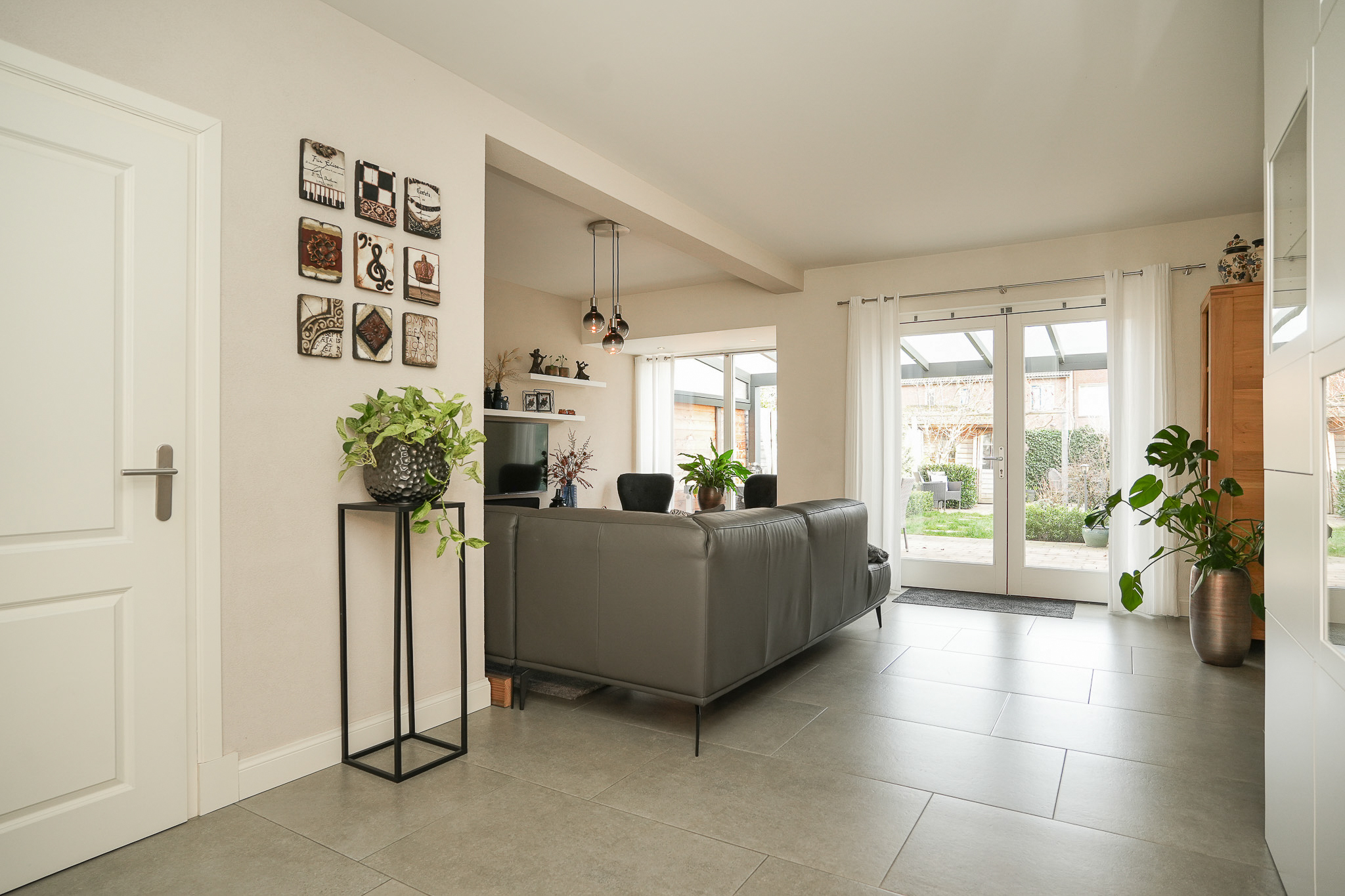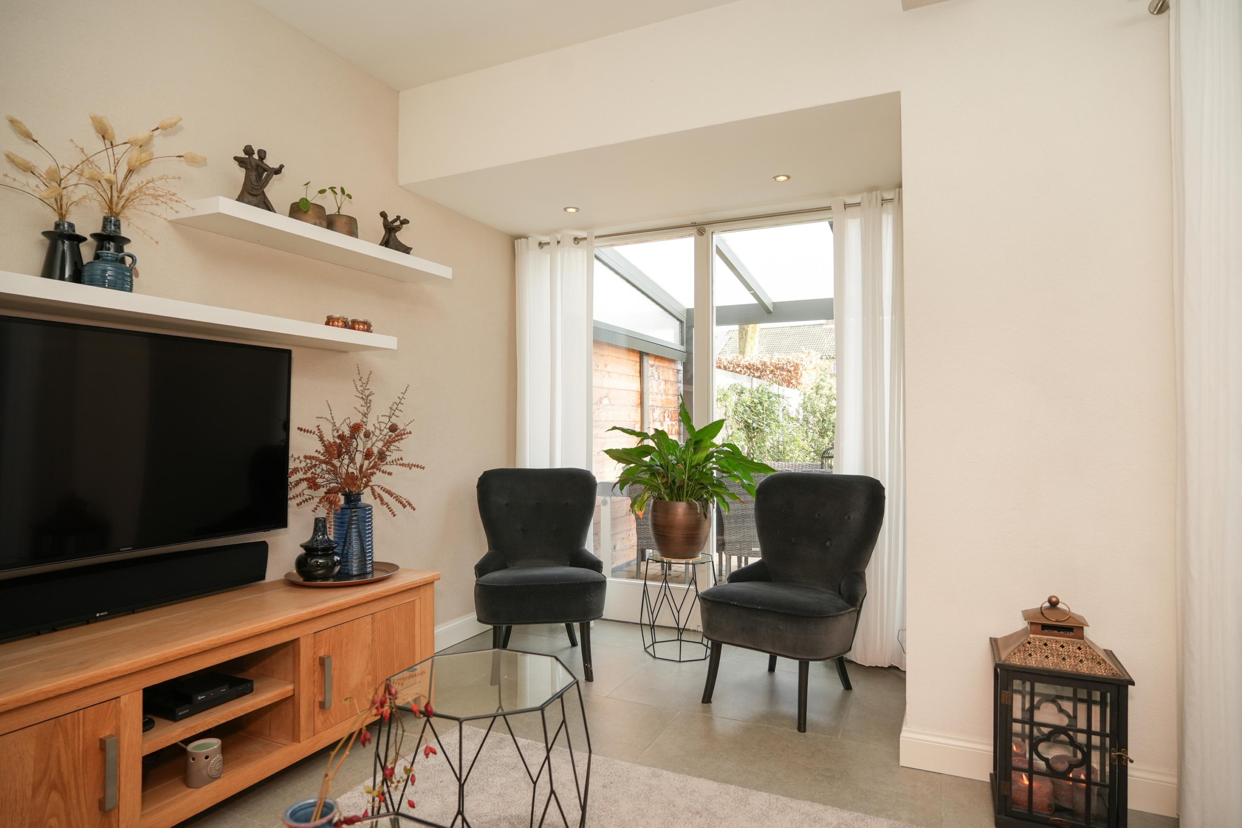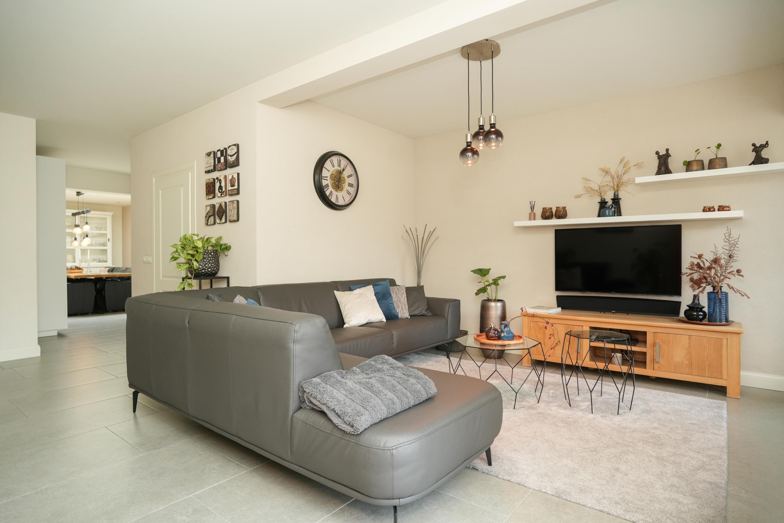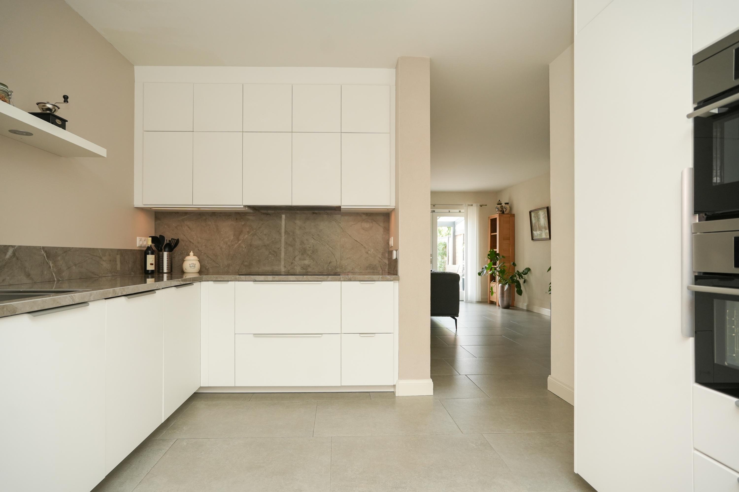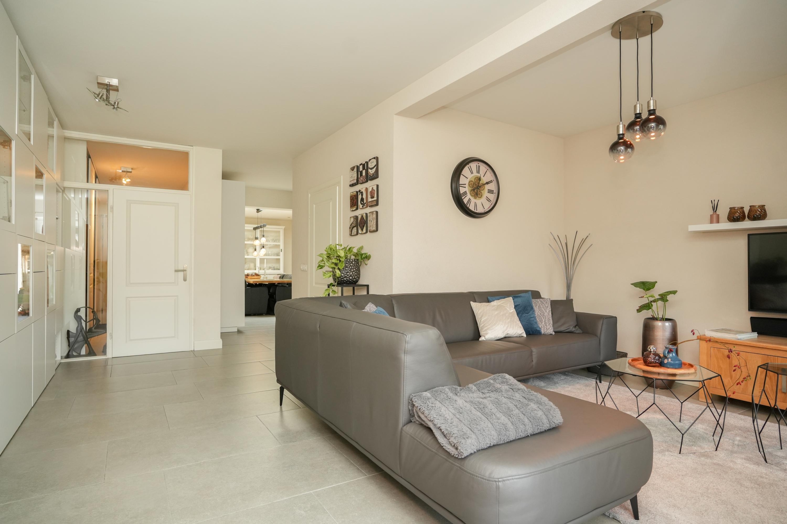 De woonkamer ligt aan de achterzijde van de woning. De woonkamer is, net als de keuken, voorzien van een fraaie vloer met groot formaat tegels met vloerverwarming. Heerlijk comfortabel dus. De grote raampartijen in de woonkamer zorgen voor een prachtig zicht op de diepe achtertuin. Deze tuin is echt bijzonder; door de diepte geniet je hier van veel privacy en is er de hele dag wel een plekje in de zon te vinden. Direct aan de woning grenst een royale overkapping met sfeervolle inbouwverlichting, waardoor je ook op de wat koelere avonden heerlijk buiten kunt zitten. Of je nu droomt van een weelderige groene tuin, een veilige speelplek voor de kinderen of een luxe buitenkeuken: de mogelijkheden zijn eindeloos. De diepte van het perceel geeft een gevoel van vrijheid en rust, waardoor de tuin echt een verlengstuk van je woonplezier wordt.