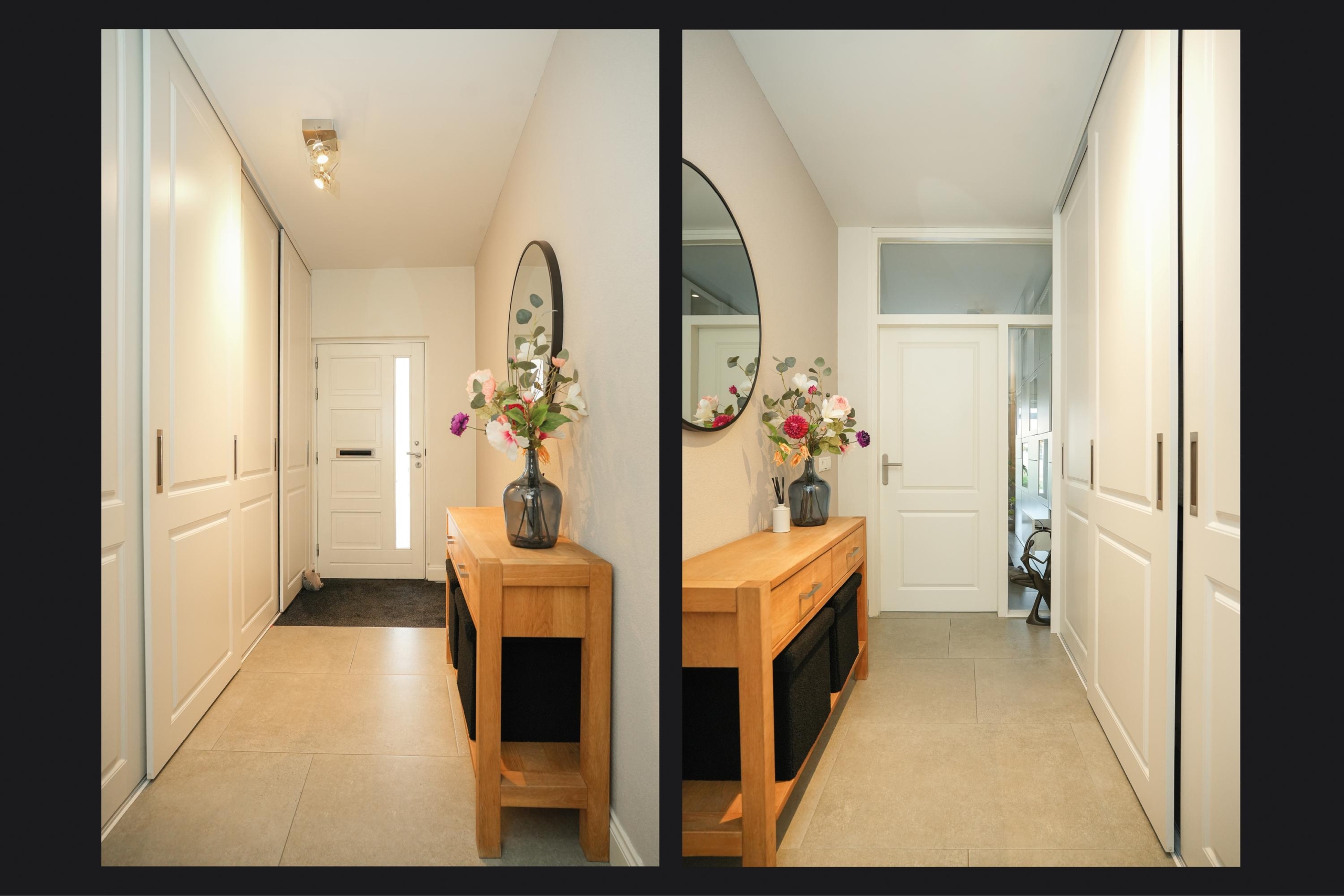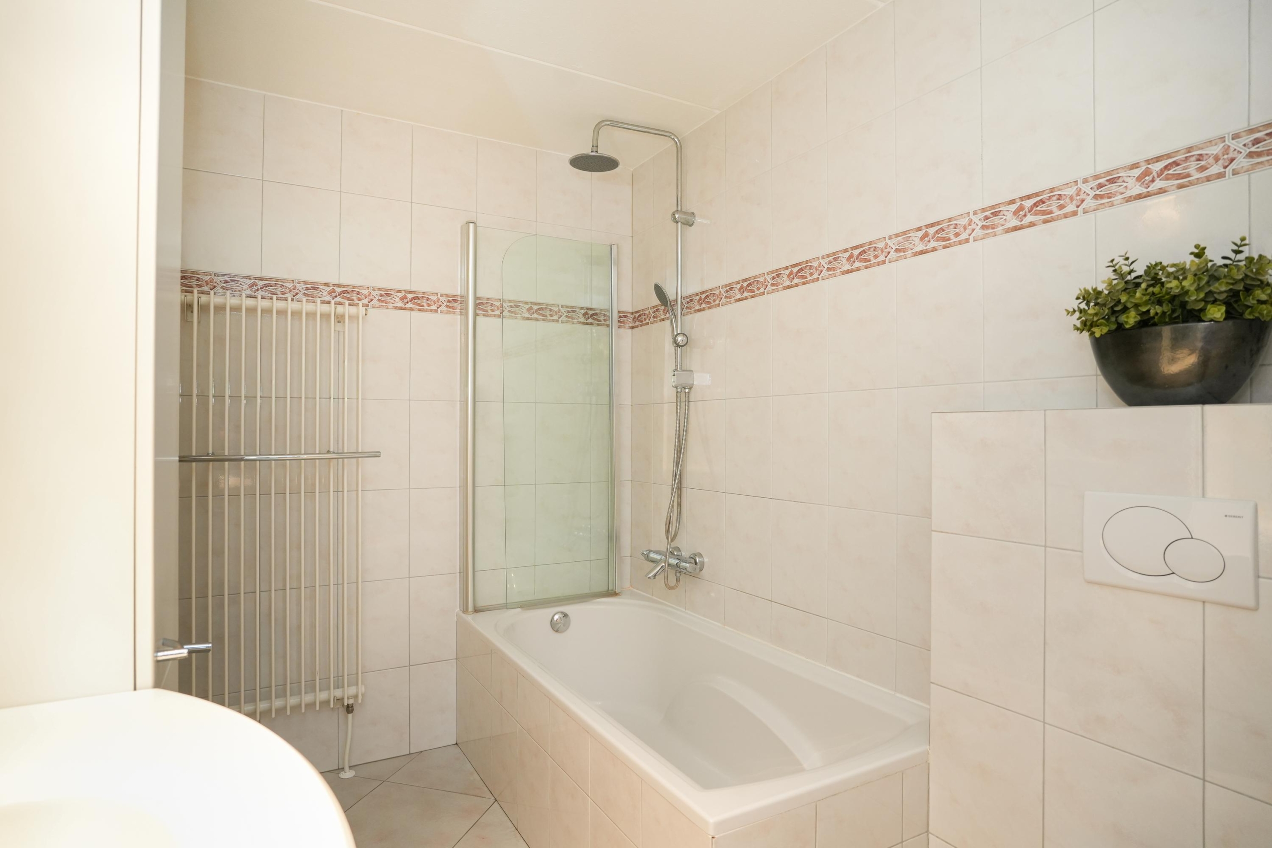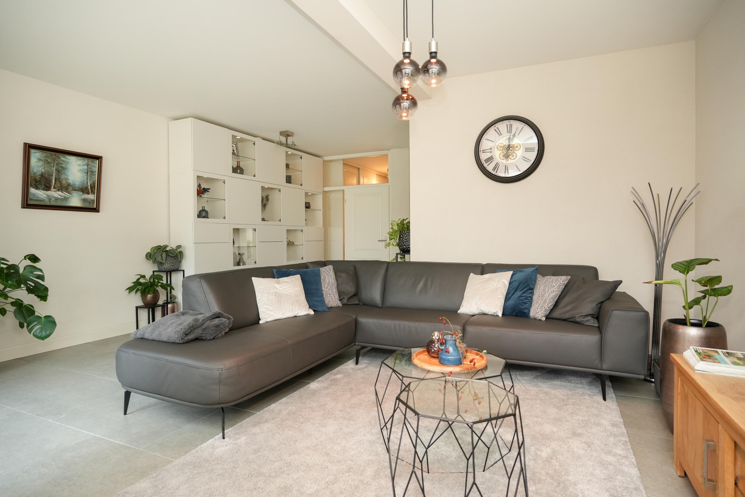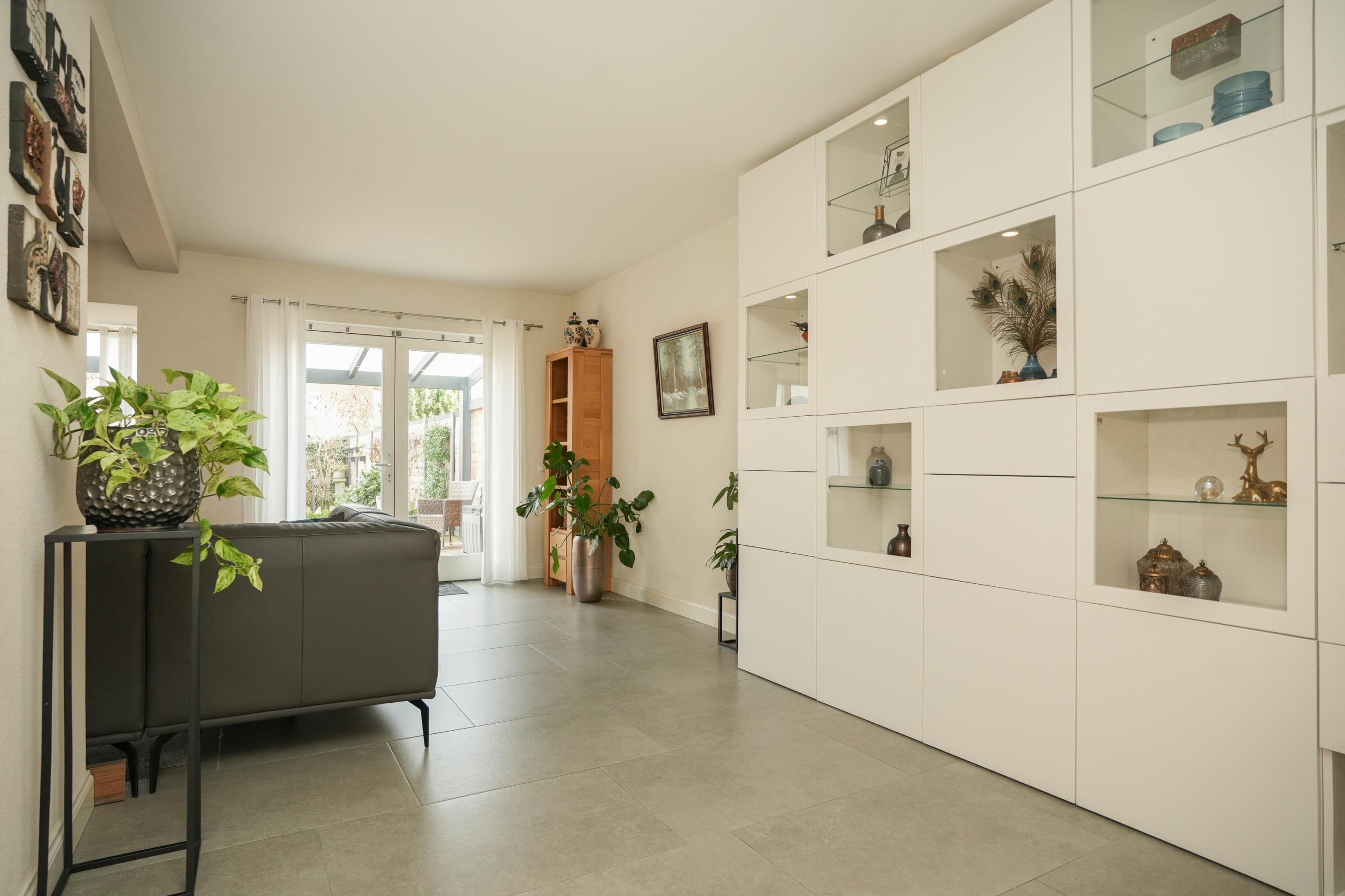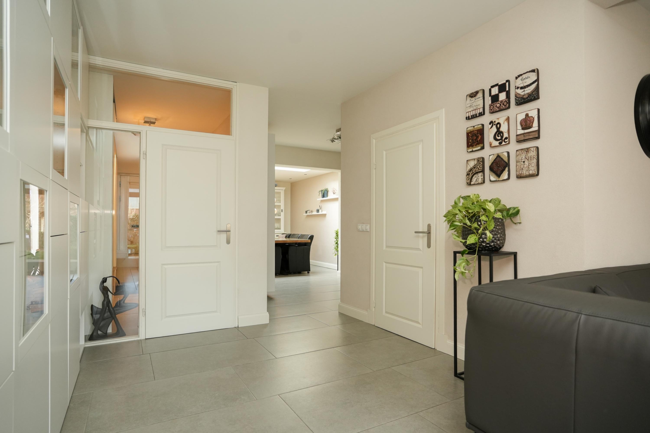 De woonkamer ligt aan de achterzijde van de woning. De woonkamer is, net als de keuken, voorzien van een fraaie vloer met groot formaat tegels met vloerverwarming. Heerlijk comfortabel dus. De grote raampartijen in de woonkamer zorgen voor een prachtig zicht op de diepe achtertuin. Deze tuin is echt bijzonder; door de diepte geniet je hier van veel privacy en is er de hele dag wel een plekje in de zon te vinden. Direct aan de woning grenst een royale overkapping met sfeervolle inbouwverlichting, waardoor je ook op de wat koelere avonden heerlijk buiten kunt zitten. Of je nu droomt van een weelderige groene tuin, een veilige speelplek voor de kinderen of een luxe buitenkeuken: de mogelijkheden zijn eindeloos. De diepte van het perceel geeft een gevoel van vrijheid en rust, waardoor de tuin echt een verlengstuk van je woonplezier wordt.