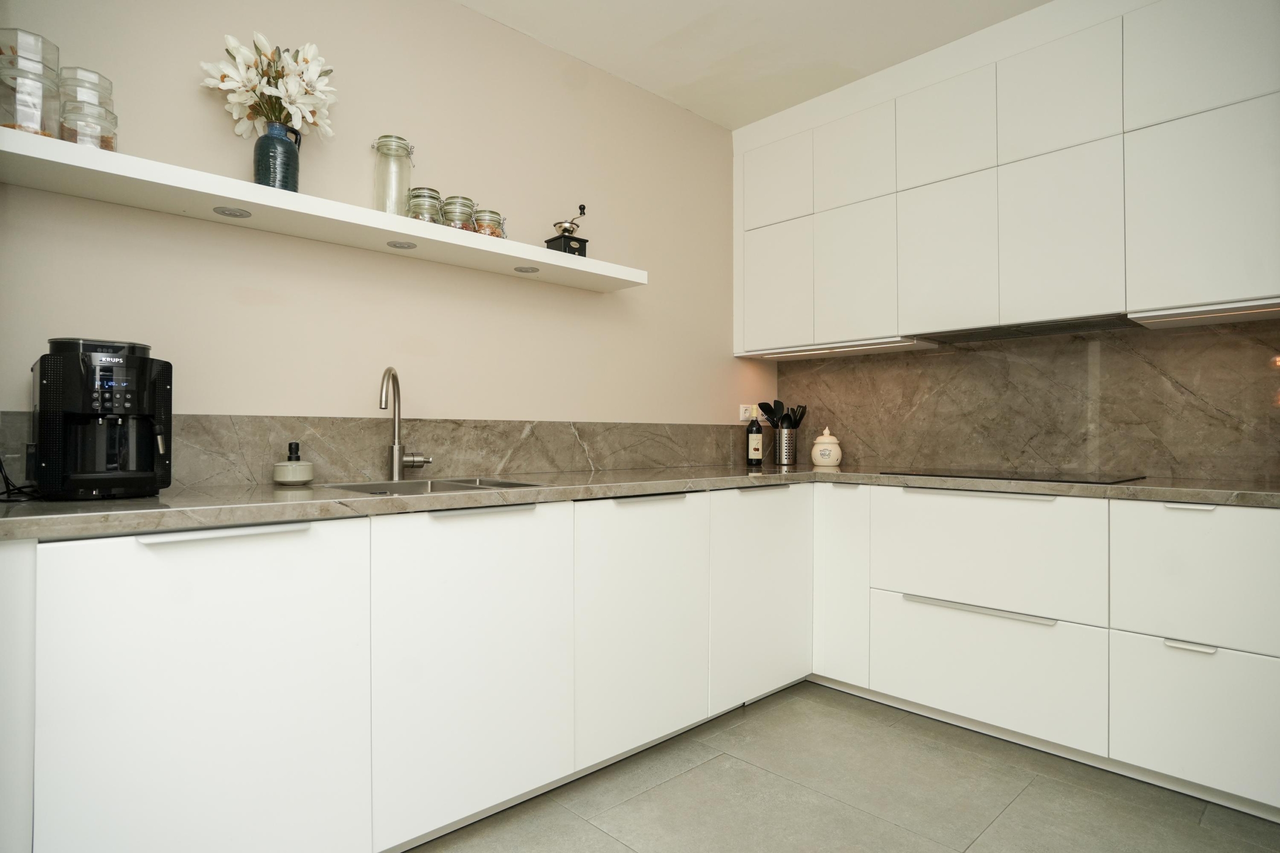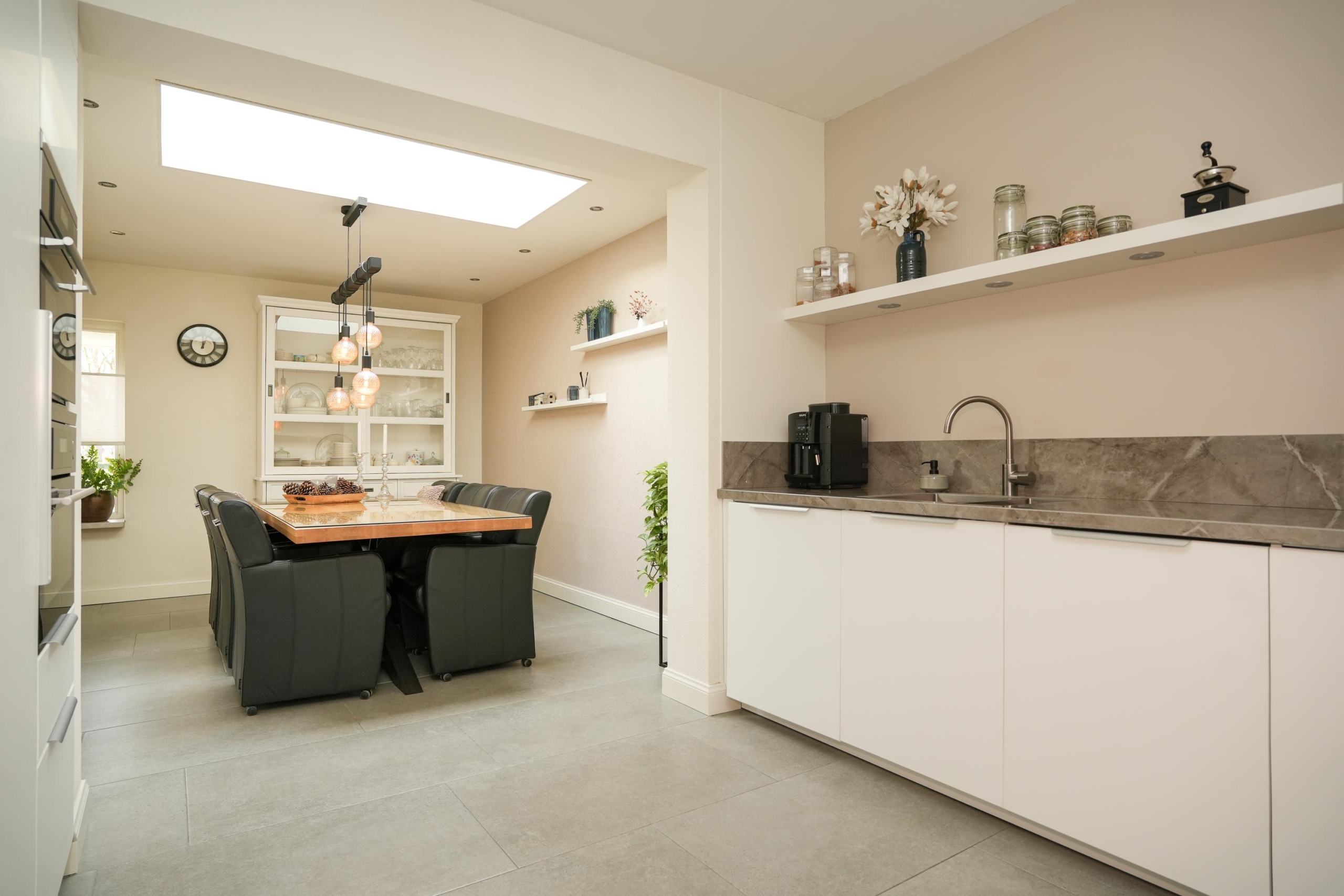 Het absolute hart van deze woning is de royale leefkeuken aan de voorzijde. Door een doordachte uitbouw is hier een ruimte ontstaan die veel meer is dan alleen een plek om te koken. Het is de plek waar je de dag rustig begint met een kop koffie, waar de kinderen na schooltijd hun verhalen delen aan de grote eettafel en waar je tijdens het koken in contact blijft met je gasten. De keuken is voorzien van alle moderne gemakken en inbouwapparatuur. Deze woonkeuken nodigt uit tot lange avonden tafelen en het creëren van mooie herinneringen.