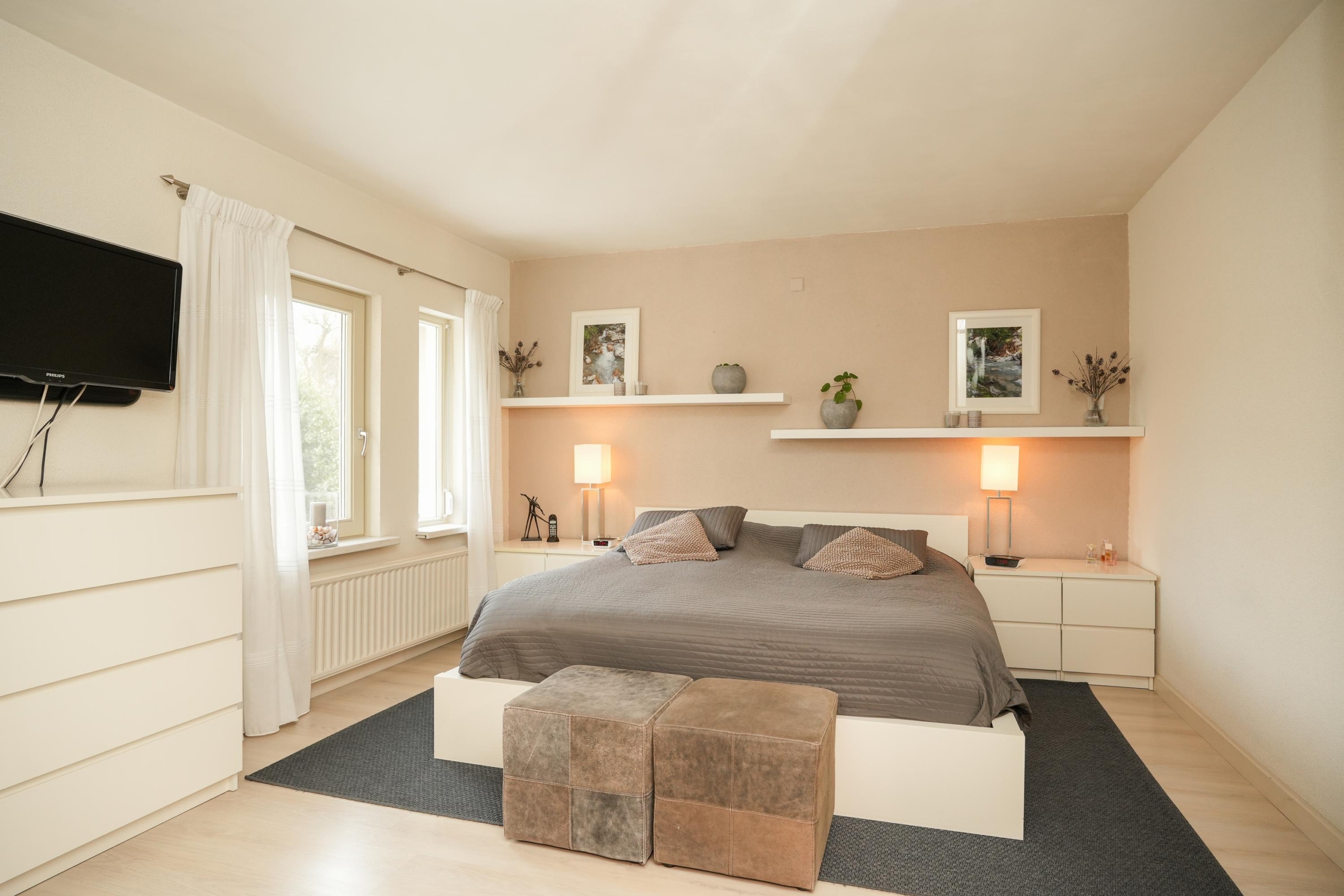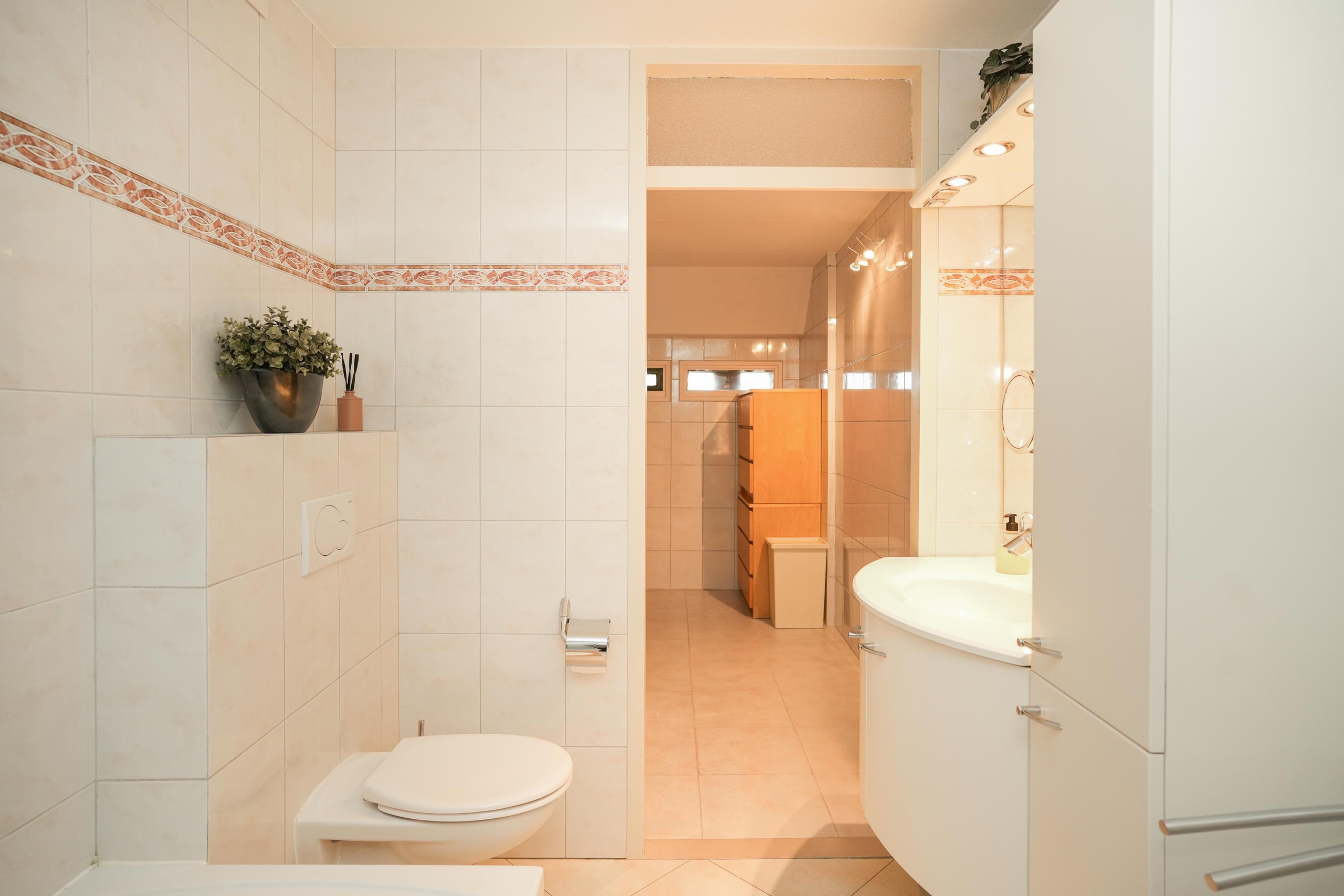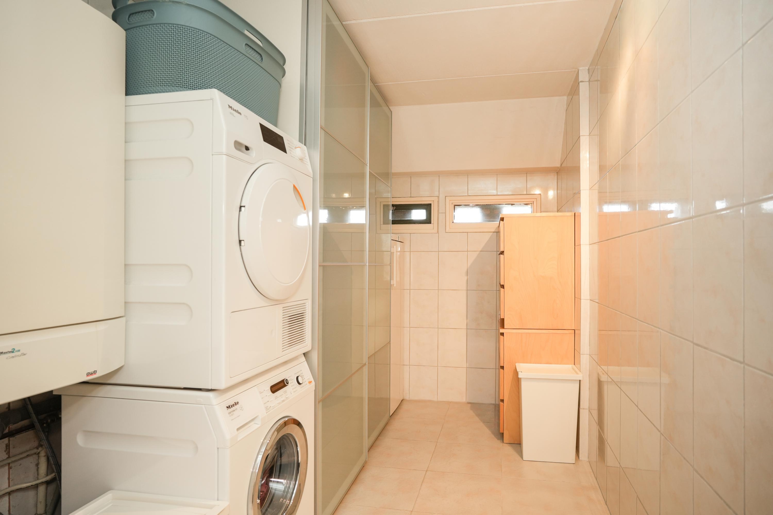 Ook op de verdiepingen komen de royale maten terug. De hoofdslaapkamer is met recht royaal te noemen en biedt meer dan genoeg ruimte voor een grote kastenwand en een gezellig zitje. Indien gewenst is deze kamer zelfs eenvoudig onder te verdelen in twee slaapkamers, of een slaapkamer met een aangrenzende walk-in closet. De tweede slaapkamer op deze verdieping is met haar afmetingen eveneens flink te noemen. Verder tref je op deze etage de badkamer aan, met aansluitend een praktische was- en bergruimte. De badkamer is voorzien van een bad-douchecombinatie, wastafelmeubel en toilet. In de wasruimte vind je de aansluitingen voor je wasmachine en droger, de opstelplaats voor de cv-ketel en ontzettend veel extra opbergruimte.