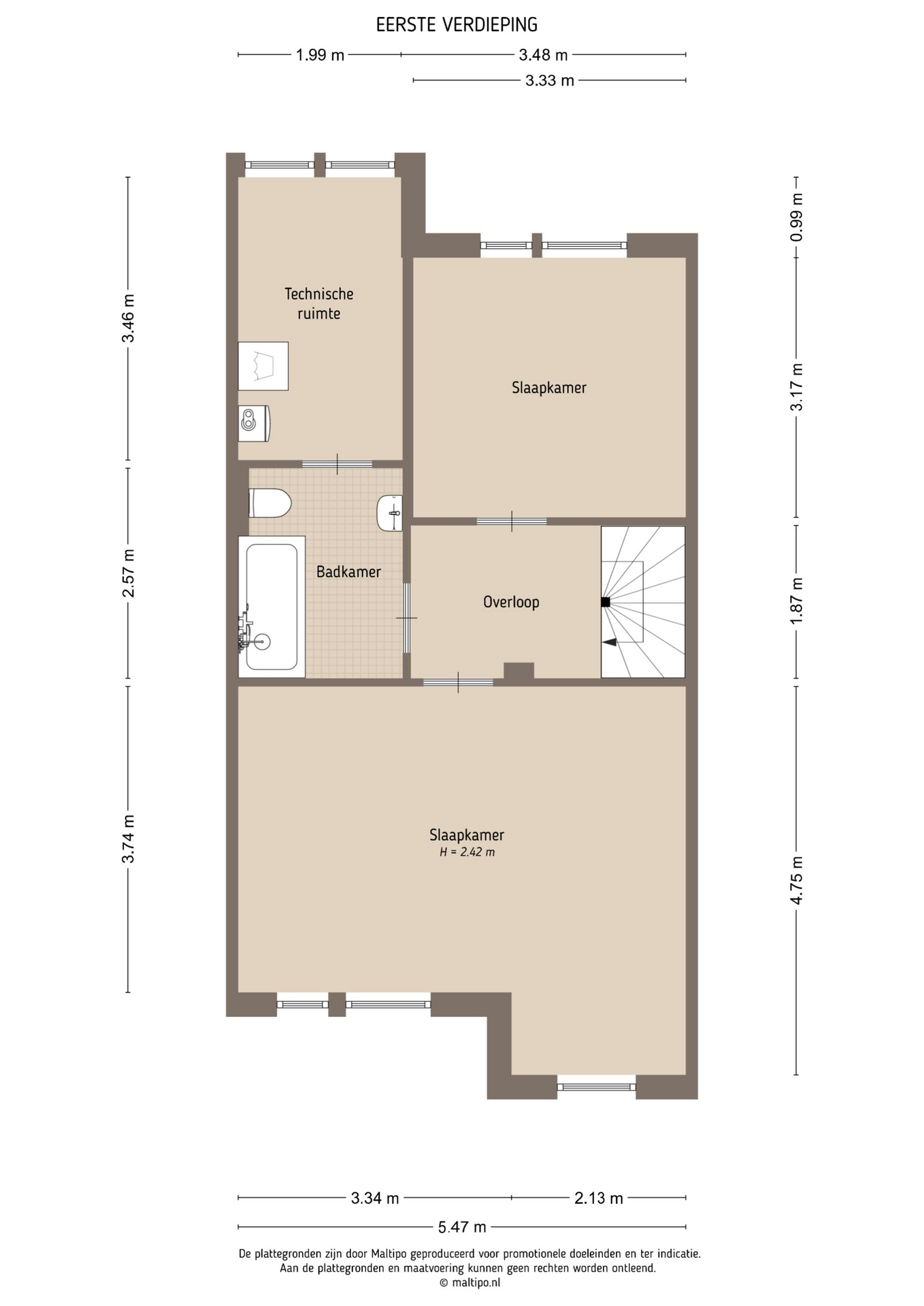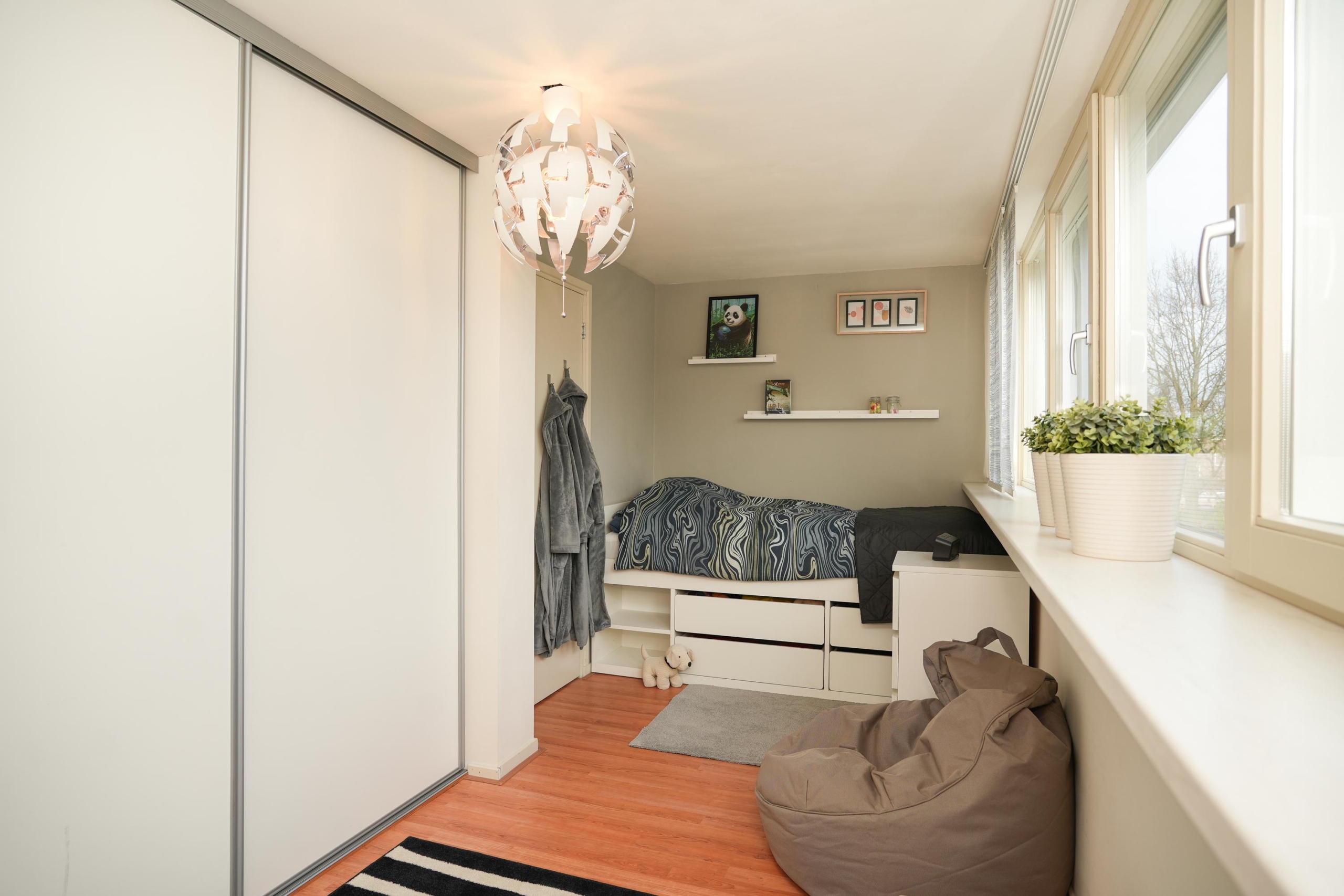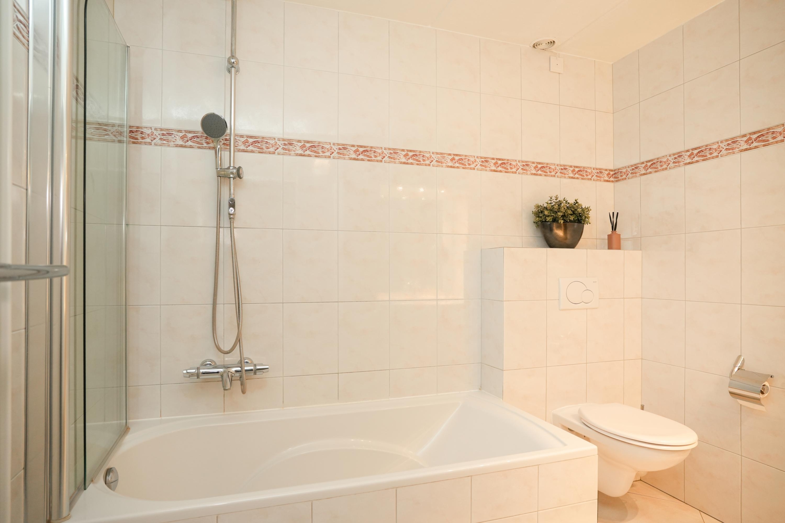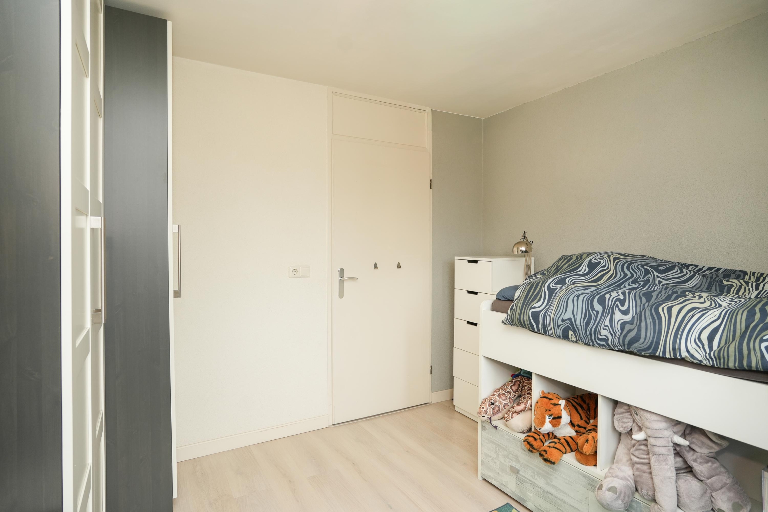 Ook op de verdiepingen komen de royale maten terug. De hoofdslaapkamer is met recht royaal te noemen en biedt meer dan genoeg ruimte voor een grote kastenwand en een gezellig zitje. Indien gewenst is deze kamer zelfs eenvoudig onder te verdelen in twee slaapkamers, of een slaapkamer met een aangrenzende walk-in closet. De tweede slaapkamer op deze verdieping is met haar afmetingen eveneens flink te noemen. Verder tref je op deze etage de badkamer aan, met aansluitend een praktische was- en bergruimte. De badkamer is voorzien van een bad-douchecombinatie, wastafelmeubel en toilet. In de wasruimte vind je de aansluitingen voor je wasmachine en droger, de opstelplaats voor de cv-ketel en ontzettend veel extra opbergruimte.