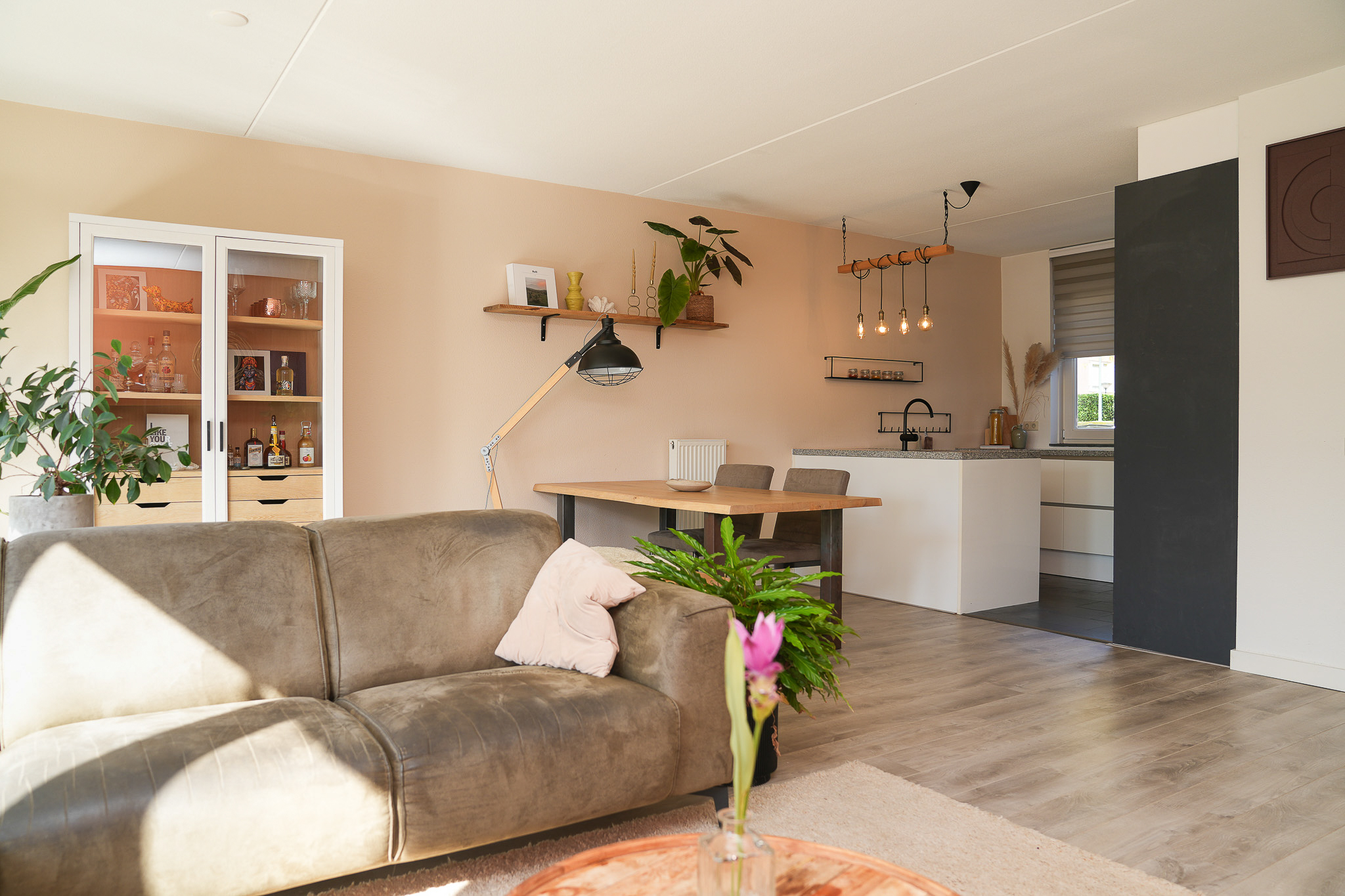 De brede, tuingerichte woonkamer is door de grote raampartij met openslaande deuren heerlijk licht. Er is meer dan genoeg ruimte voor een royale zithoek en een flinke eettafel. De complete keuken met spoeleiland is aan de voorzijde gelegen. Deze beschikt over veel werk- en opbergruimte en is voorzien van een granieten werkblad, keramische kookplaat, afzuigkap, koelkast, vaatwasser, oven en magnetron.