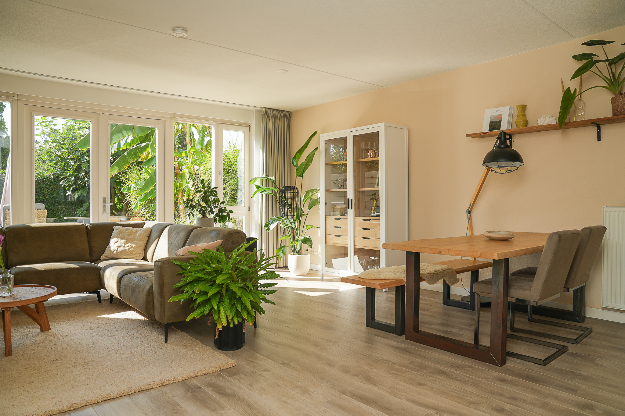 Via de openslaande deuren bereikt u de zonnige achtertuin. Deze is onderhoudsarm ingericht, zodat u meer tijd heeft om te genieten van de zon, die tot laat in de avond in de tuin staat. Achter de tuin bevinden zich geen directe buren; hier ligt een flink plantsoen.