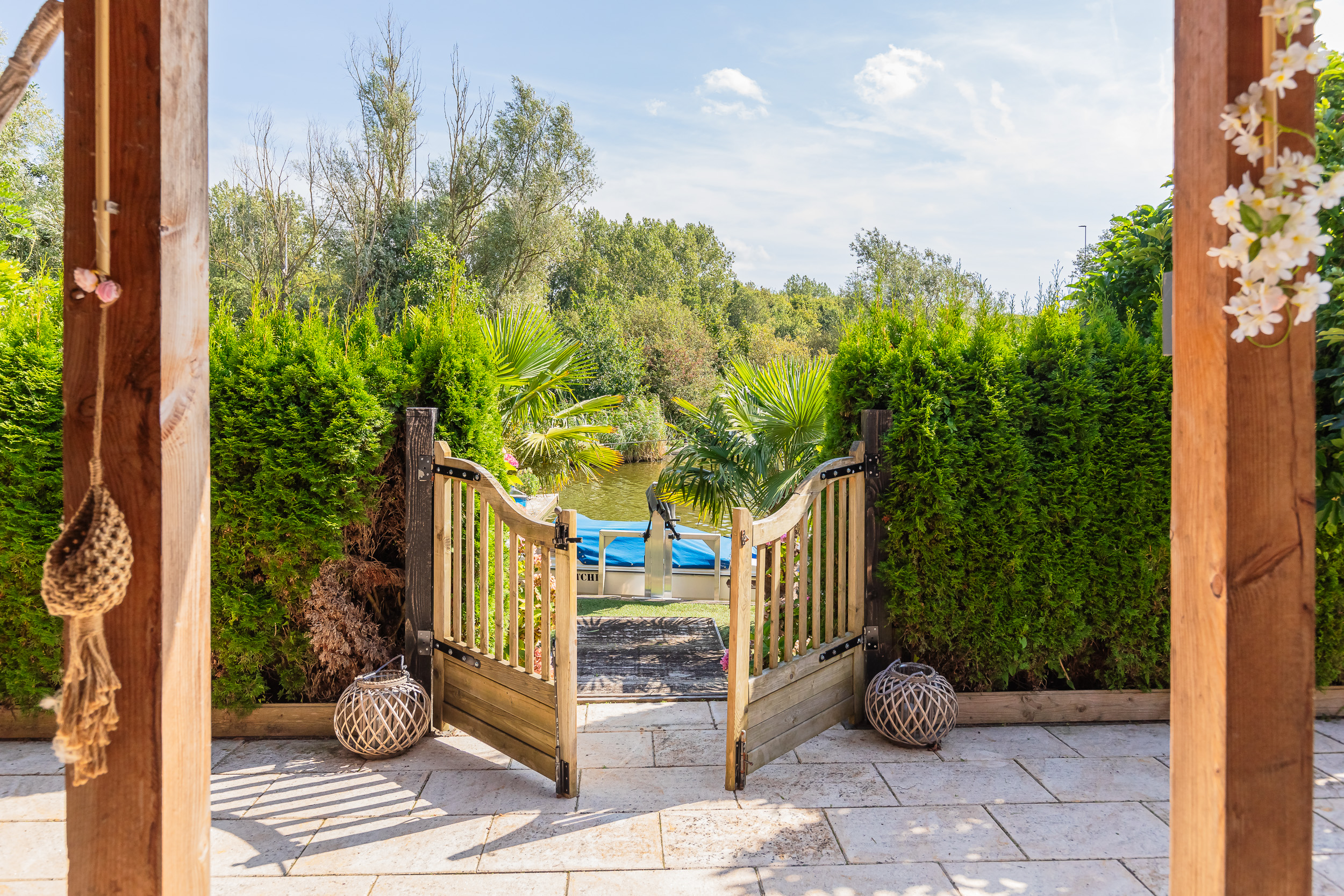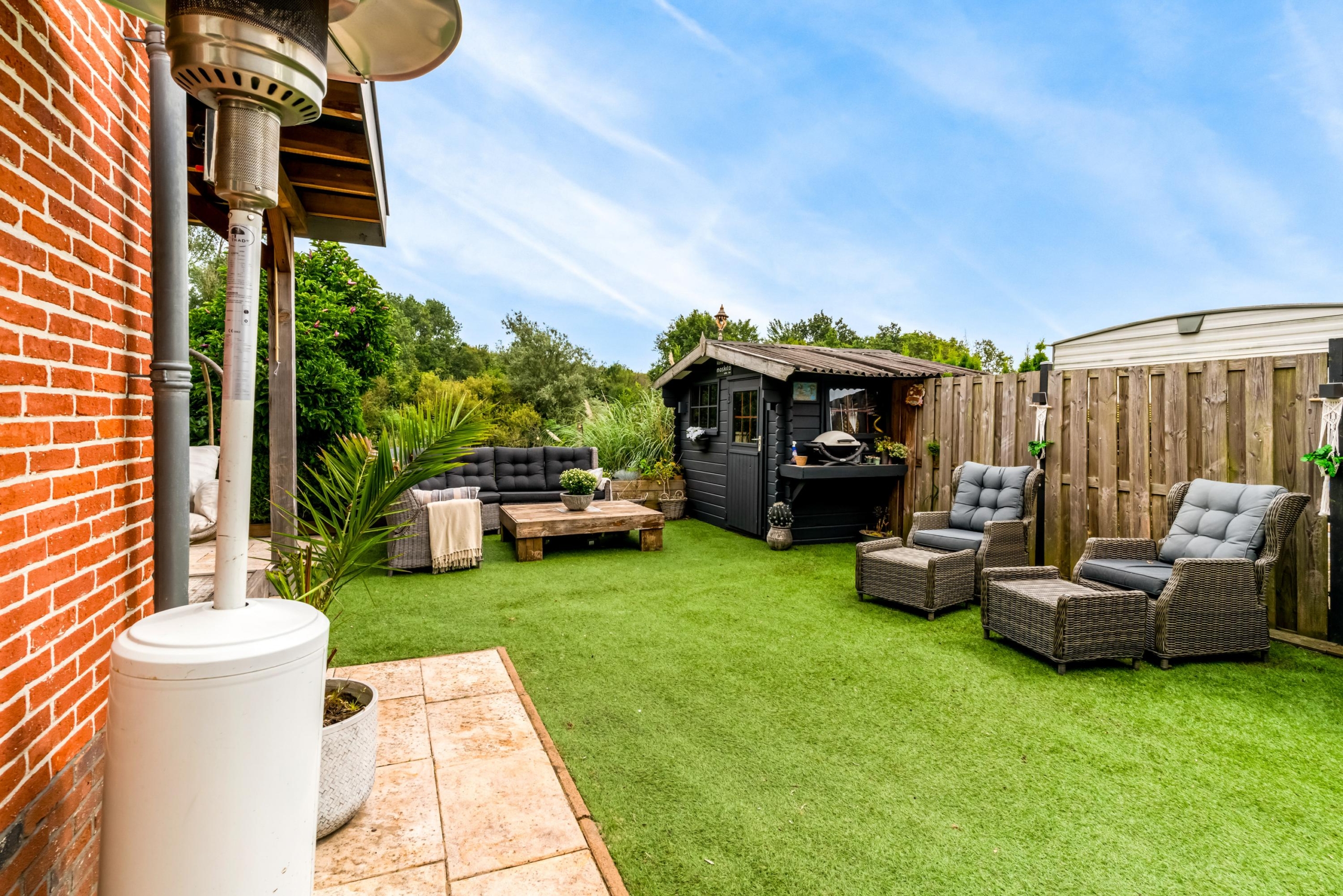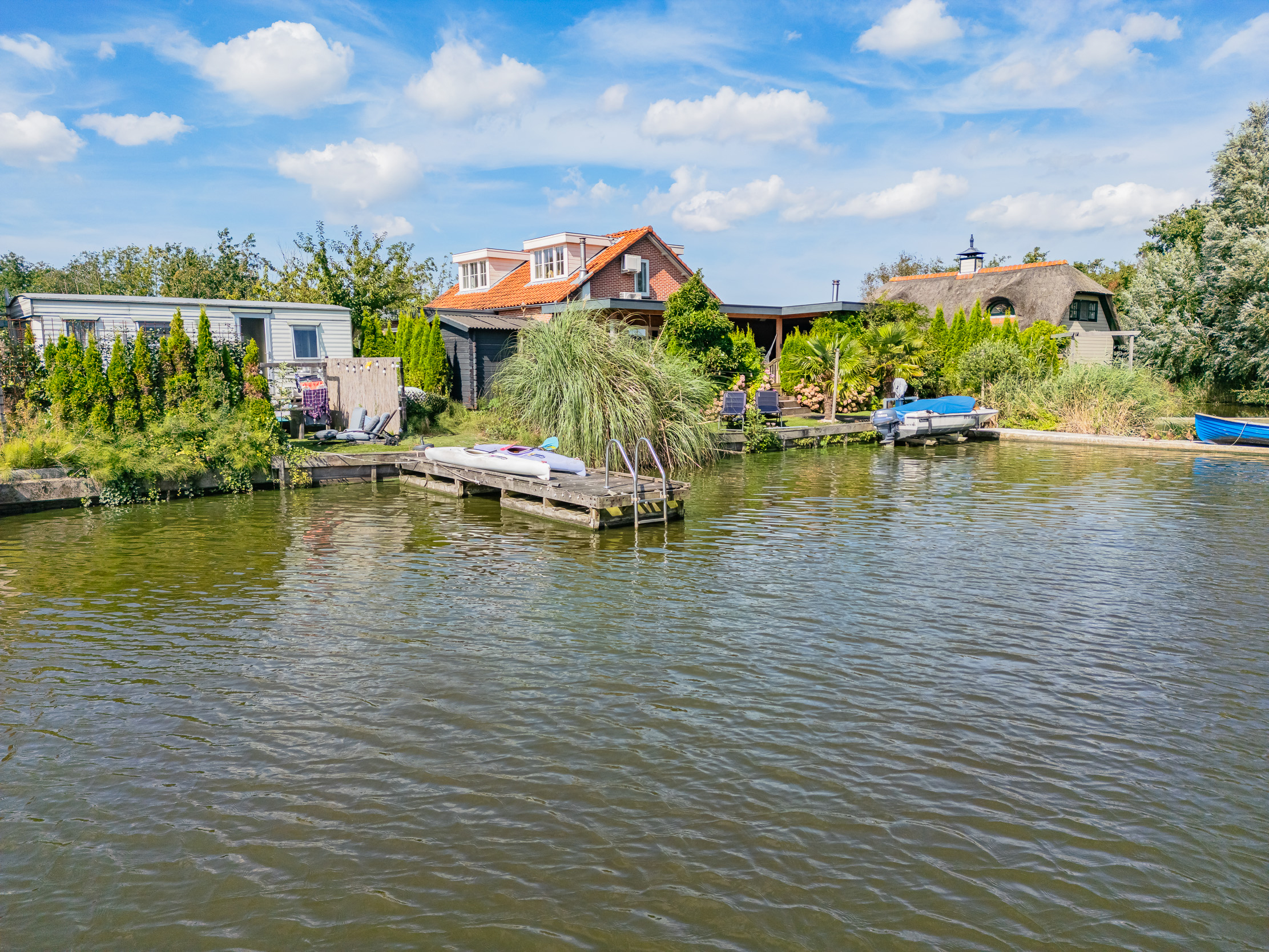 Zijkant tuin; vanaf de voorkant loop je via de zijkant naar de mobile – Home met eigen tuin aan het water , welke zich uitstekend leent voor verhuur/werkkamer of chill plek voor de kids.
