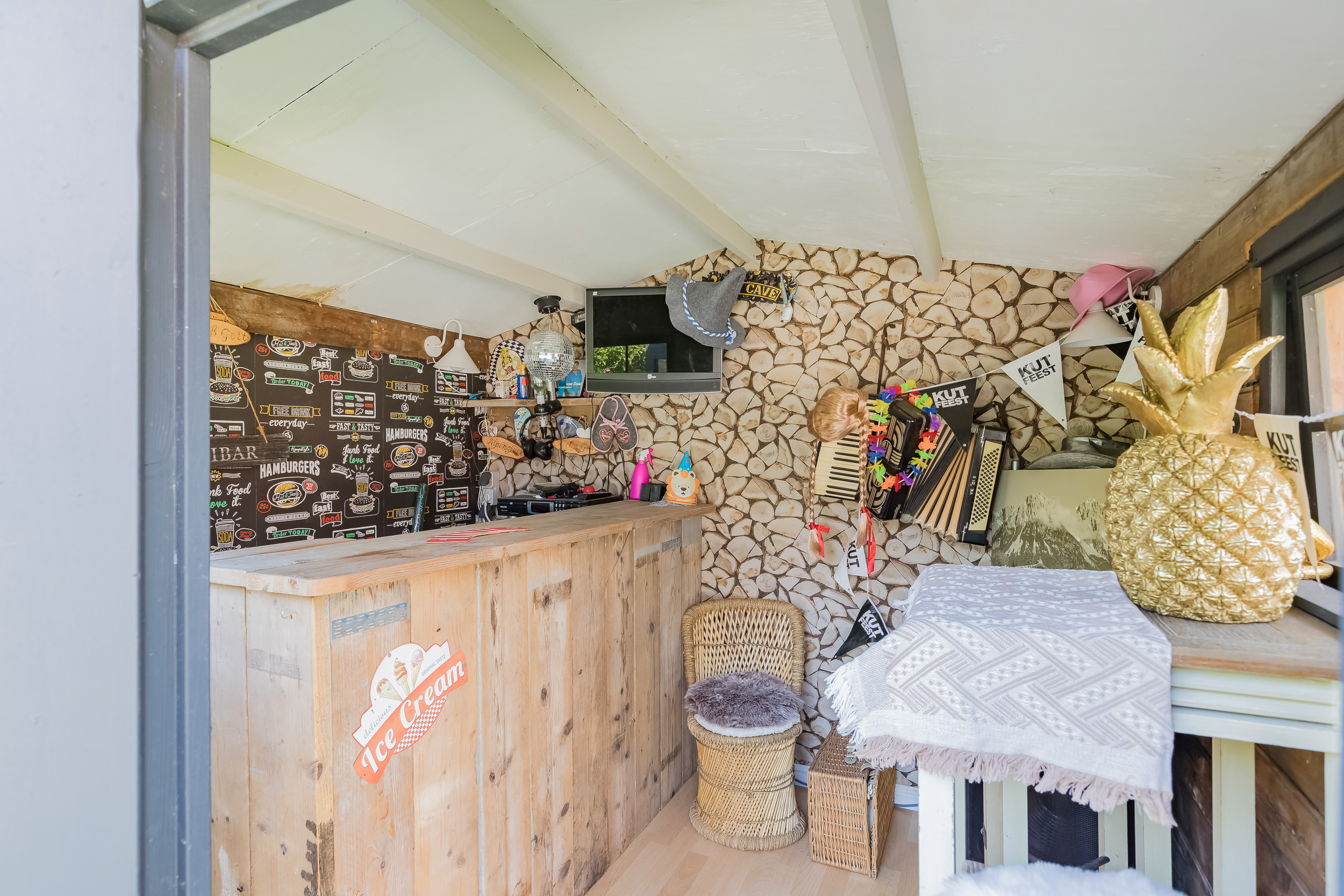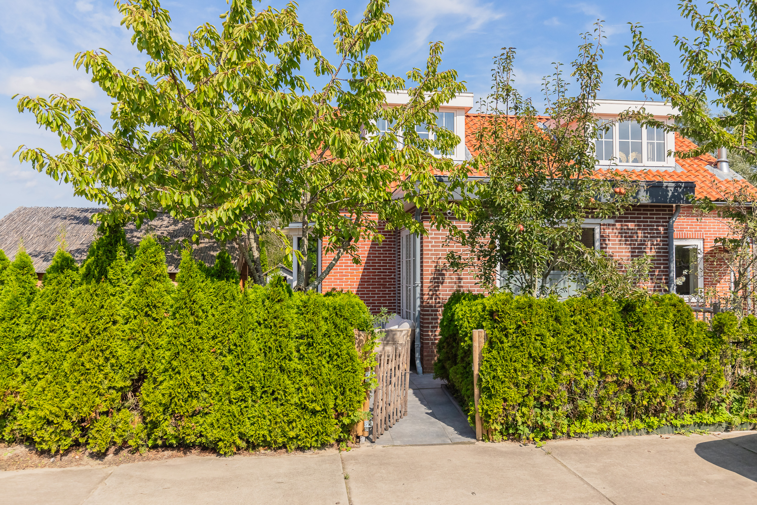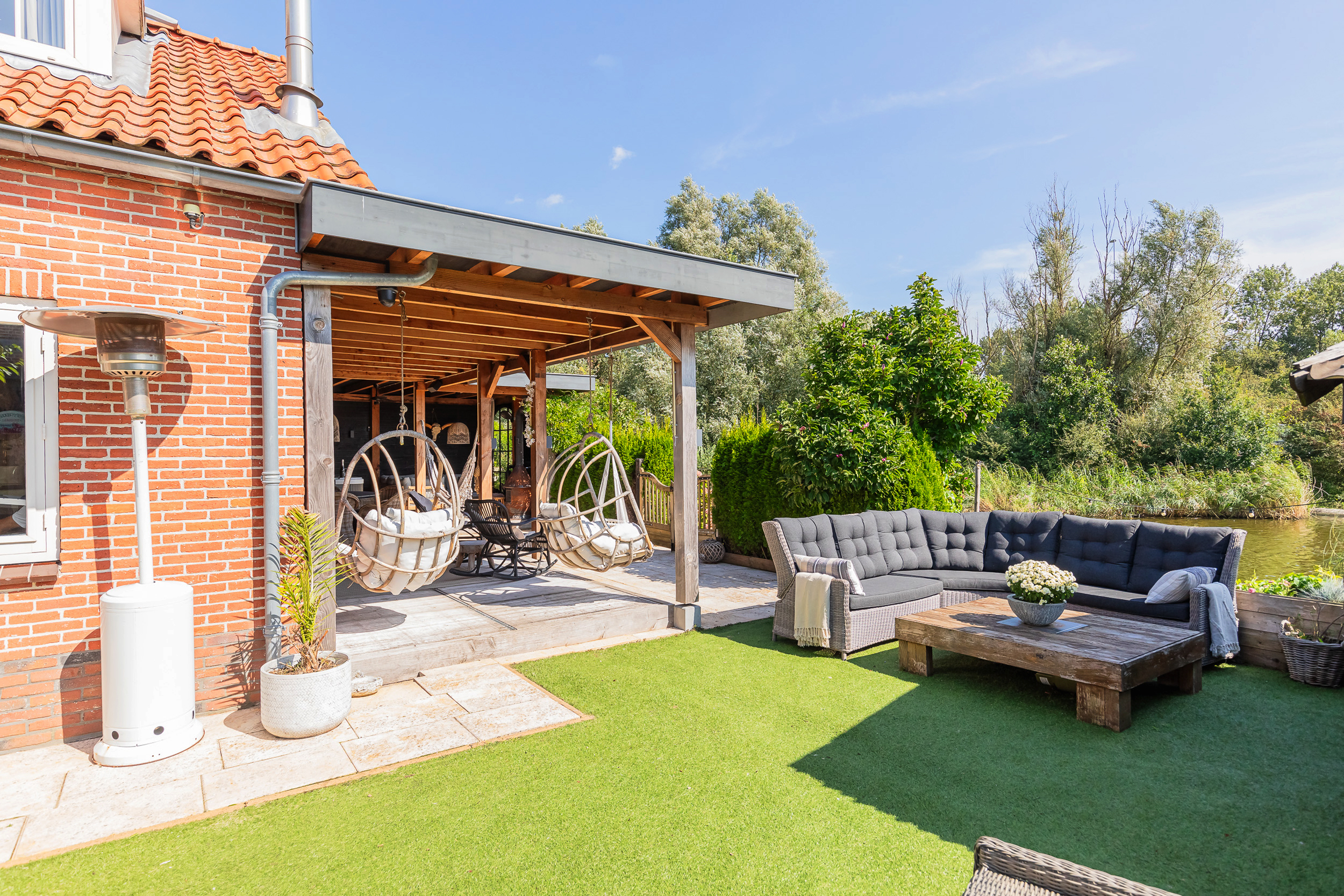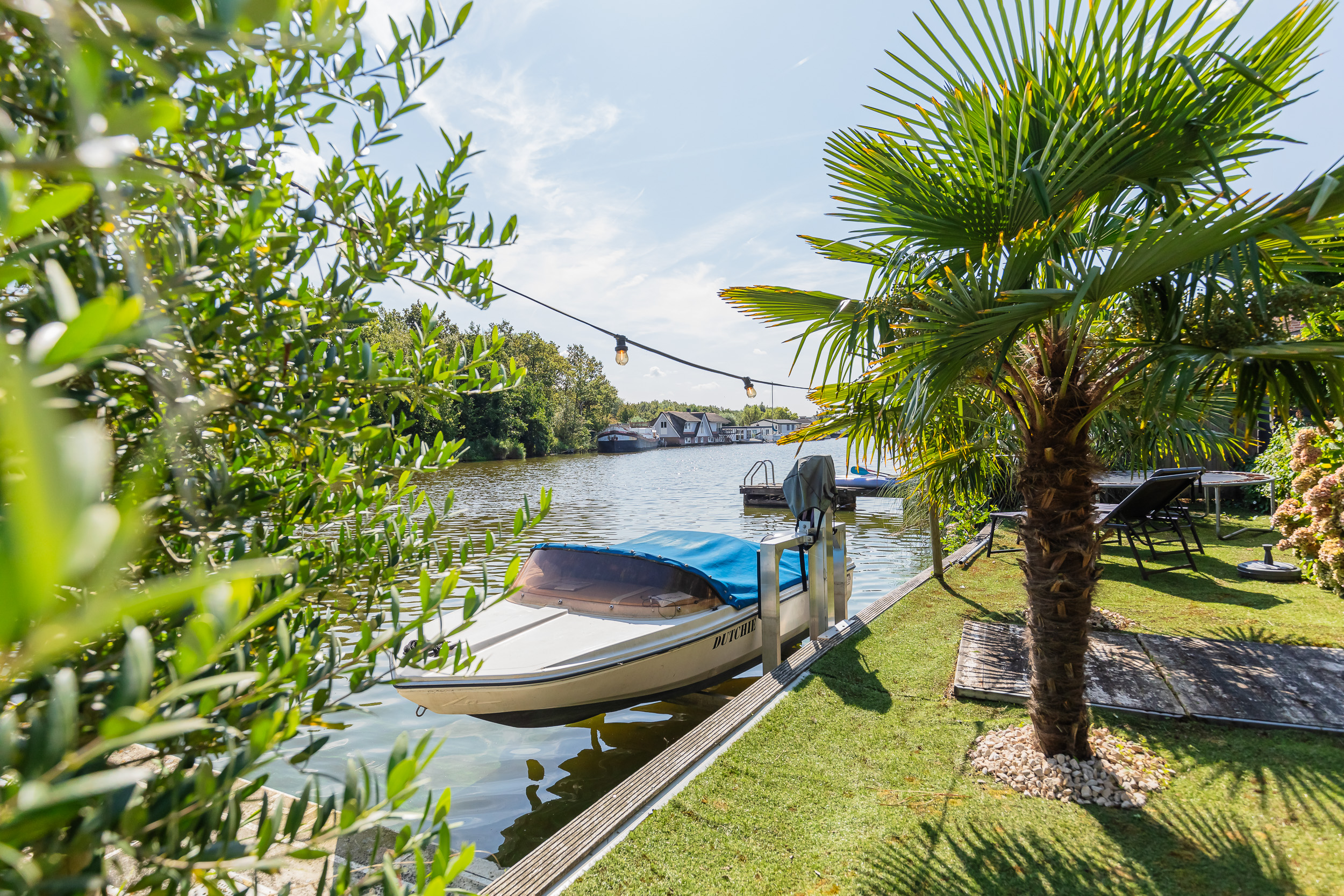 Zijkant tuin; vanaf de voorkant loop je via de zijkant naar de mobile – Home met eigen tuin aan het water , welke zich uitstekend leent voor verhuur/werkkamer of chill plek voor de kids.