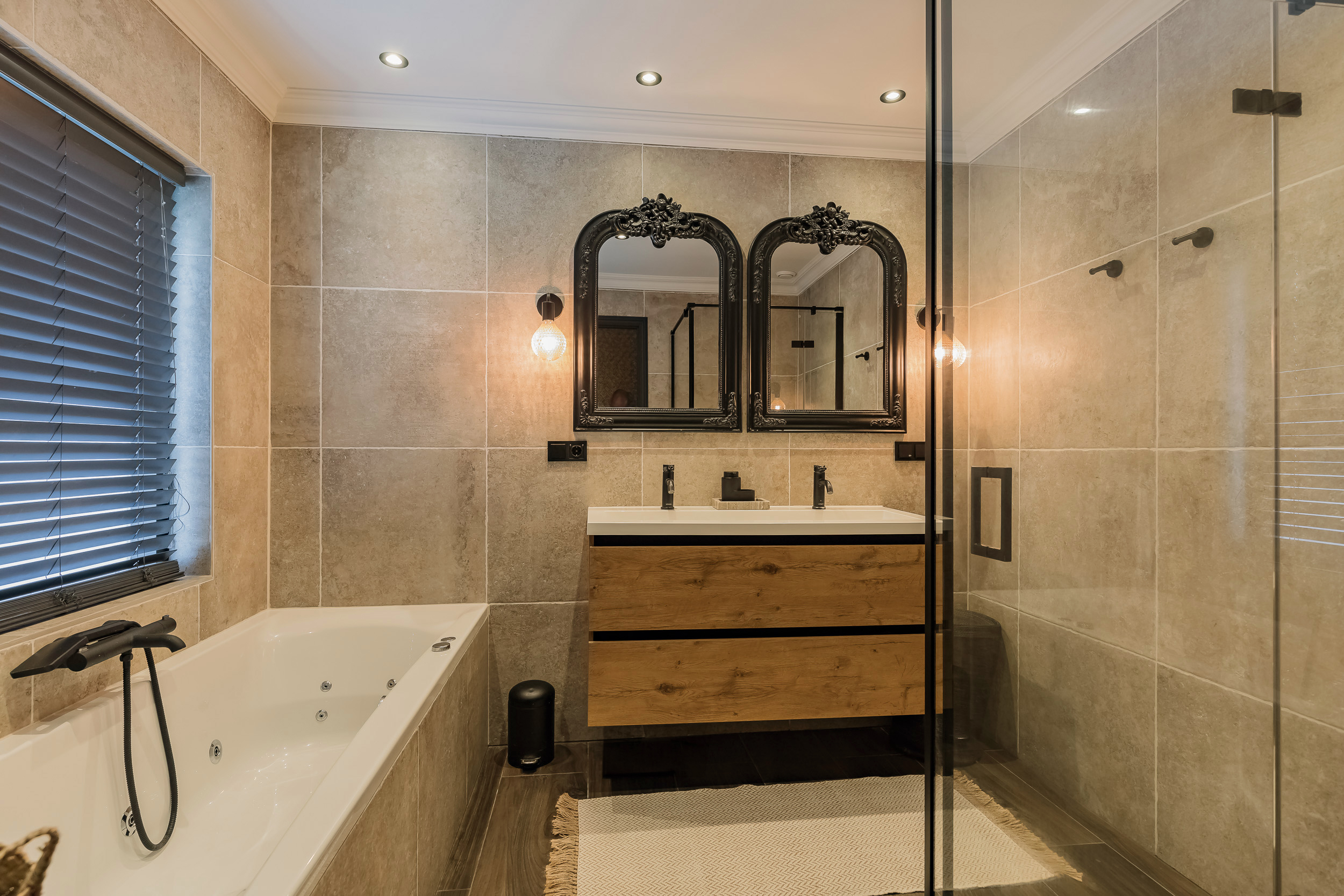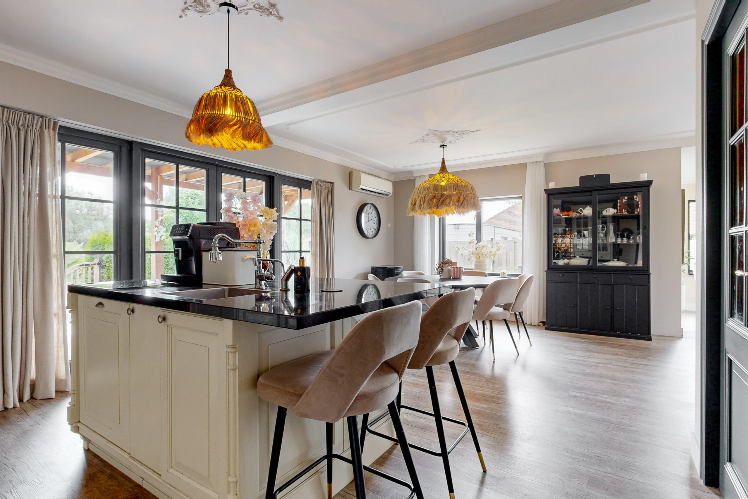 Entree, gang, uitgebreide meterkast (10 groepen, krachtstroom, aardlekschakelaars), luxe badkamer (2022) v.v. douchecabine, wastafelmeubel en bubbelbad, separaat modern toilet, ruime en lichte L-vormige woonkamer voorzien van airco, erker en openslaande deuren naar de tuin, luxe woonkeuken (tevens voorzien van airco) v.v. vaatwasser, 5-pits gaskookplaat met wokbrander, oven, magnetron, koel/vriescombinatie, Quooker (grootste uitvoering) en hardstenen werkblad en veel kastruimte, de ruime ouderslaapkamer met walk in closet en openslaande deuren naar de zonnige voortuin zorgt ervoor dat deze woning levensloop bestendig is. Via de lichte en zonnige woon eetkamer loop je met je koffie de aangebouwde veranda in waar je van de ochtend zon kan genieten. Hier vind je ook een open haard, bar/ loungehoek en jacuzzi ( ter overname aangeboden).