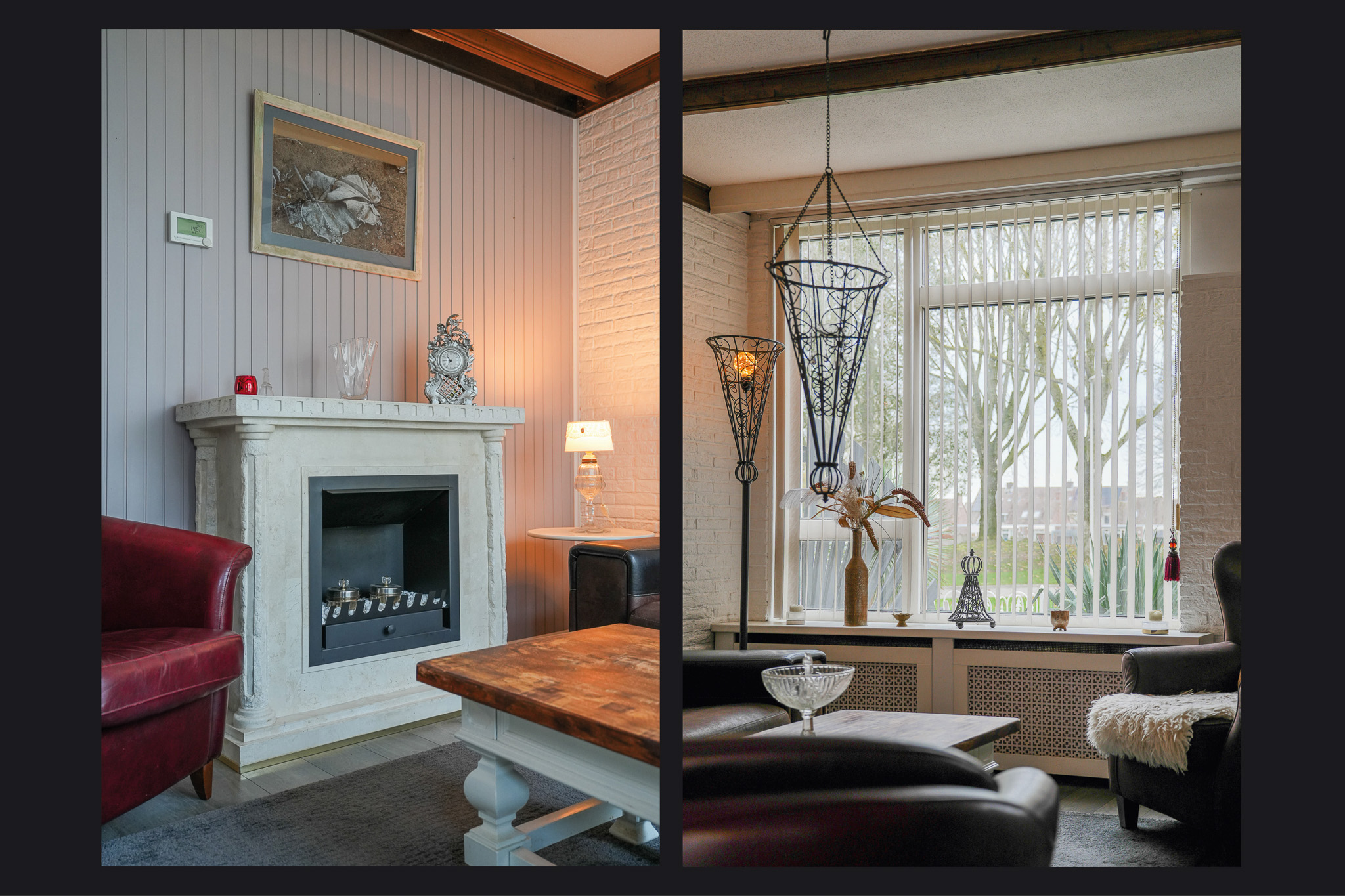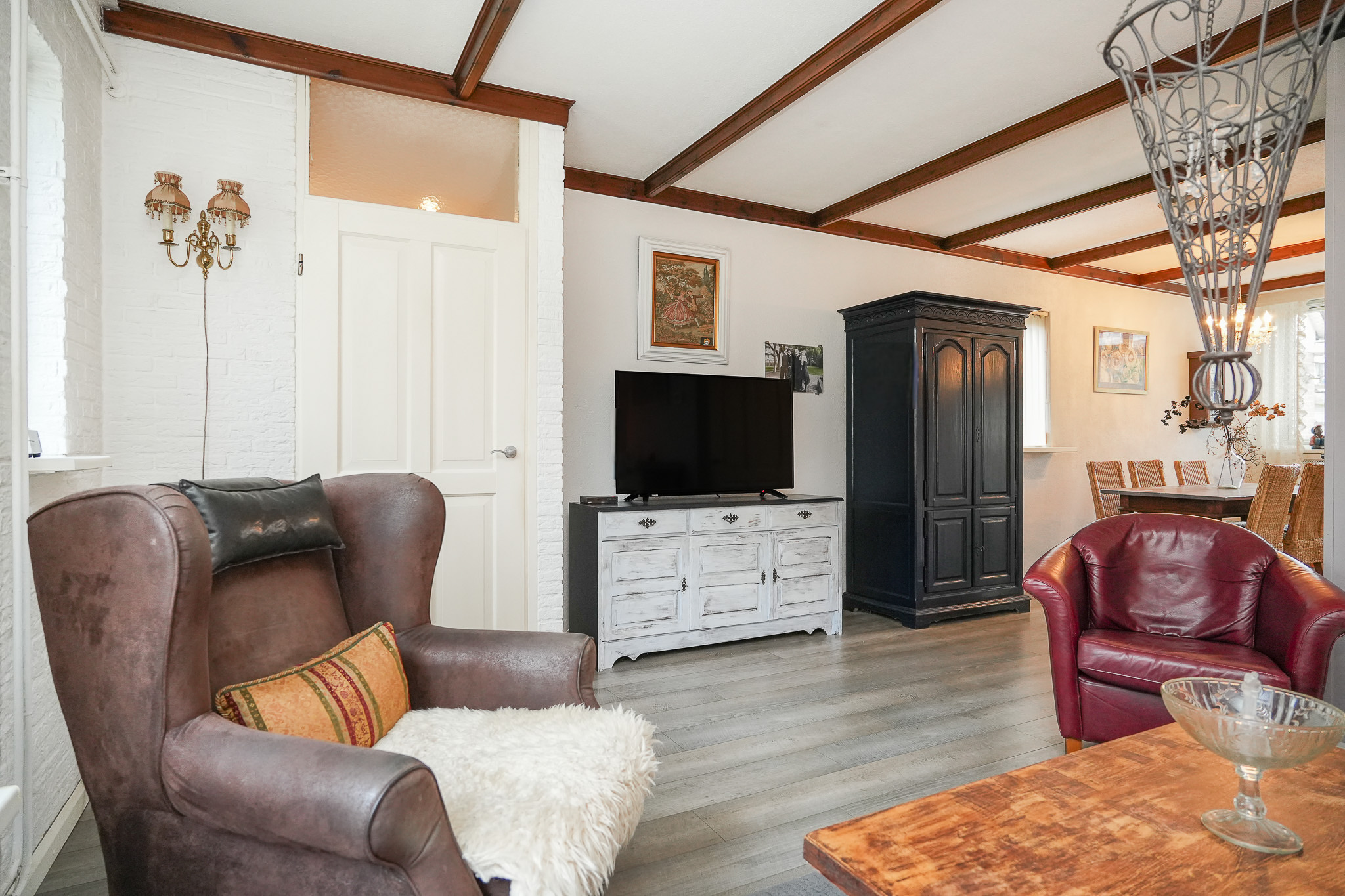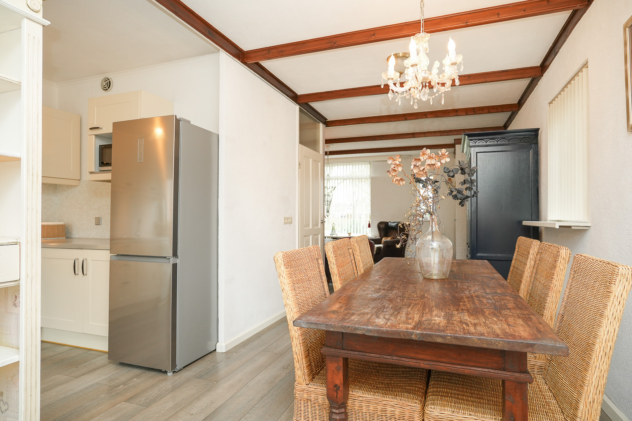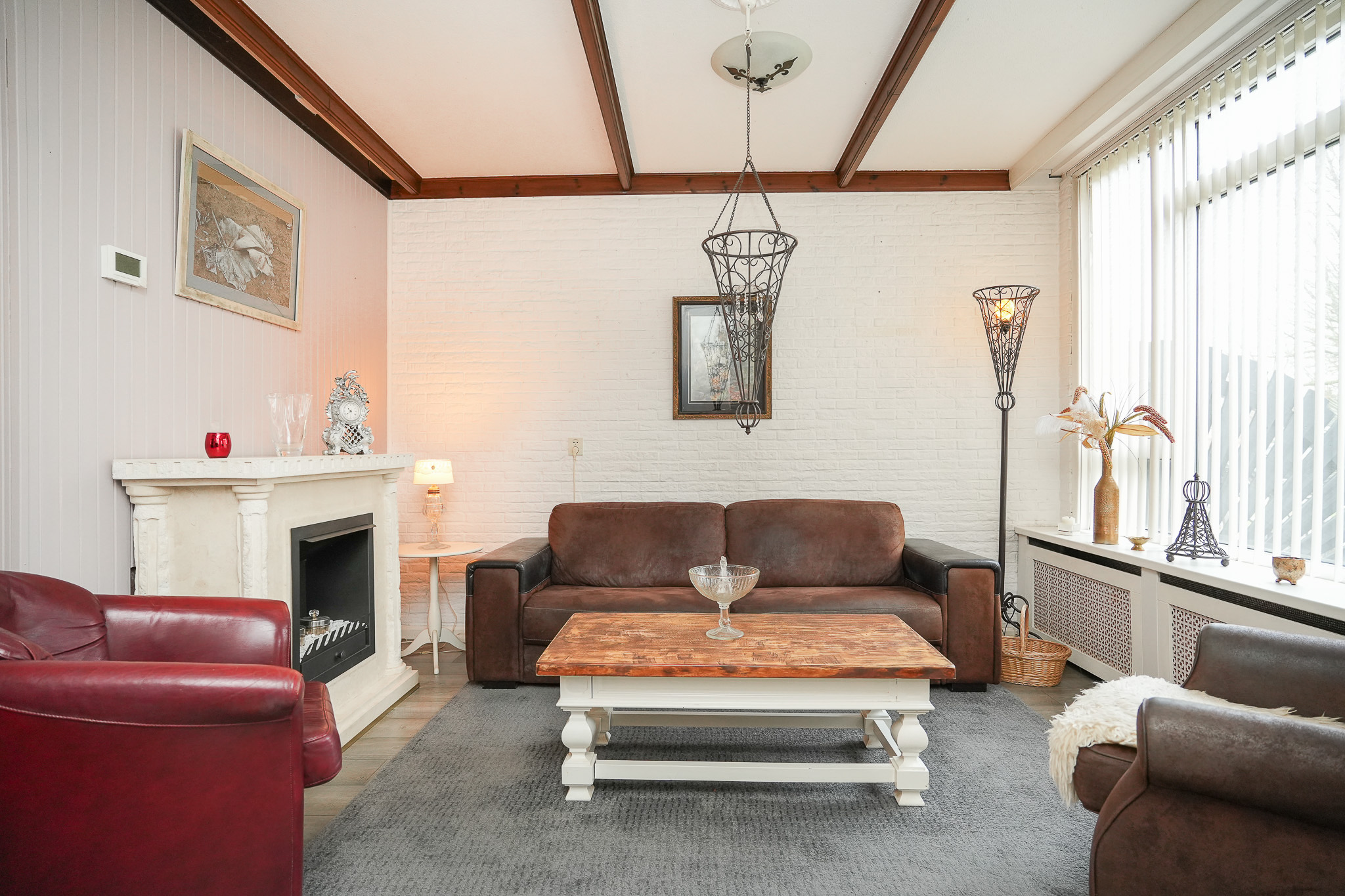 De woonkamer is licht en prettig ingedeeld, onder andere door het grote raam aan de voorzijde en richting de zonnige achtertuin. De sfeerhaard zorgt voor extra warmte en een gezellige uitstraling in de wintermaanden.