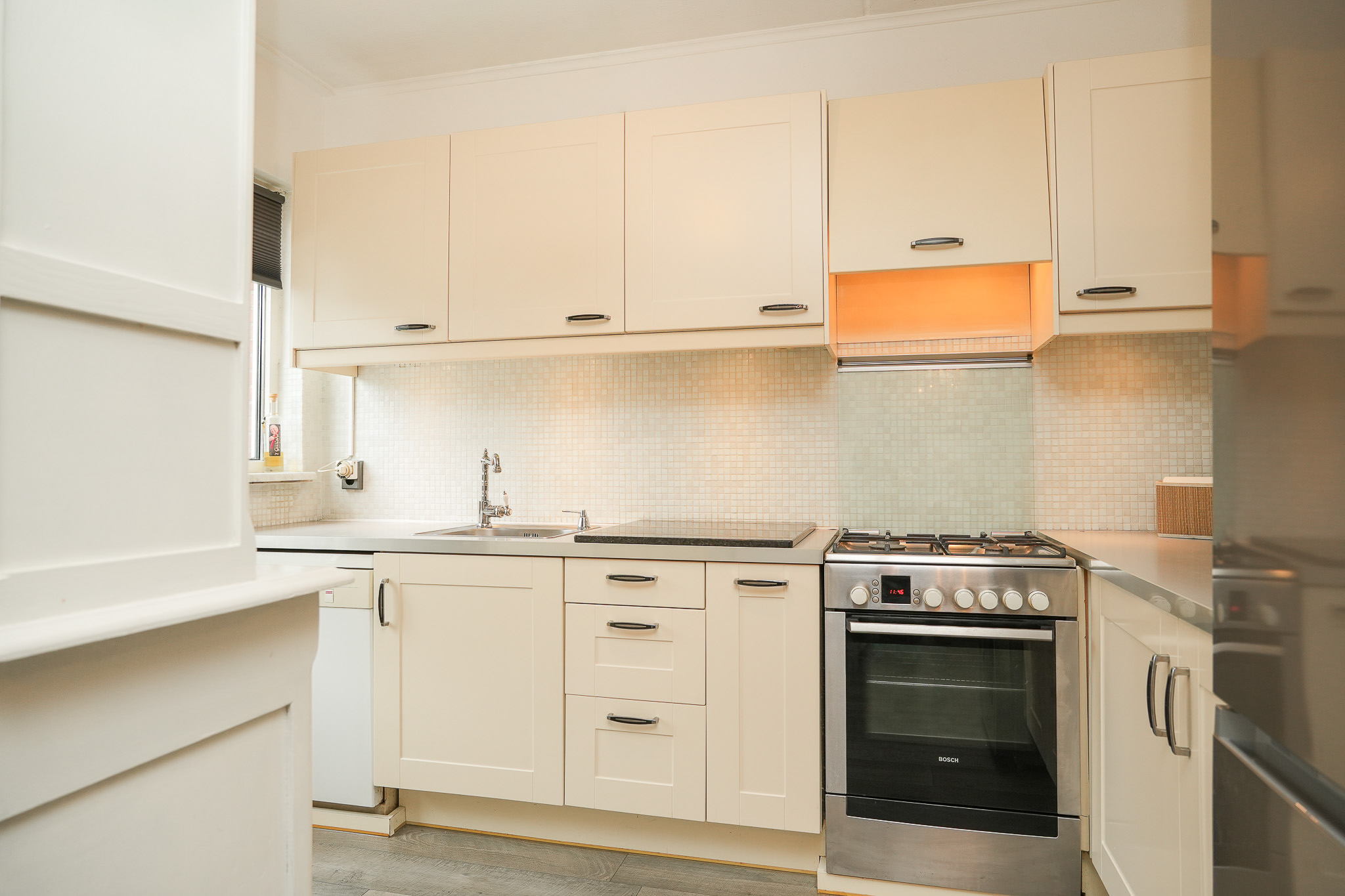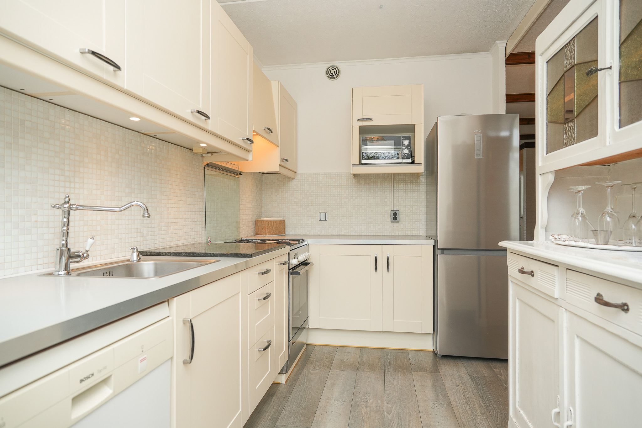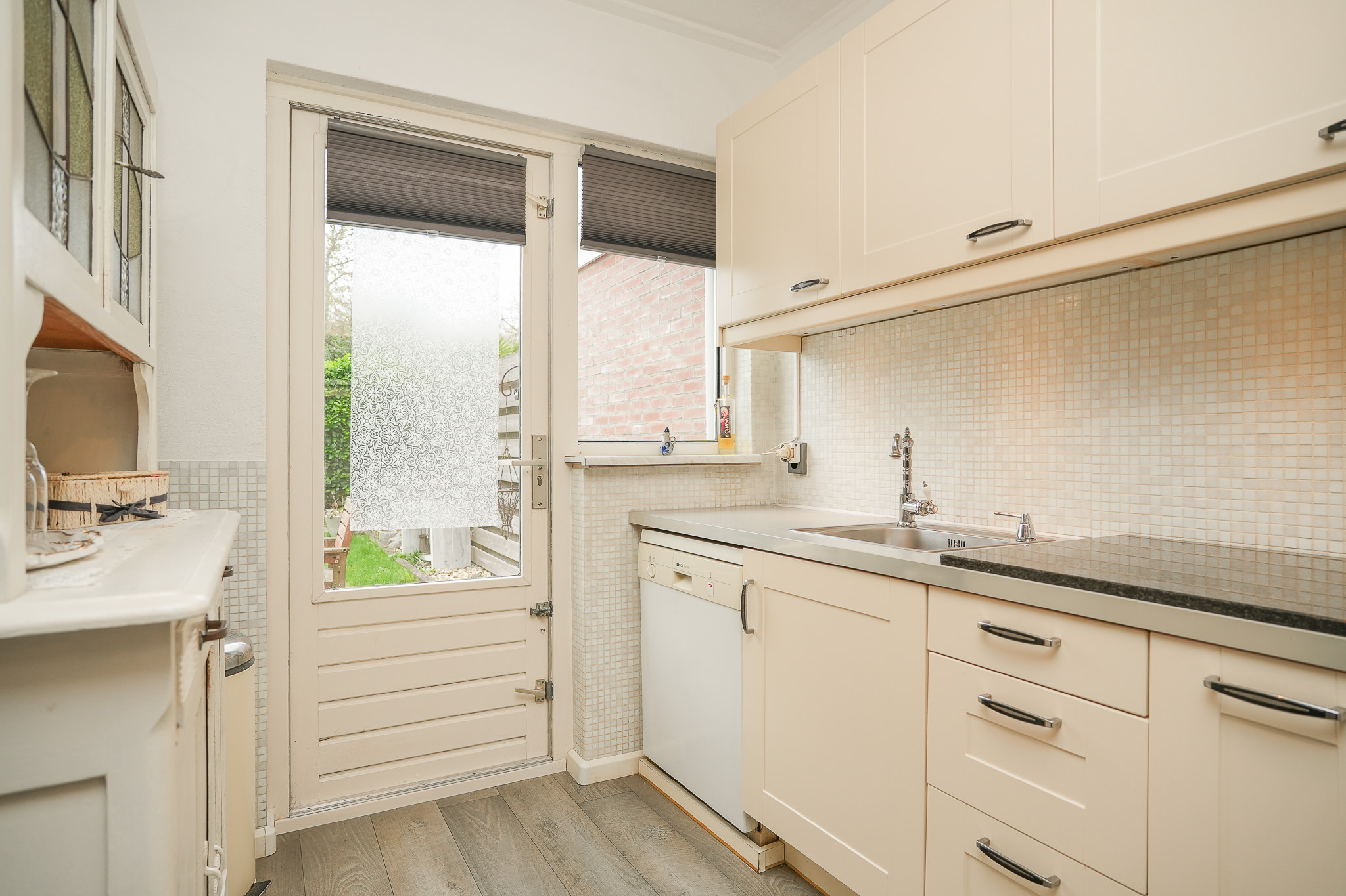 Aan de achterzijde bevindt zich de halfopen keuken met zicht op de tuin. De keuken is praktisch ingedeeld en biedt voldoende opbergruimte en werkblad, met ruimte voor modernisering naar eigen smaak. Vanuit de woonkamer kom je in de hal, waar het toilet en de trapopgang zich bevinden.