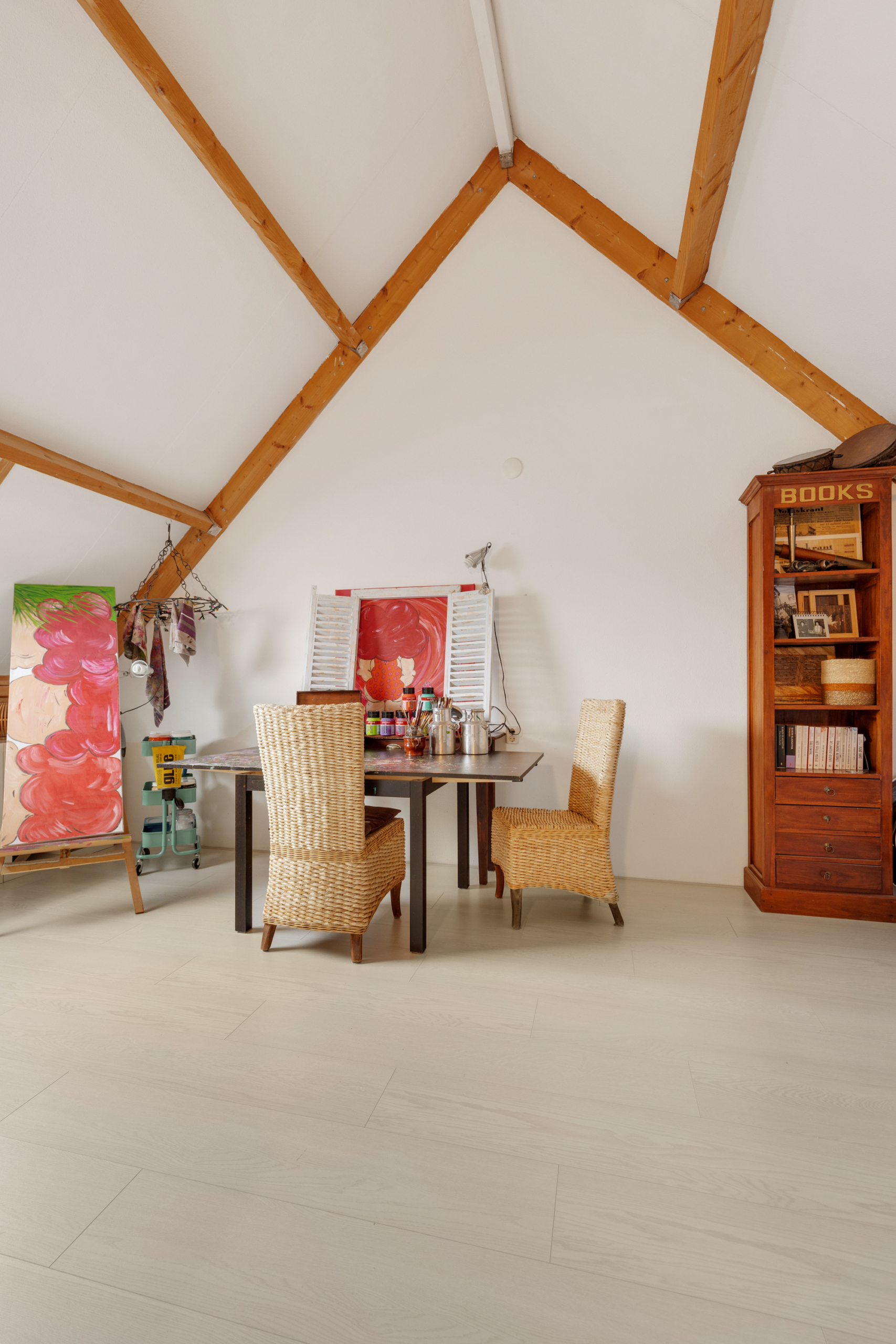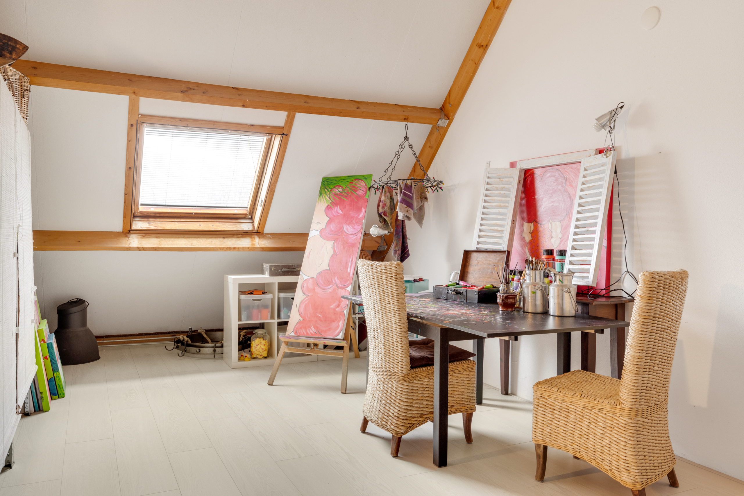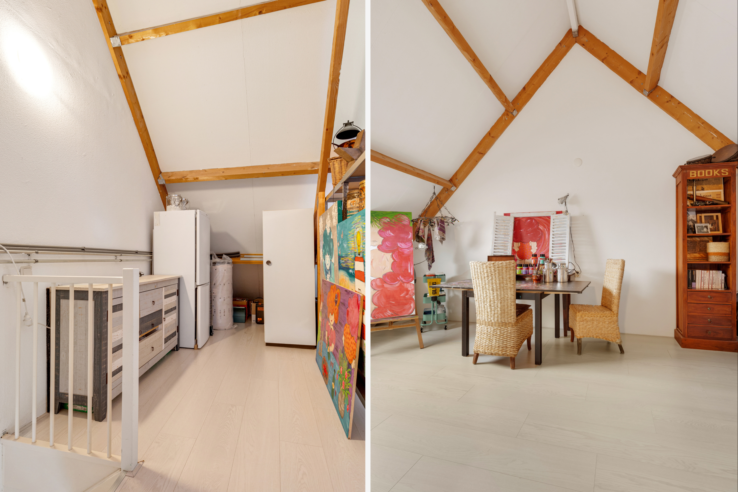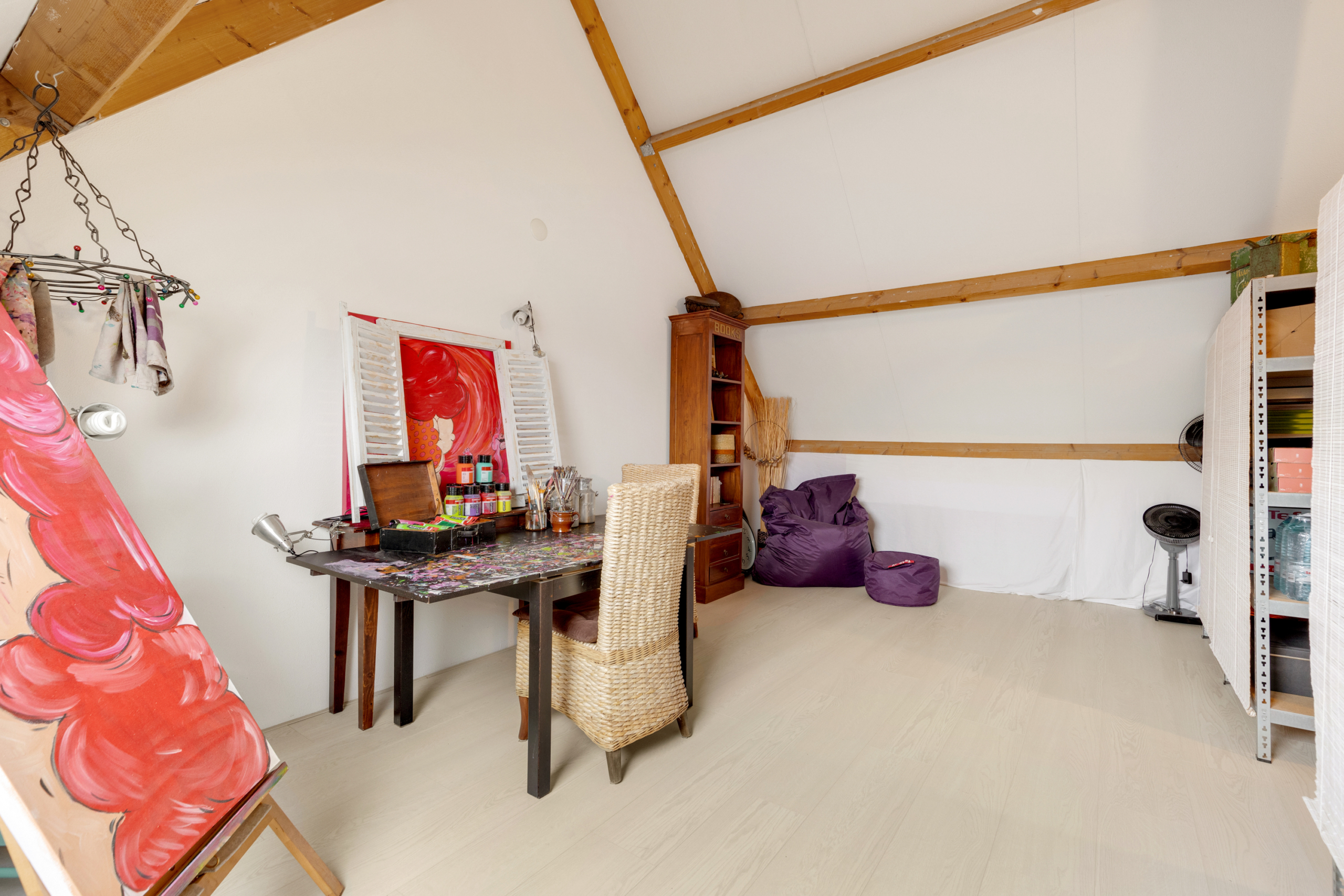 Tweede verdieping – grote open zolderruimte die nu in gebruik is als atelier, maar hier zijn met gemak twee ruime slaapkamers van te maken. Tevens bevindt zich hier de aansluiting voor de wasmachine en is er voldoende ruimte voor opslag. Ook op deze verdieping is e lichte laminaatvloer terug te vinden.