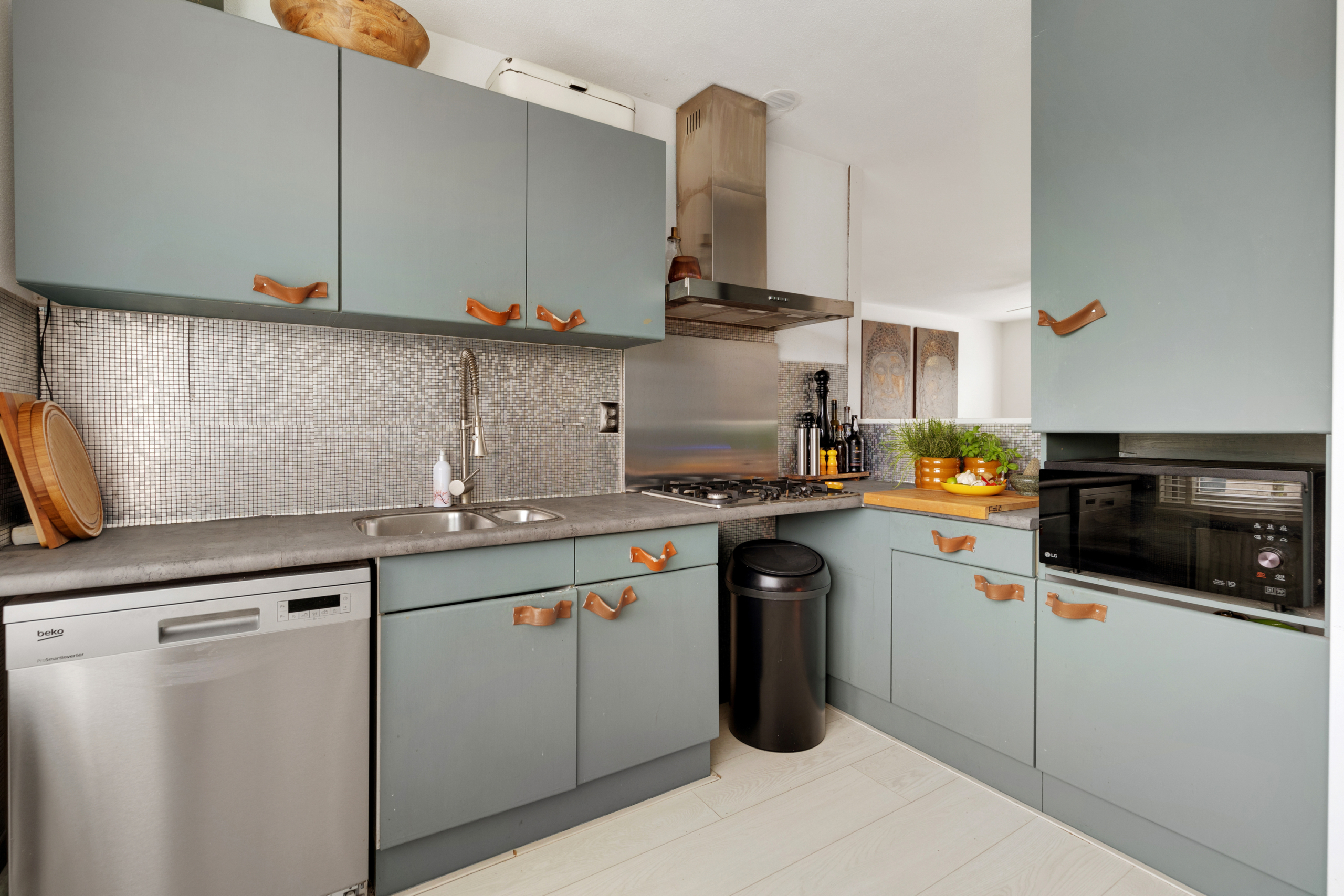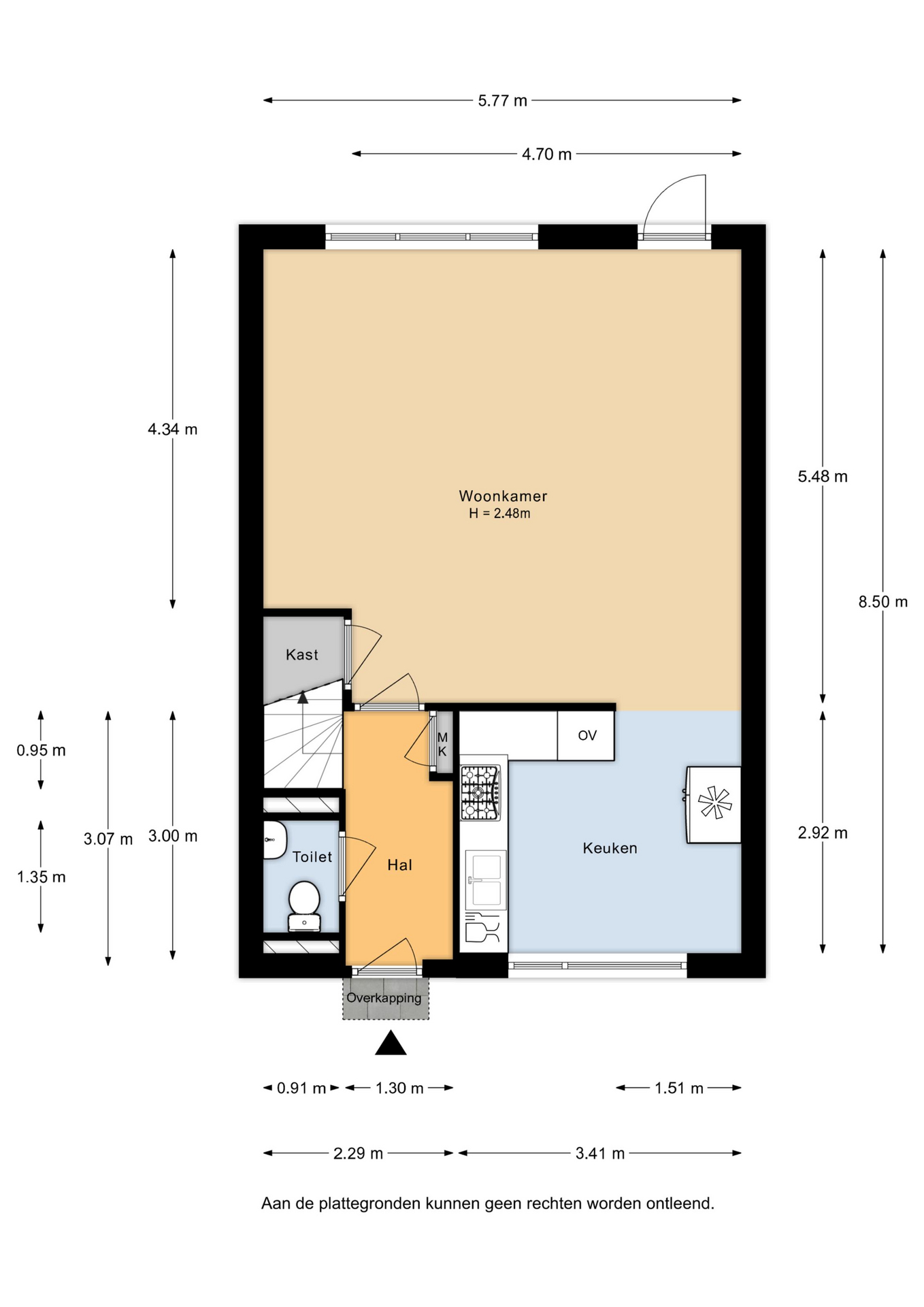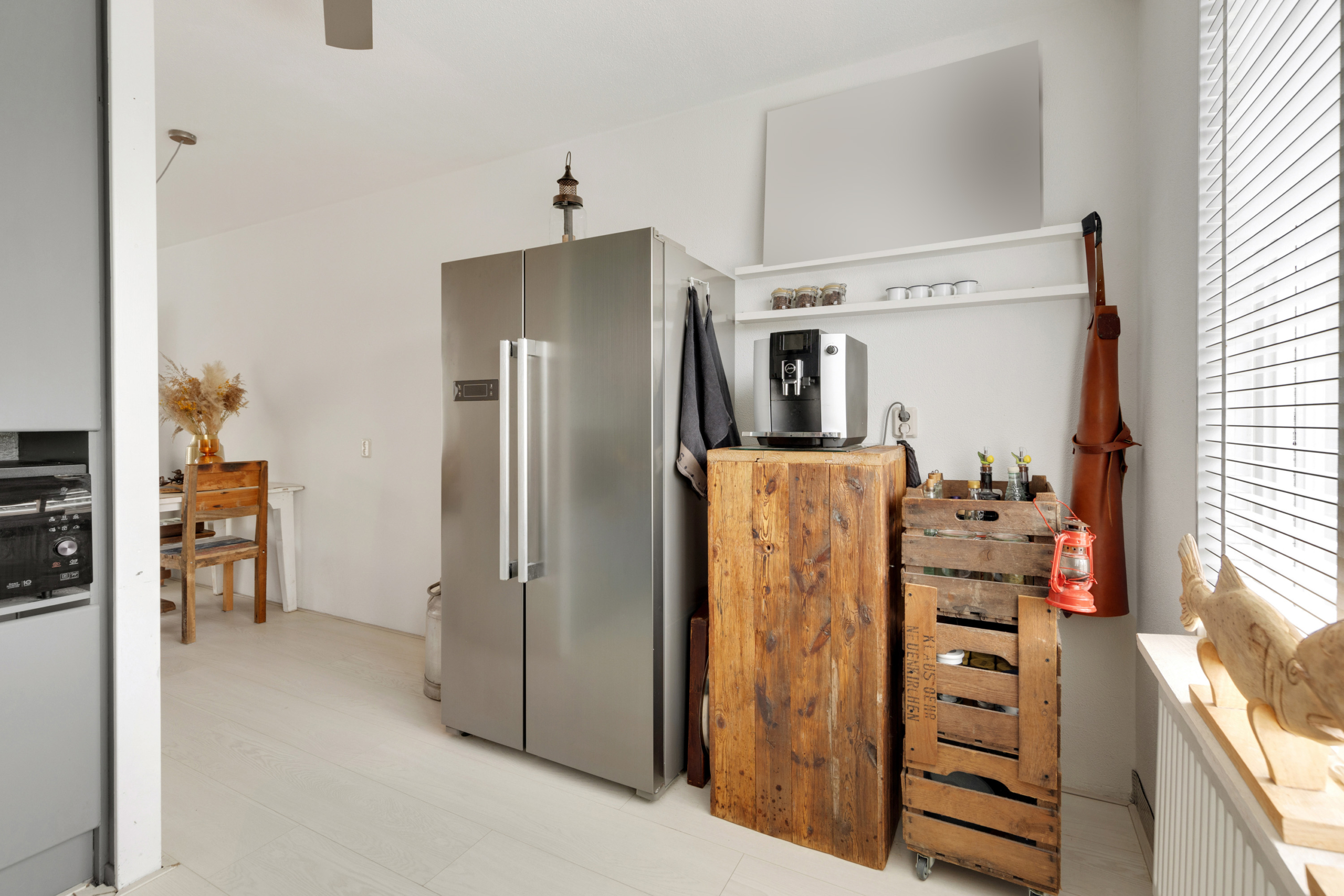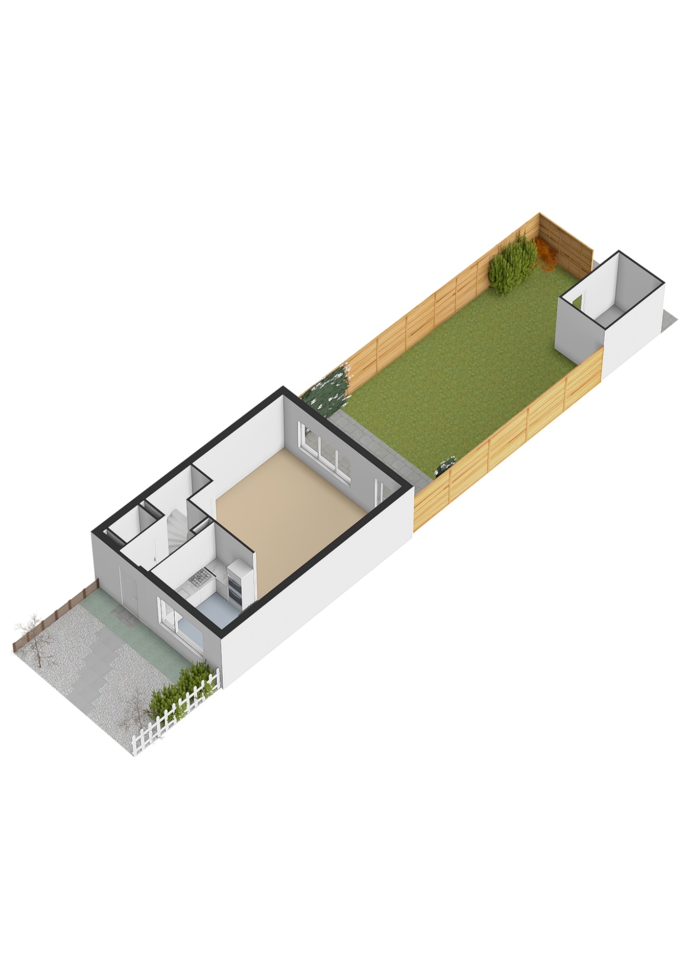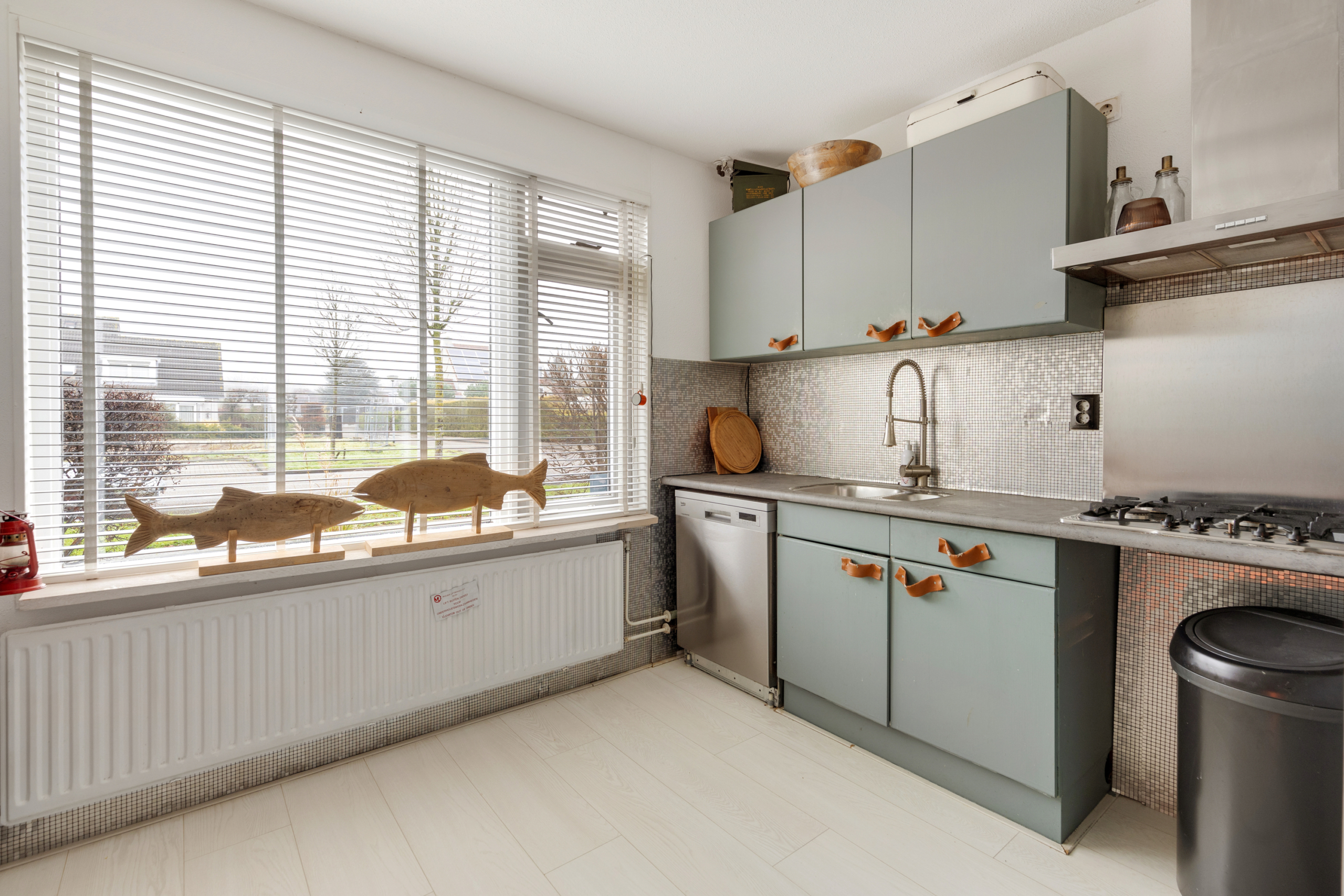 Begane grond – entree en gang waarin zich de toilet en de meterkast bevinden. De meterkast is deels vernieuwd met geheel nieuwe 3-fase groepenkast met extra groepen voor PV, keuken- en krachtstroom. De aparte PV-groep is gekoppeld met de 11 zonnepanelen die op het dak zijn geïnstalleerd. Vanuit de gang kom je binnen in de ruime en lichte woonkamer met half open keuken voorzien van een fraaie, witte laminaatvloer. De keuken is voorzien van een hoekopstelling met daarin een ingebouwde gaskookplaat met afzuigkap daarboven, een losse vaatwasser, magnetron en amerikaanse koelkast. Via de achterdeur in de woonkamer stap je zo de ruime en zonnige tuin in. Gelegen op het zuiden, met een stenen schuurtje achterin en een achterom met steeg. Handig om met fietsen in de tuin te kunnen komen en bijvoorbeeld groenafval af te kunnen voeren. Door de ligging aan de zijkant van de tuin van de achterburen, heb je volop zicht op groen en geen inkijk van de achterburen.