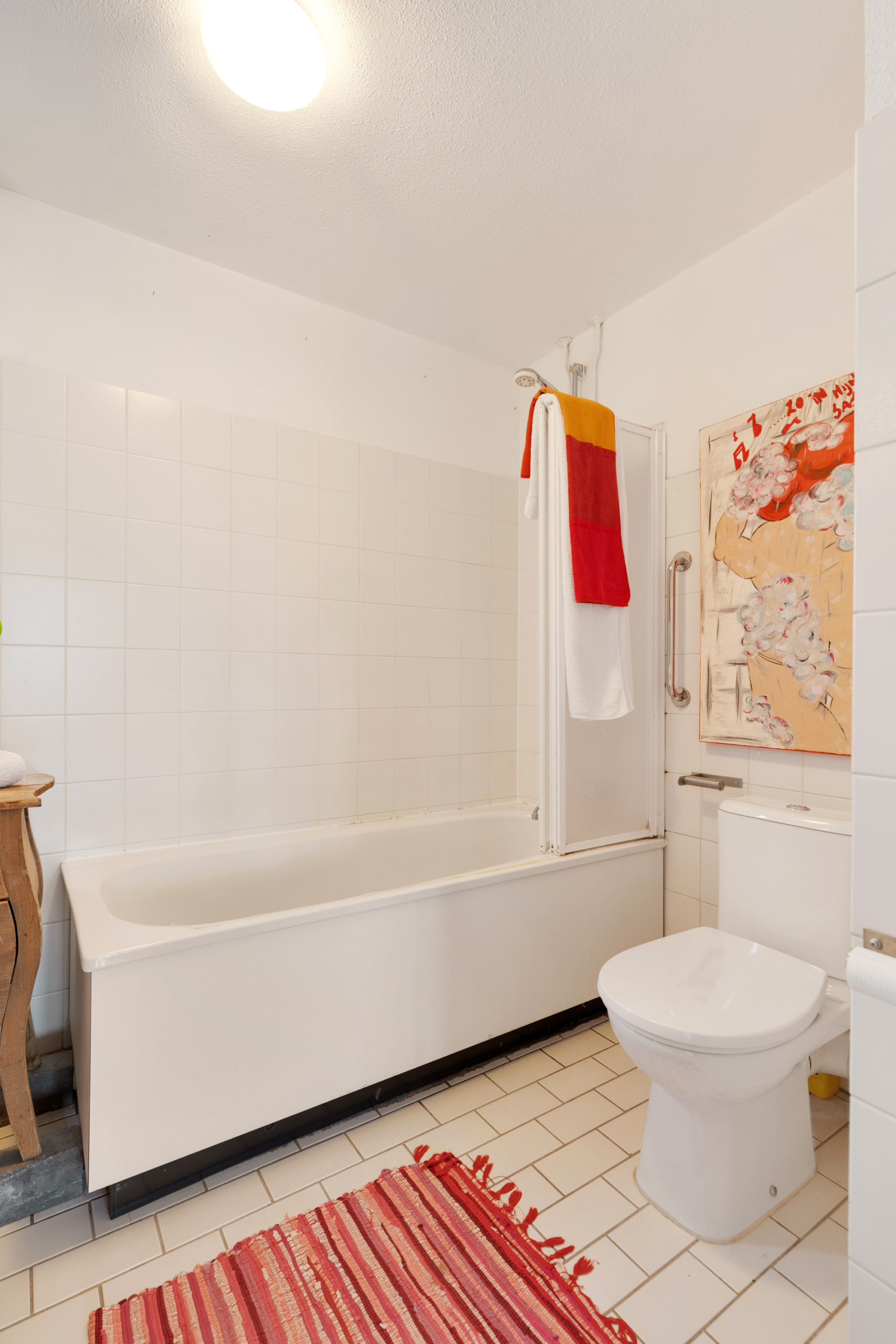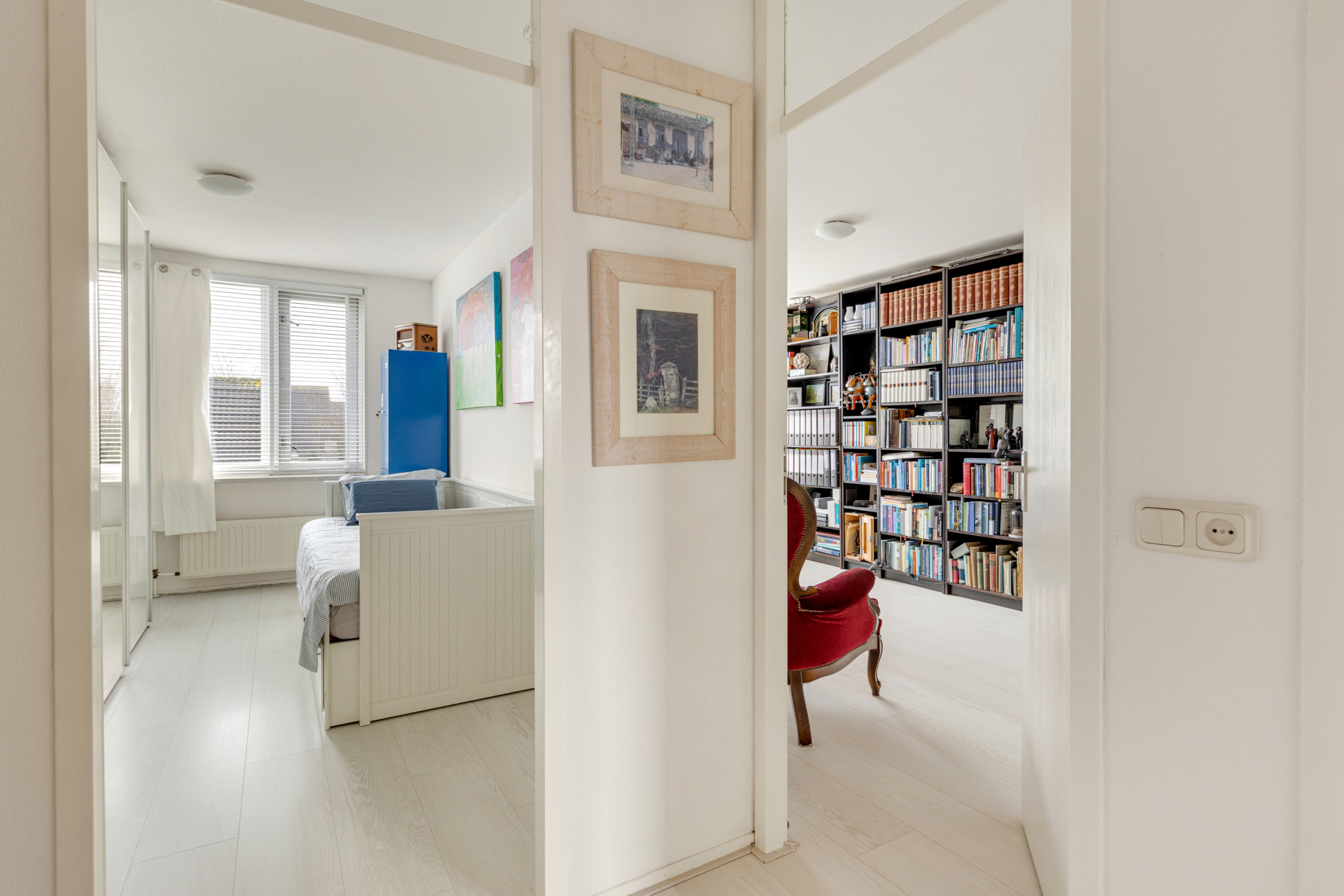 Eerste verdieping – overloop met toegang tot drie ruime slaapkamers en een badkamer. De kleinste slaapkamer is nu in gebruik als kleed- annex logeerkamer, de hoofdslaapkamer is aan de voorzijde gelegen en de grootste achterkamer is nu in gebruik als kantoor. De badkamer is in witte kleurstelling en heeft een ligbad met douche, toilet, en wastafel. Ook deze verdieping is van de fraaie witte laminaatvloer voorzien.