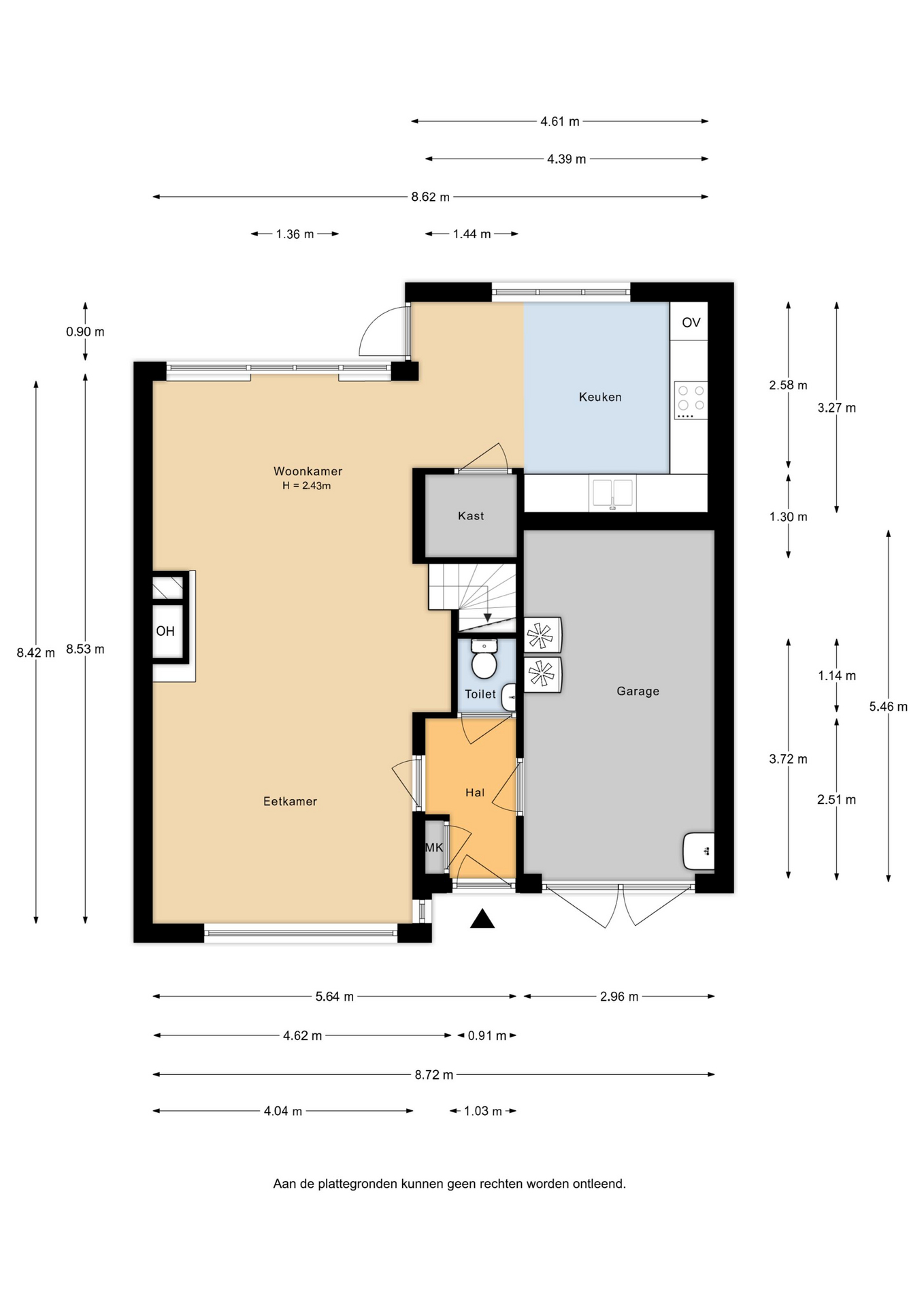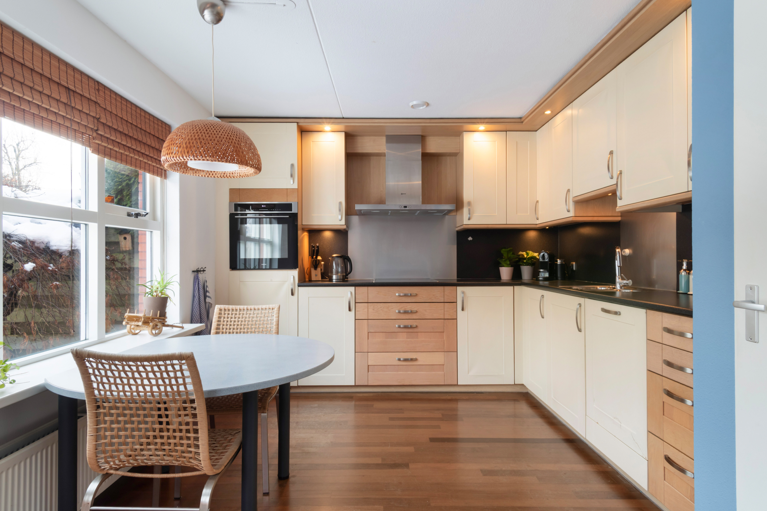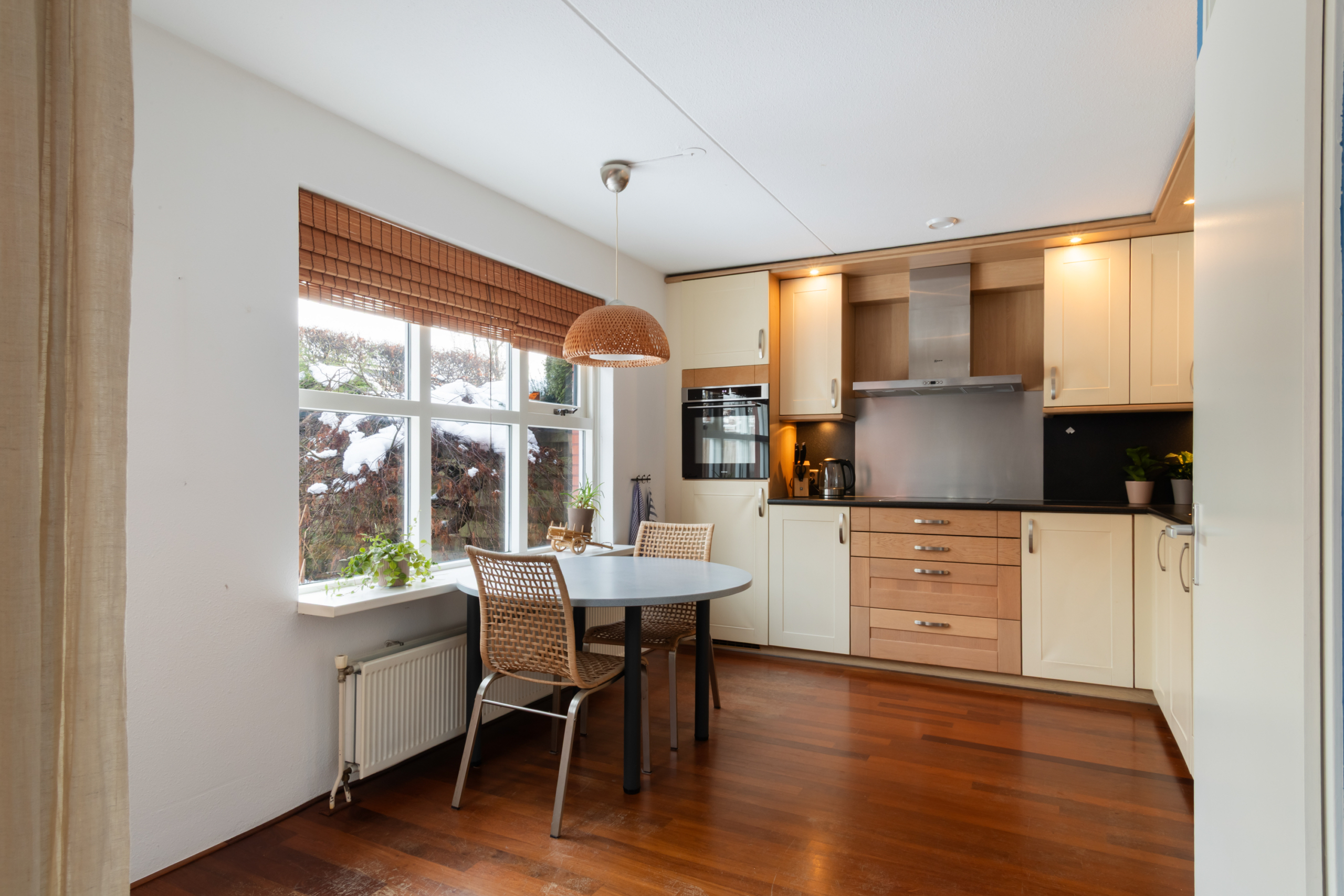 Begane grond – entree met meterkast, toilet en toegang tot de garage. In de garage zitten fraaie houten garagedeuren, een uitstortgootsteen, verwarming en de MV-unit. Vanuit de hal kom je ook in de woonkamer met fraaie open haard en massief hardhouten vloer die ook doorloopt in de half open keuken met een inbouwkeuken in ruime hoekopstelling voorzien van vaatwasser, koel-vrieskast, keramische kookplaat, afzuigkap en combi-oven. In de keuken is ook een grote voorraadkast aanwezig, erg praktisch om alles bij de hand te hebben.