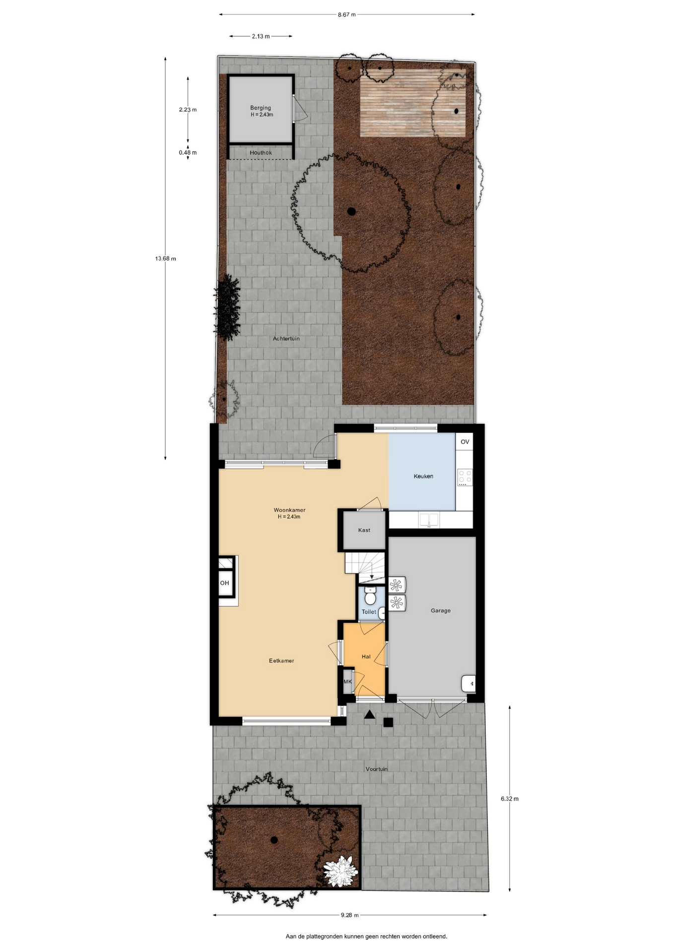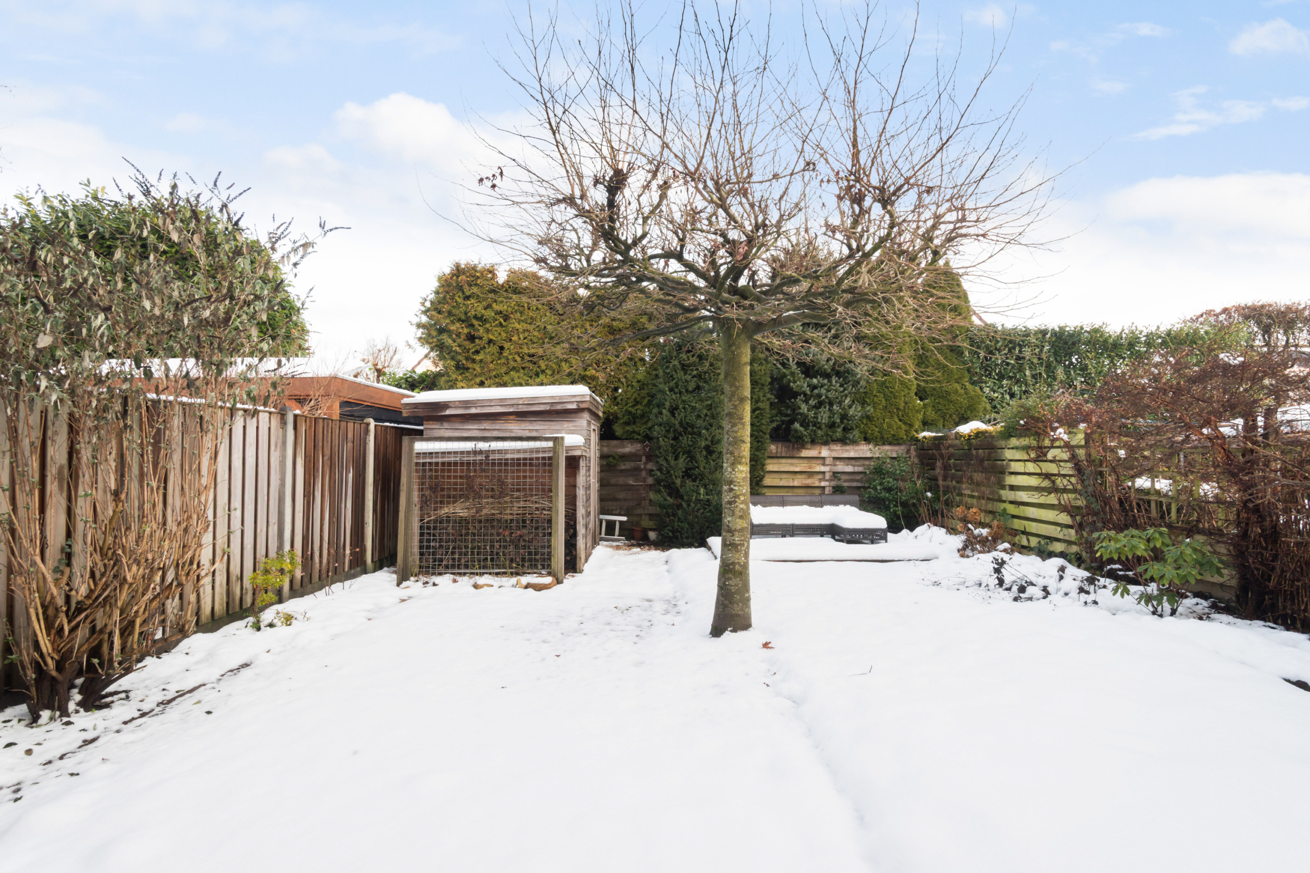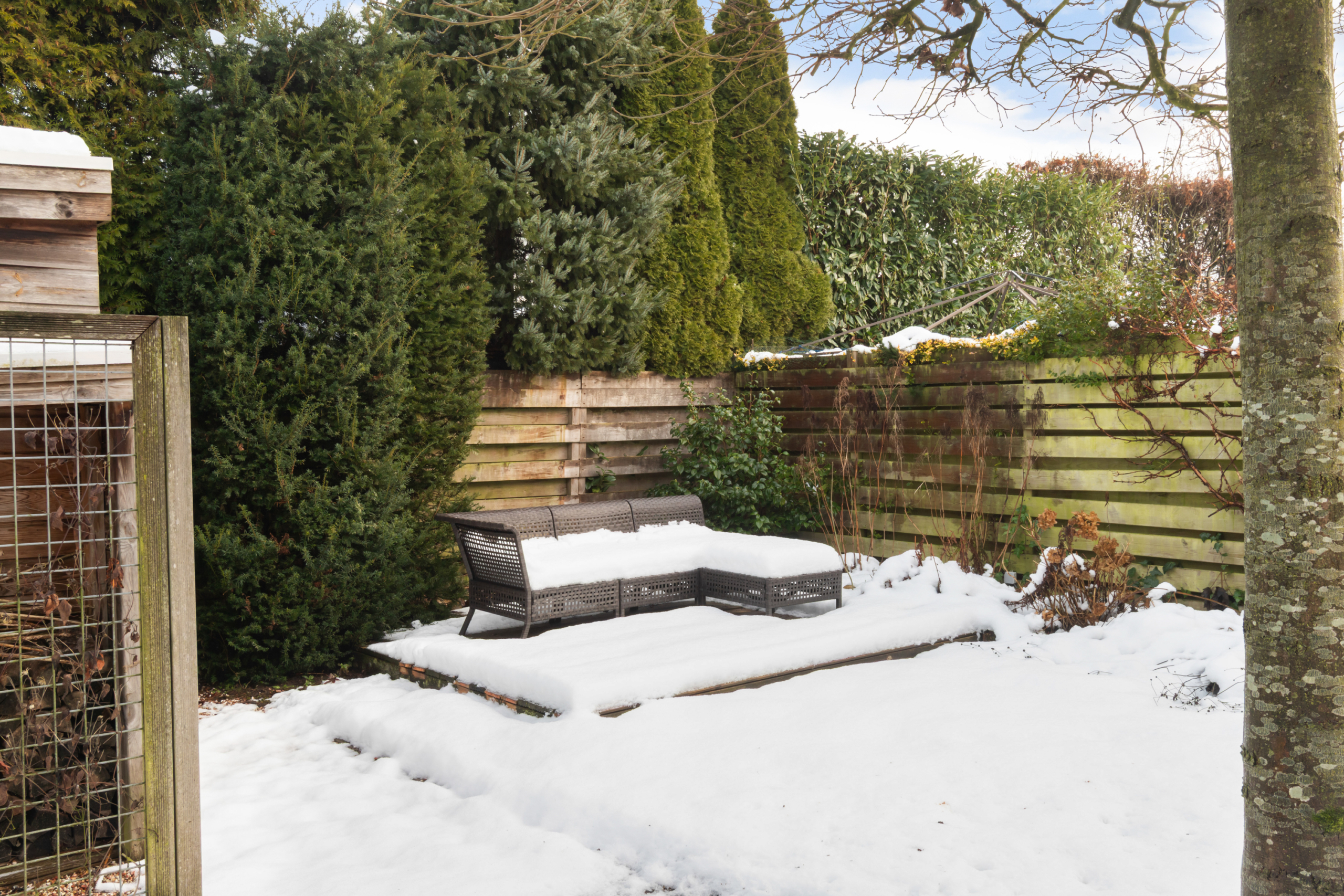 Via de achterdeur in de keuken stap je zo de tuin in met achterin een houten berging en fraai aangelegde beplanting en meerdere terrassen.