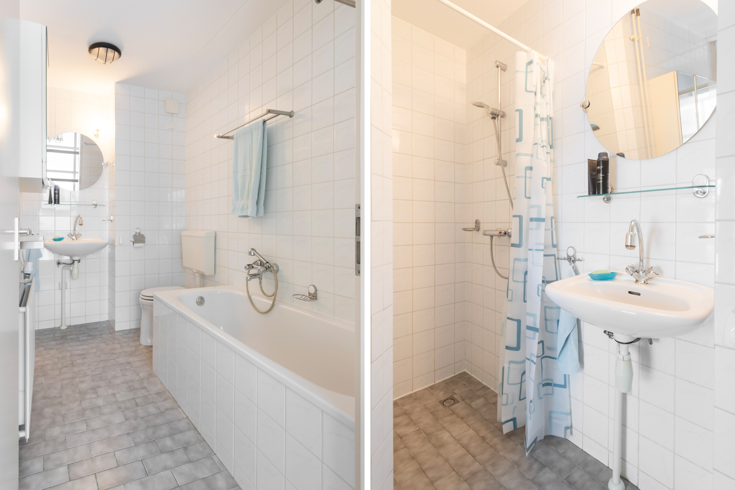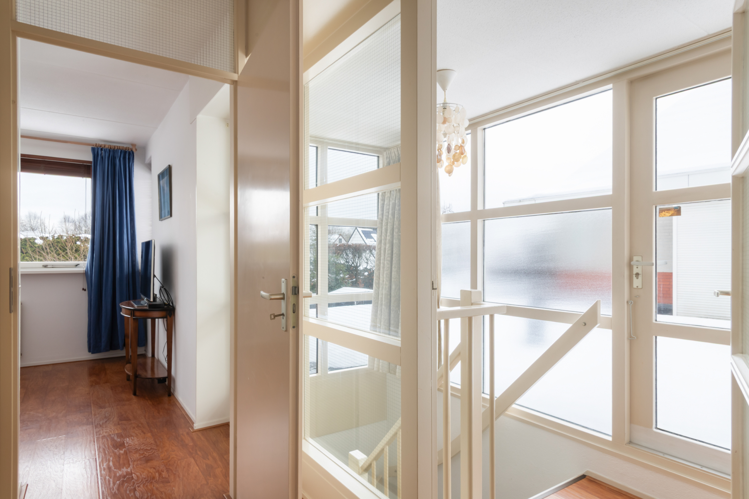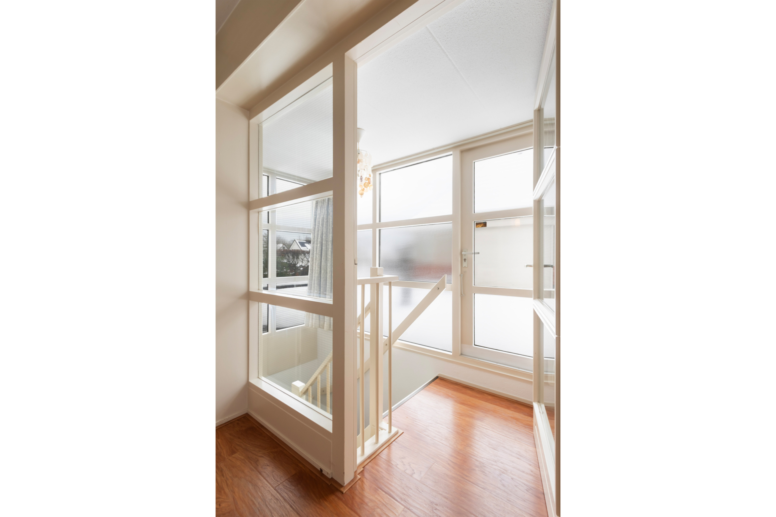 Eerste verdieping – via deze speciale trapopgang kom je uit op de overloop vanwaar je naar de twee slaapkamers en de badkamer kunt gaan. In de badkamer is er voldoende ruimte voor zowel een douche als een ligbad tezamen met een wastafel en een toilet. Door de vaste trap naar de tweede verdieping die in het midden van de woning zit, heb je in de slaapkamer aan de voorzijde ook nog een handige bergkast.
