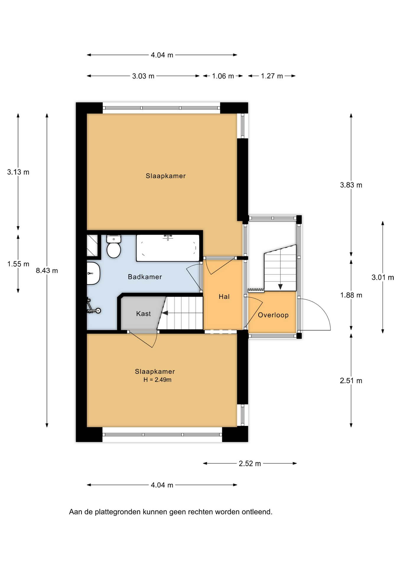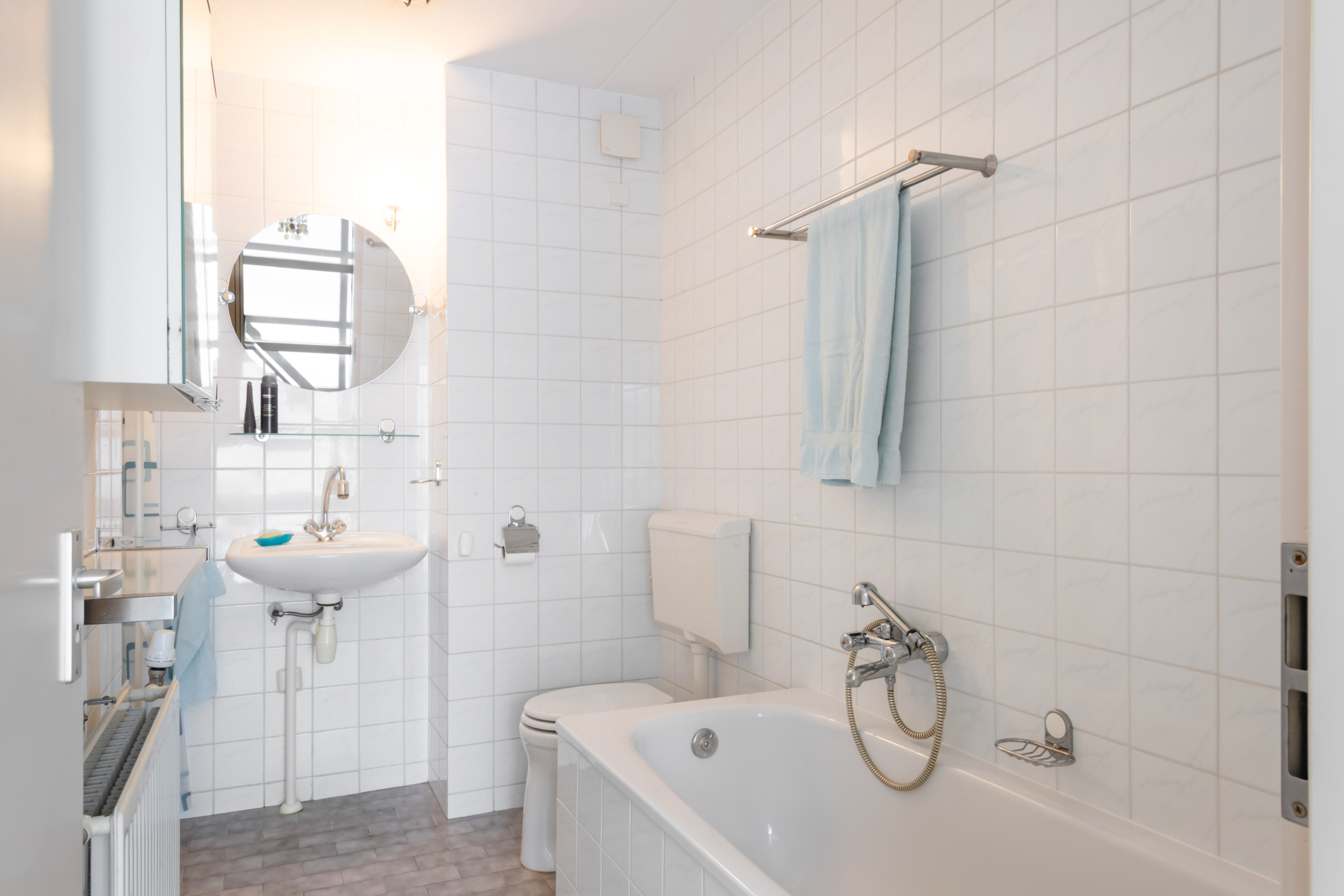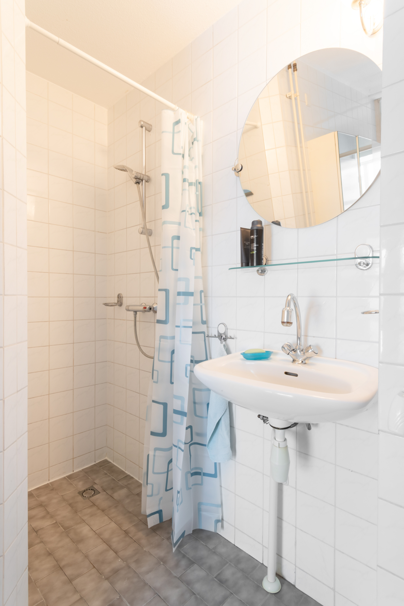 Eerste verdieping – via deze speciale trapopgang kom je uit op de overloop vanwaar je naar de twee slaapkamers en de badkamer kunt gaan. In de badkamer is er voldoende ruimte voor zowel een douche als een ligbad tezamen met een wastafel en een toilet. Door de vaste trap naar de tweede verdieping die in het midden van de woning zit, heb je in de slaapkamer aan de voorzijde ook nog een handige bergkast.