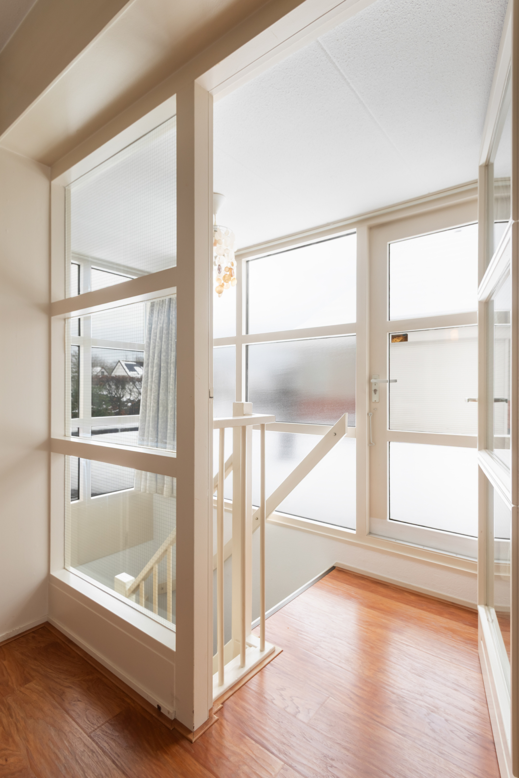 Door de bijzondere trapopgang met glazen wanden middenin de woonkamer valt er extra veel licht naar binnen in de woonkamer. Een uniek element in deze huizen!