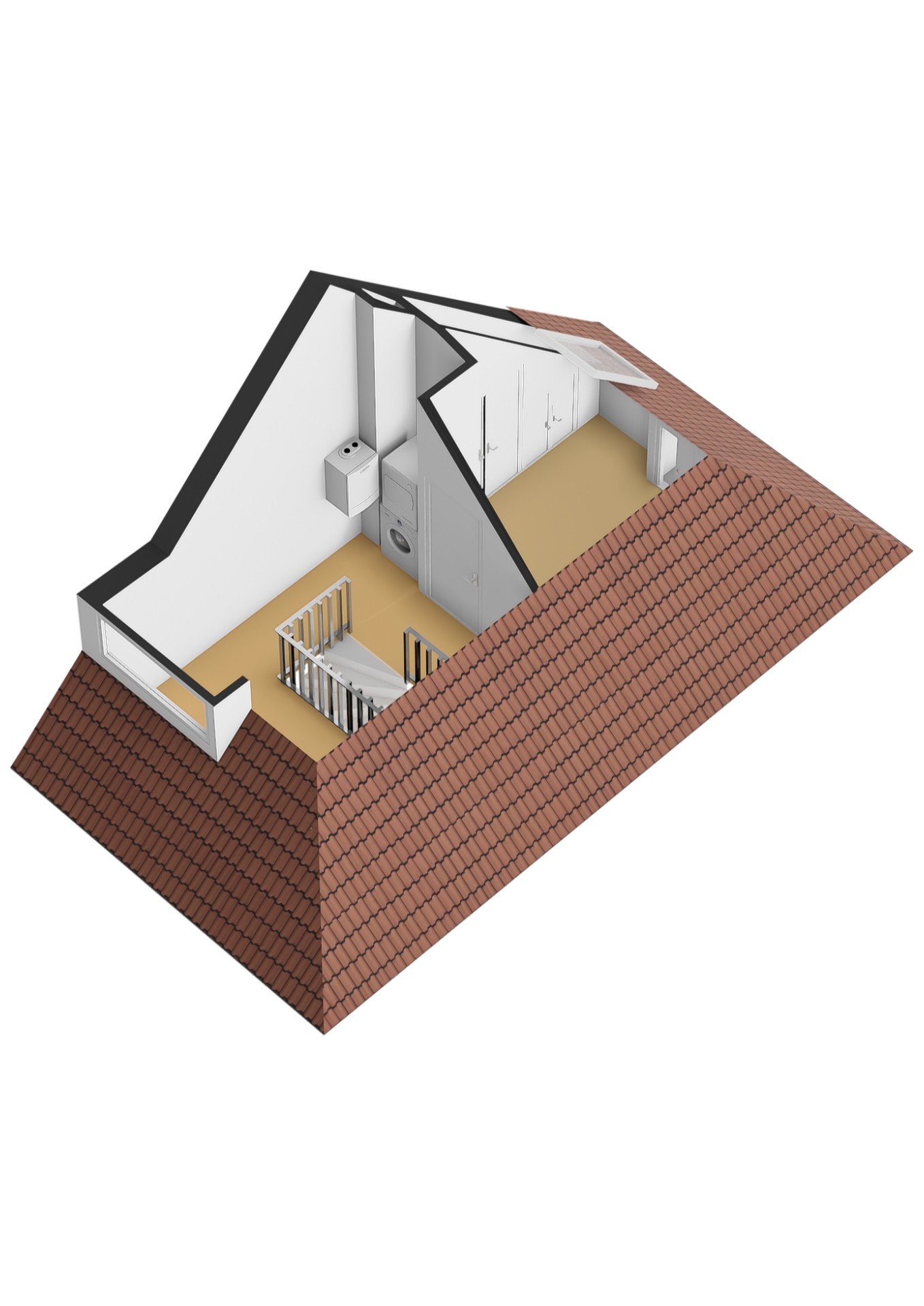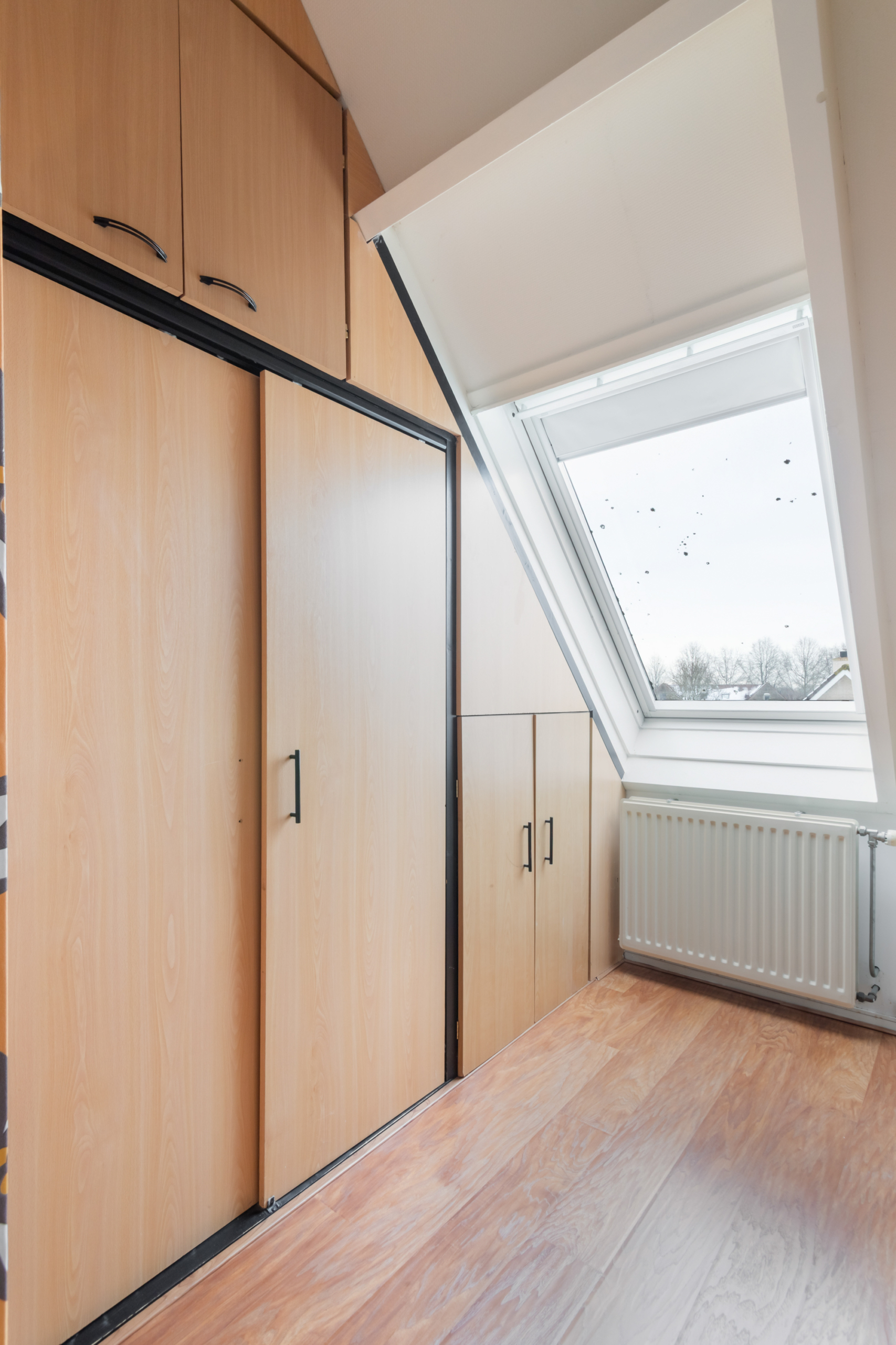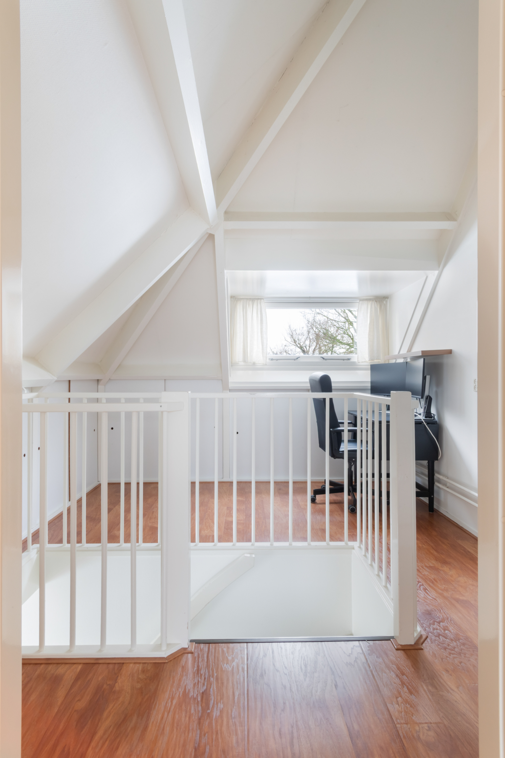 Tweede verdieping – overloop met plaats voor de wasmachine en droger alsmede de opstelling van de CV ketel. Vanaf de overloop is er toegang tot een derde slaapkamer met dakraam. Door de schuine kappen is er erg veel bergruimte achter de schotten.