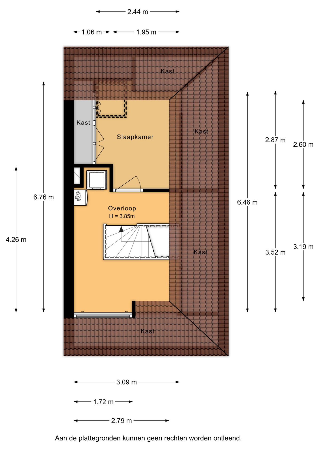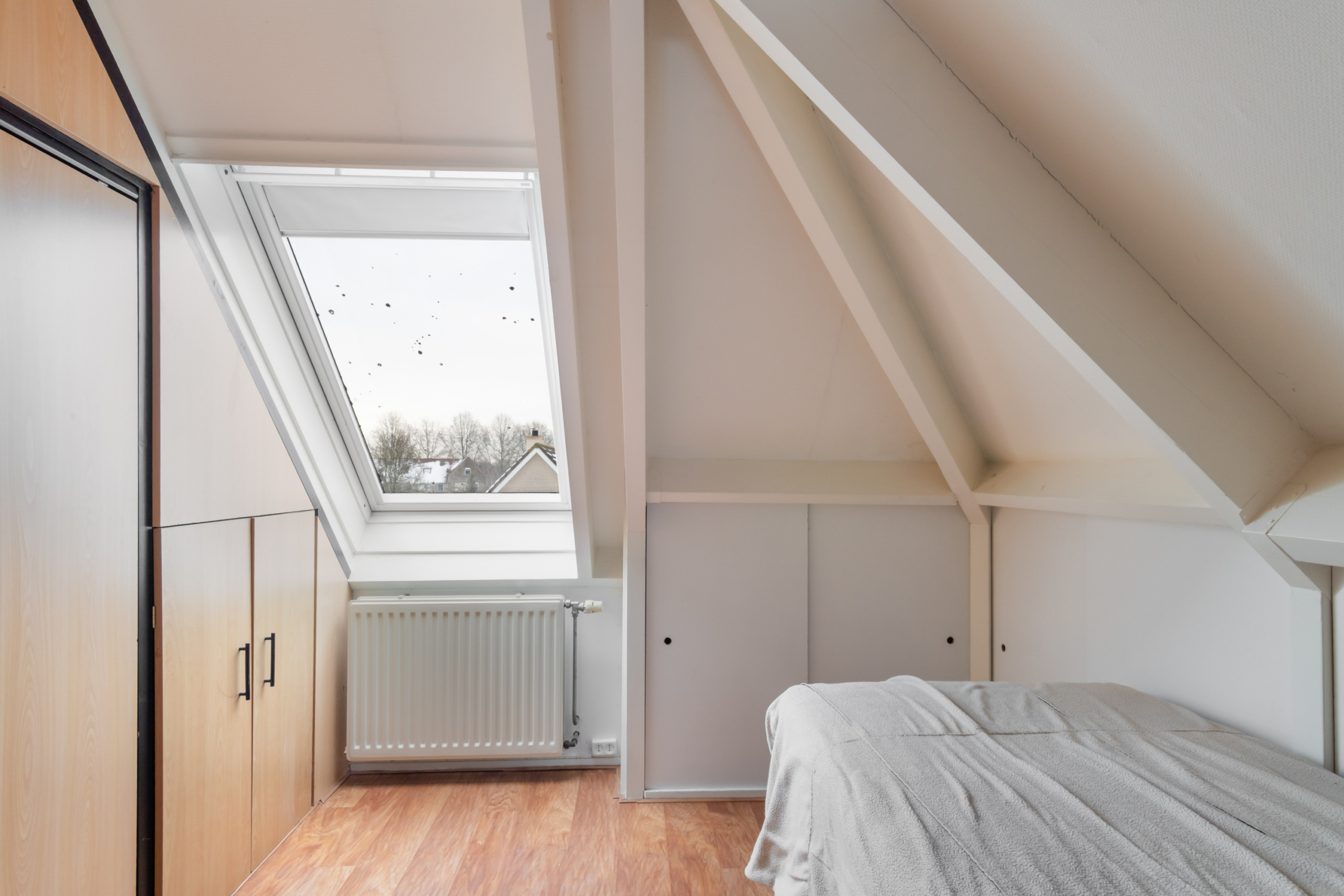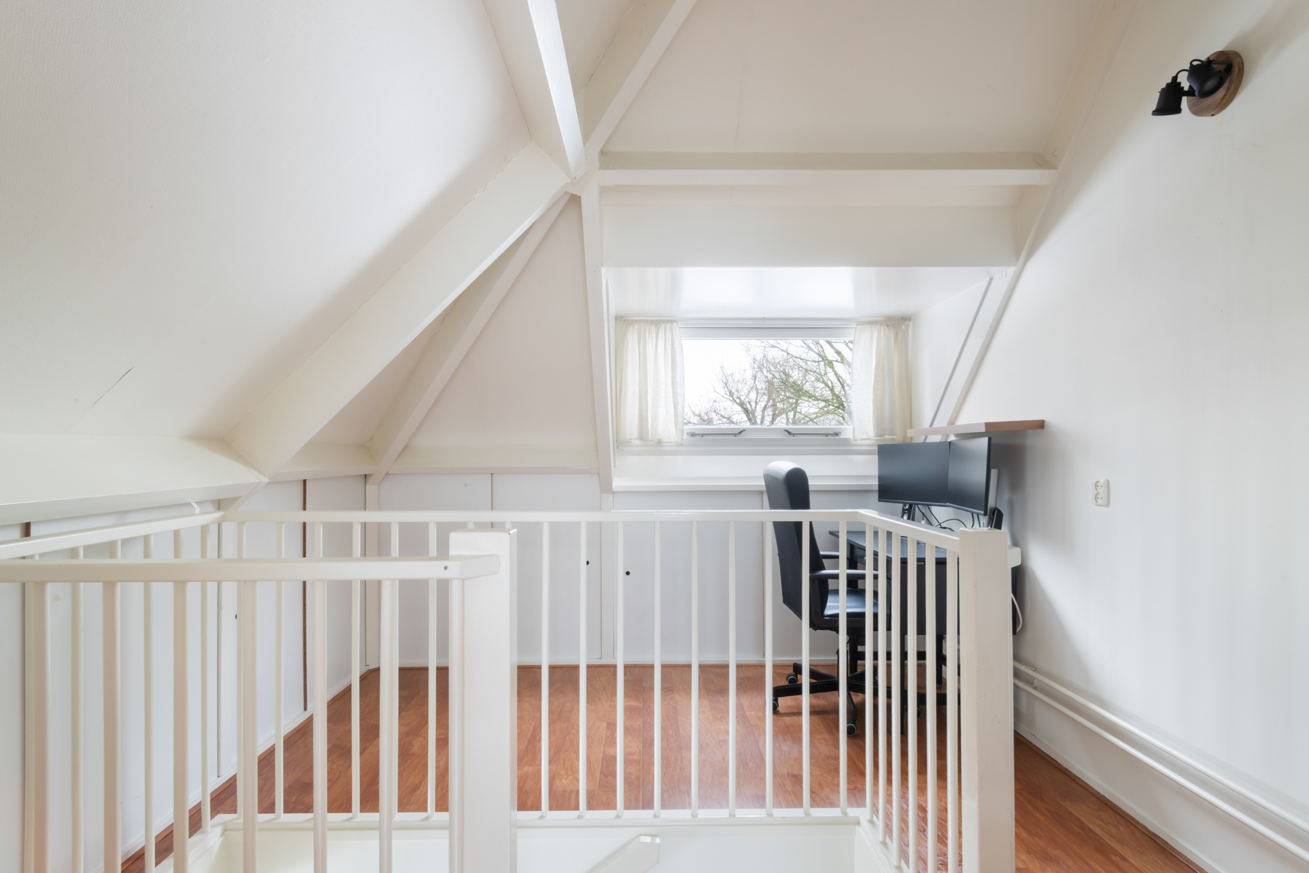 Tweede verdieping – overloop met plaats voor de wasmachine en droger alsmede de opstelling van de CV ketel. Vanaf de overloop is er toegang tot een derde slaapkamer met dakraam. Door de schuine kappen is er erg veel bergruimte achter de schotten.